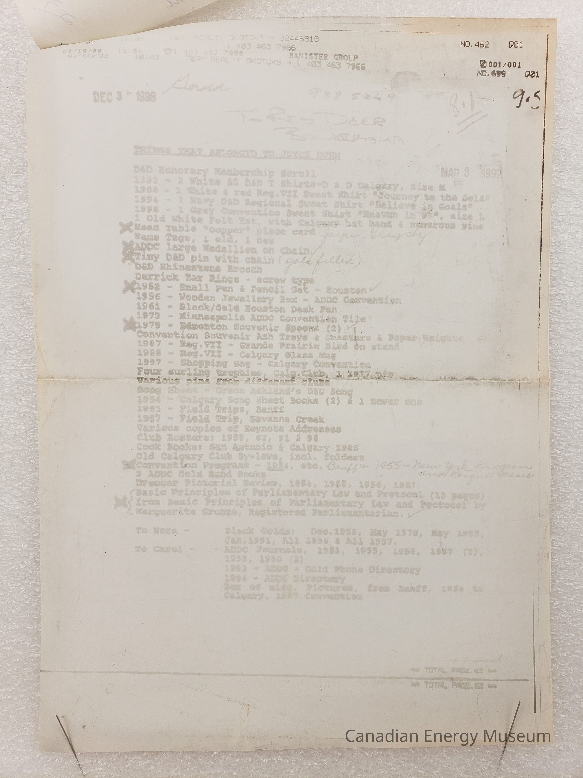 A photocopy of a document listing "THINGS THAT BELONGED TO JOYCE DUNN", accompanied by a small handwritten note on personalized notepaper. The document is duplicated through fax onto thermal paper. Its content is faded, though still mostly legible. It lists a series of items, many with connections to the Association of Desk and Derrick Clubs of America, including branded clothing, stationery, books, print documents and ephemera, and accessories. The photocopy has a variety of dates on it, ranging from 3 December 1998 to 4 March 1999. The faxed sheet is irregularly long, and has been folded over along the top. The note reads, "March 9/99; Gerald:; Enclosed are the items from the Estate of L./ Joyce [Guigsby?] Dunn as per your request via [Jan?] - Mar 3./99/; Betty Wilson", with the personalized notepaper reading "from the desk of BETTY WILSON" printed in the bottom-left corner. The three items are stapled together in the top-left corner.