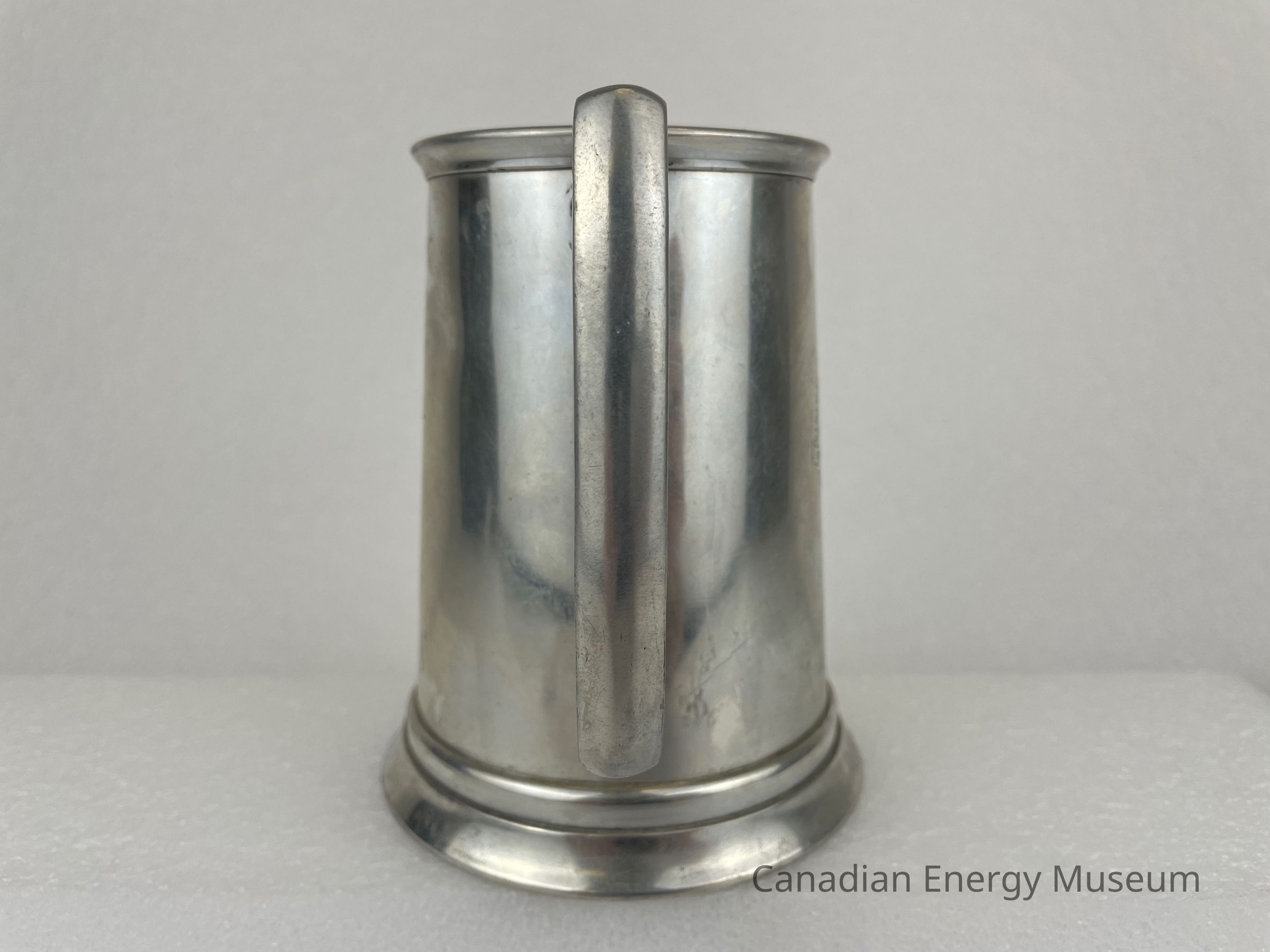 Pewter beer tankard with handle and glass bottom. The front of the tankard features an etched design with a circular border. The centre circle displays a sun with rays over a field of wheat sheaves and an oil derrick. Text along the outside of the inner circle reads, "CENTRAL CANADA OIL SCOUTS ASSOCIATION". A banner spreads across the bottom of the circle with text reading, "HOW DEEP ARE YOU?" The back side of the tankard features etched text that reads, "J.D. McNeil 1956". The bottom of the tankard is a glass bottom, surrounded by a pewter rim. On the rim is text that reads "BIRKS" and "MADE IN ENGLAND 2134".Collection