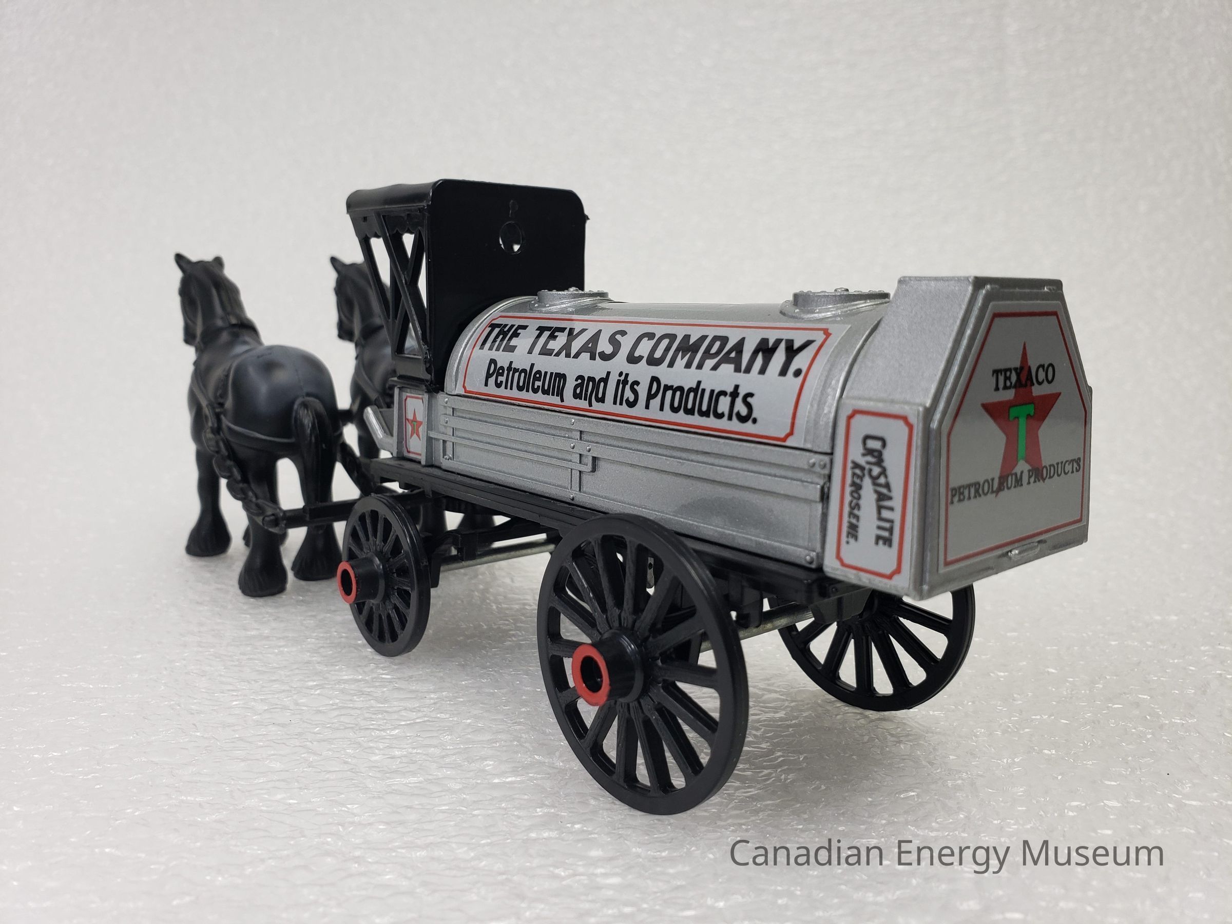 Old Description (Kelsey Dalrymple, 2/18/2020): Still bank in the shape of a replica horse-drawn oil wagon. Silver truck laveled The Texas Company / Petroleum and its Products, with an advertisement for Crystalite Kerosene. Texaco logo on the side and rear. Two black horses with grey dapple pulling th.Collection
