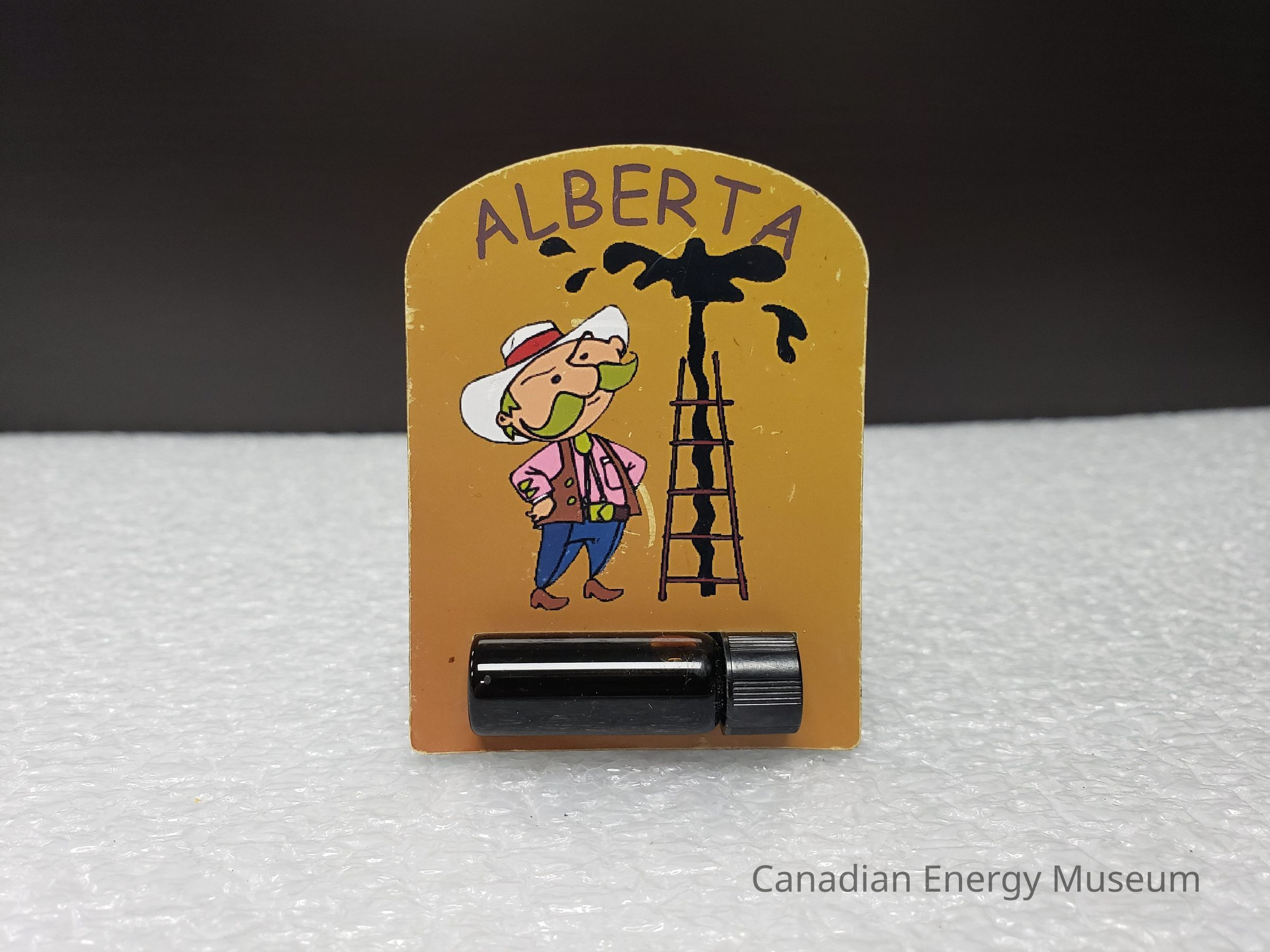 Arch-shaped magnet, reading "ALBERTA", with an illustration, and sample phial of oil.