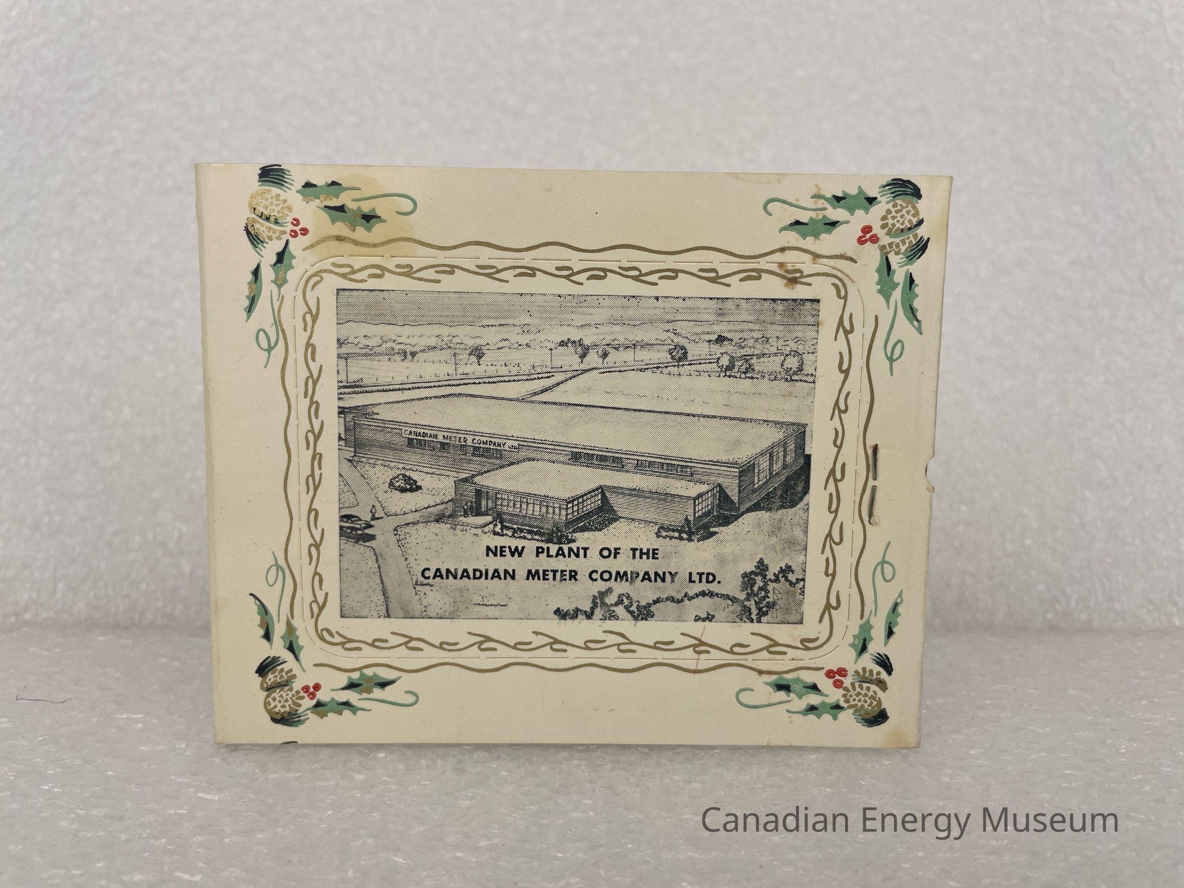 A 10-strike matchbook, branded to the Canadian Meter Company. The outside front is white with a square, black and white image of a log cabin in snow. Red decorations border the picture, and gold, green and red illustrations of pinecones and holly decorate the top left corner of the picture. In red and gold decorative text reads, "Season's Greetings". The back of the matchbook has a large black and white image of an industrial building with black text, "NEW PLANT OF THE CANADIAN METER COMPANY LTD." Two layers of gold wavy lines border the picture, and green, gold, and red illustrations of pine cones and holly decorate each corner.