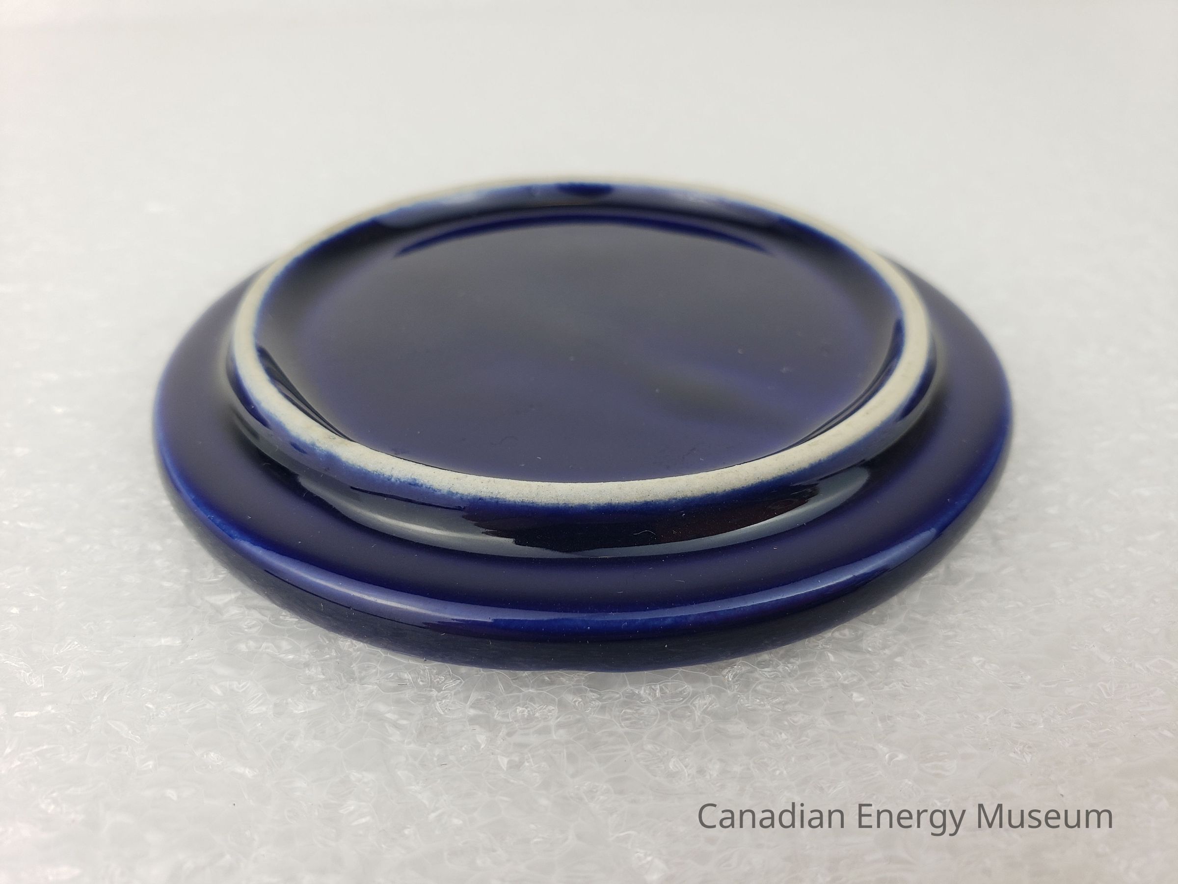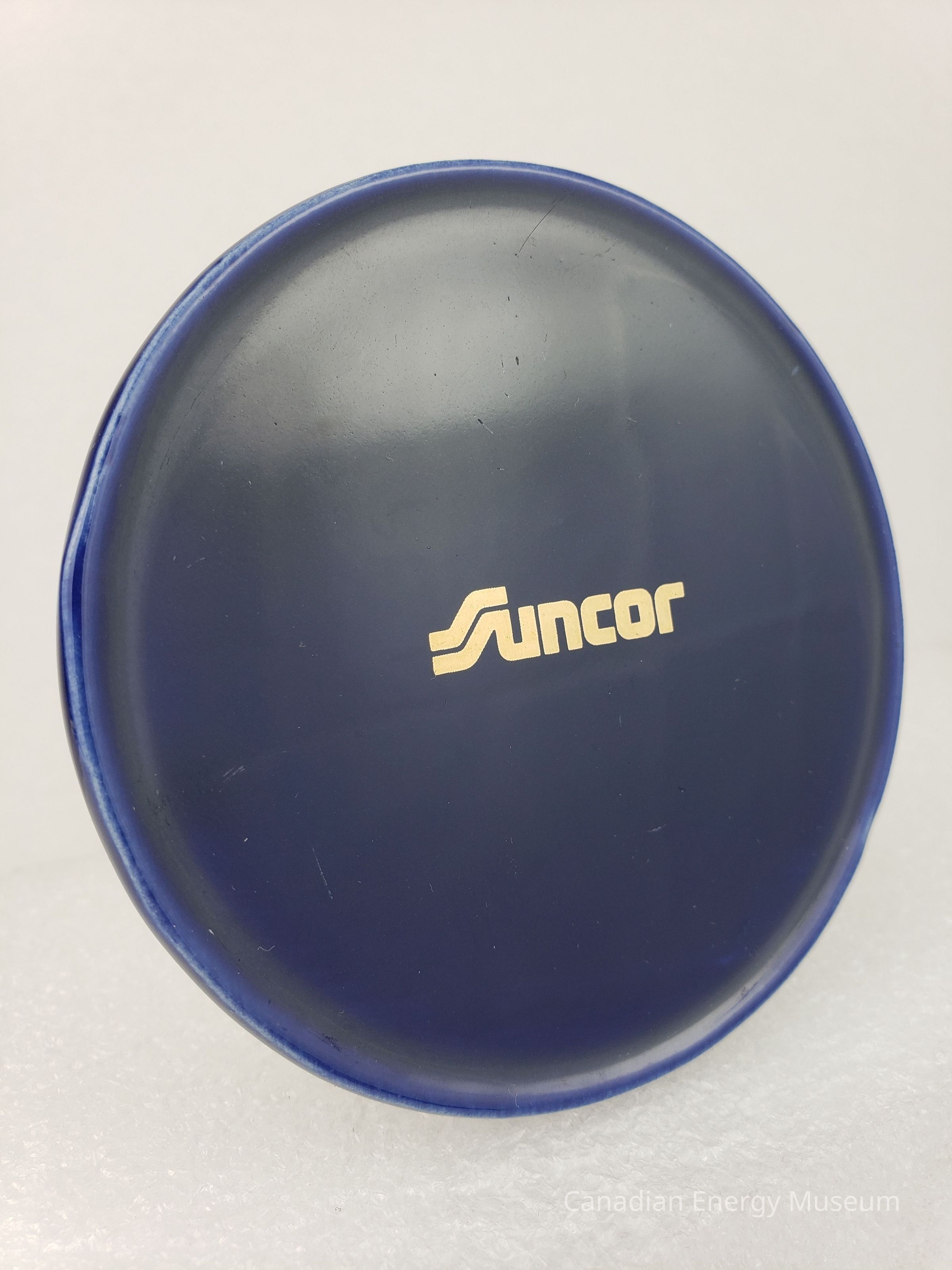Description: A round ceramic coaster, with a slight lip and shallow base. The base is a glazed deep blue with "Suncor" printed in gold in the centre.