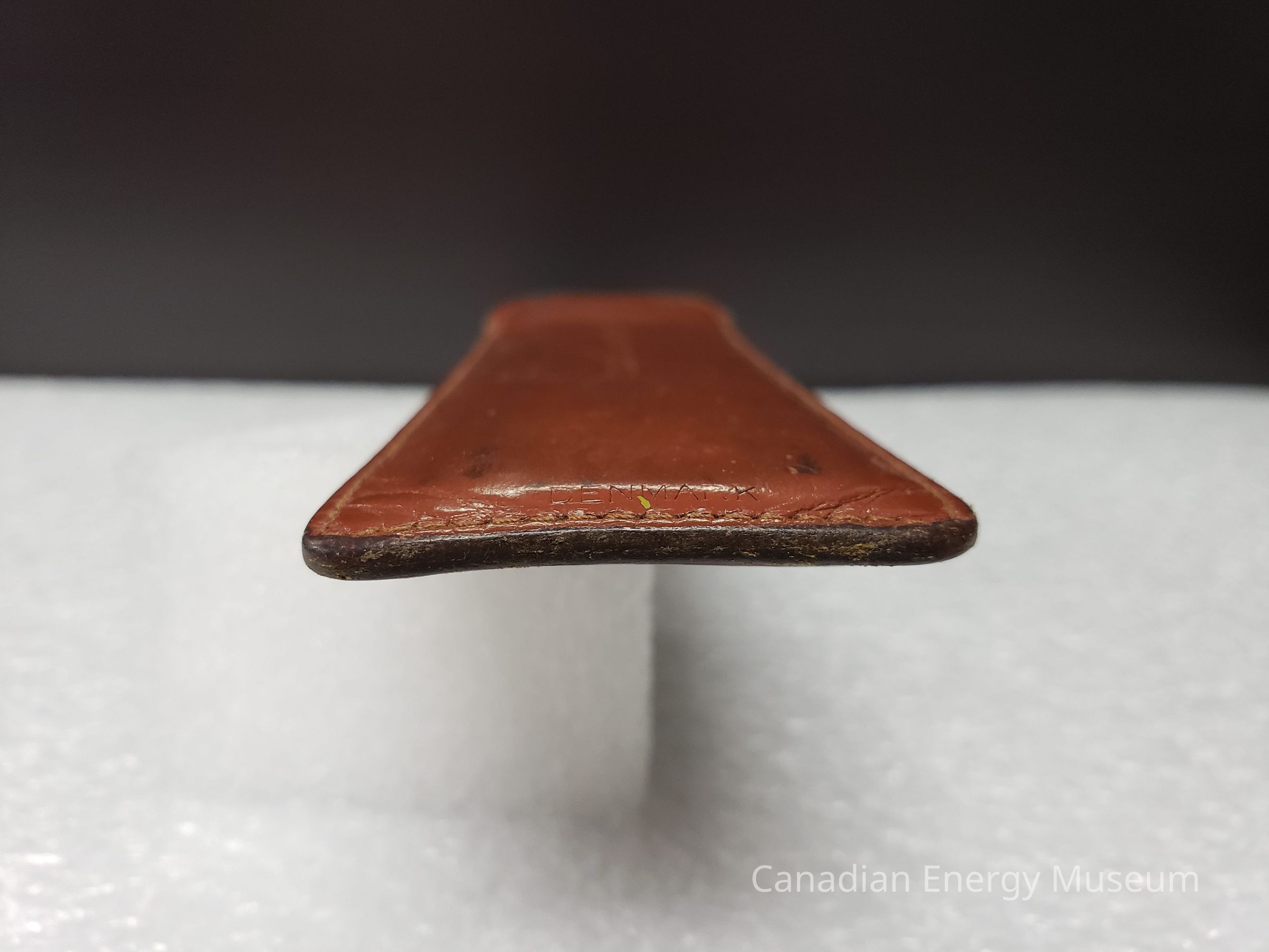 Leather Cover: A brown-coloured leather case, custom-made for the slide rule, and has been customized with the gold text "[Logo: "UNION CARBIDE"] CHEMICALS and PLASTICS" in the middle of one side. The opening has no closure flap. Leather is stitched together.Collection