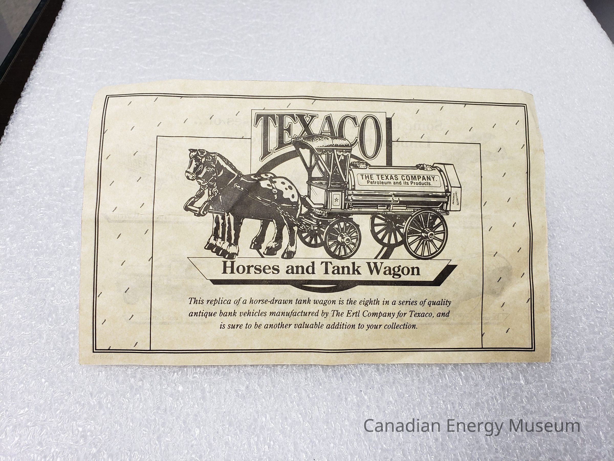 Side A: Large image of a horse-drawn tank wagon, with text: "This replica of a horse-drawn tank wagon is the eighth in a series of quality antique bank vehicles manufactured by The Ertl Company for Texaco, and is sure to be another valuable addition to your collection".