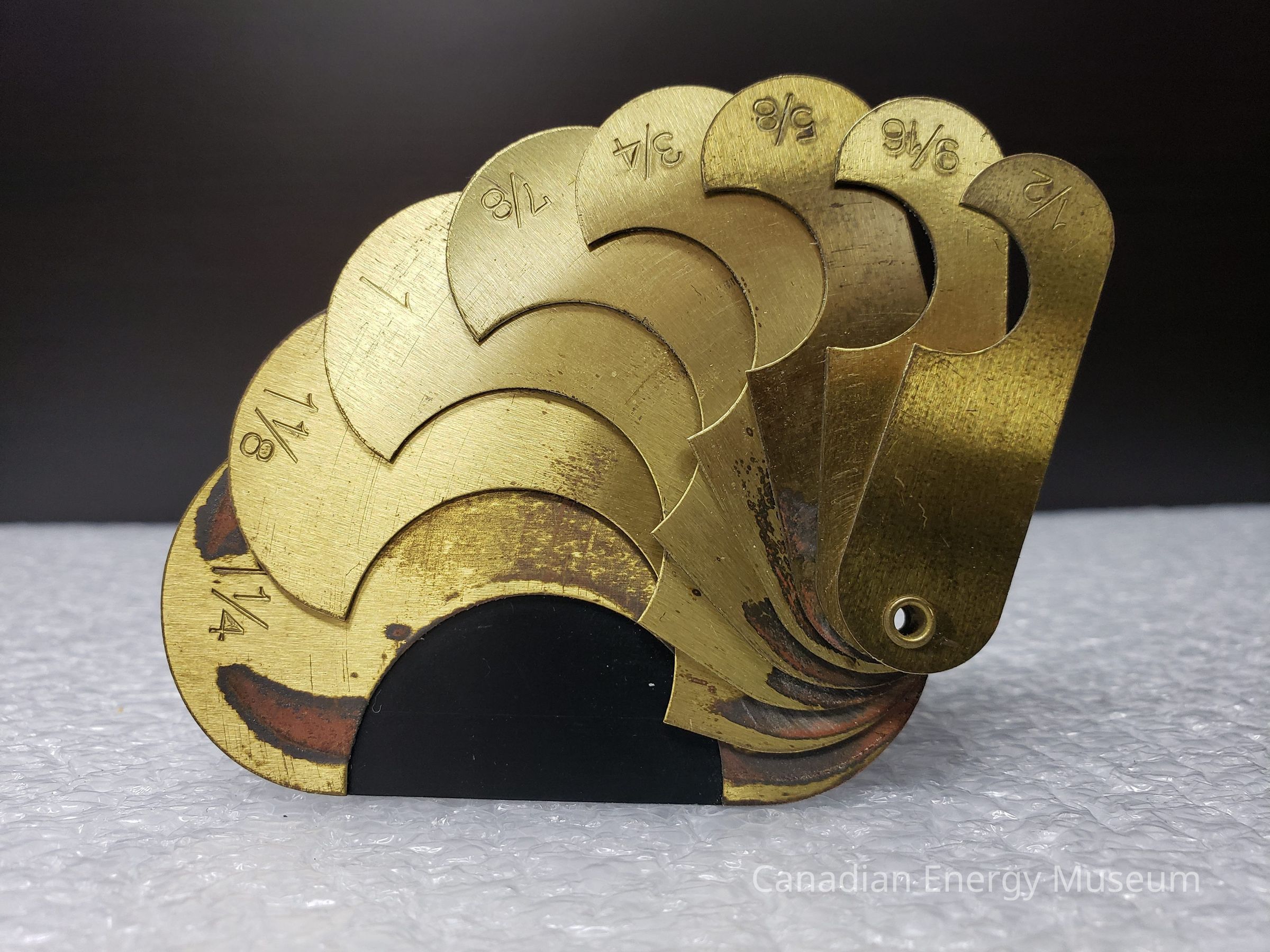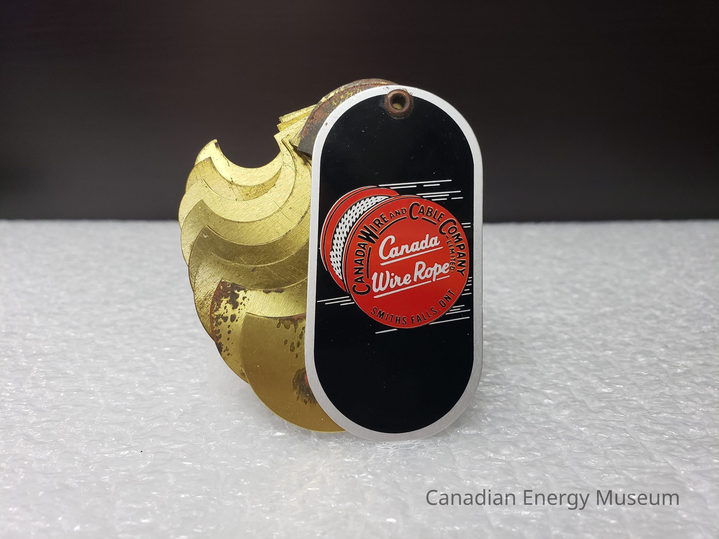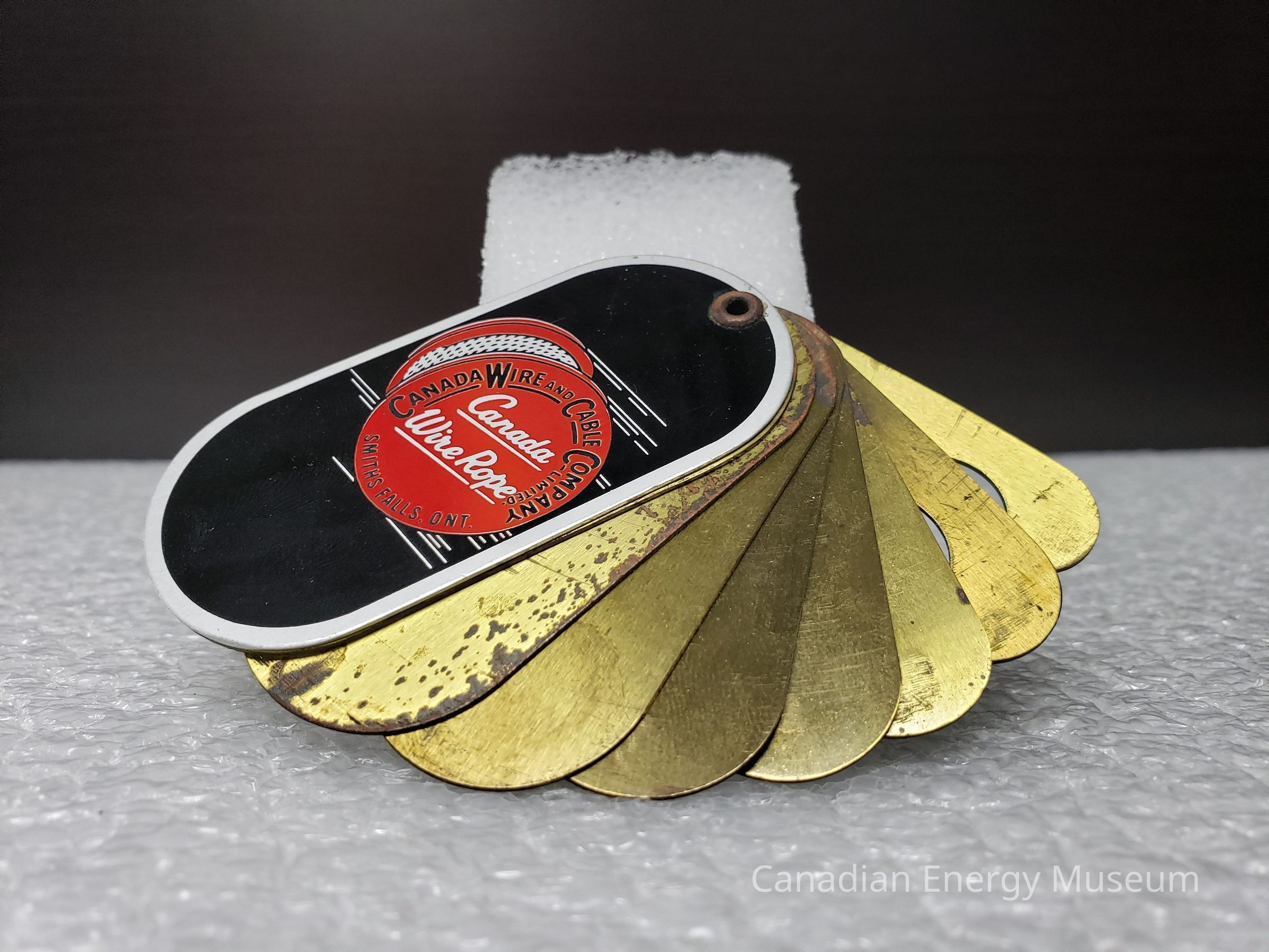 Appearance: A wire rope and sheave gauge in two types of metal, believed to be brass and steel, and with 9 tabs secured at the top with an eyelet. The tabs are in a stadium shape, of increasing size. The wire rope cut-outs likewise increase in size. The outer side of the largest tab bears the following design: black background with a silver-coloured exposed metal border around the tab's edge, and the brands logo on an image of a wire spool in the centre of the tab. The spool is in red, with detailing in black and exposed metal, motion lines are dashed around the spool, and on the surface of the spool illustration reads "CANADA WIRE AND CABLE COMPANY LIMITED (black and silver, curved to top of circle); CANADA WIRE ROPE (silver, script font in centre, slightly angled); SMITH FALLS, ONT. (black and silver, curved to bottom of circle". Of the tabs, 8 bears the corresponding measurements engraved into the metal, in inches.