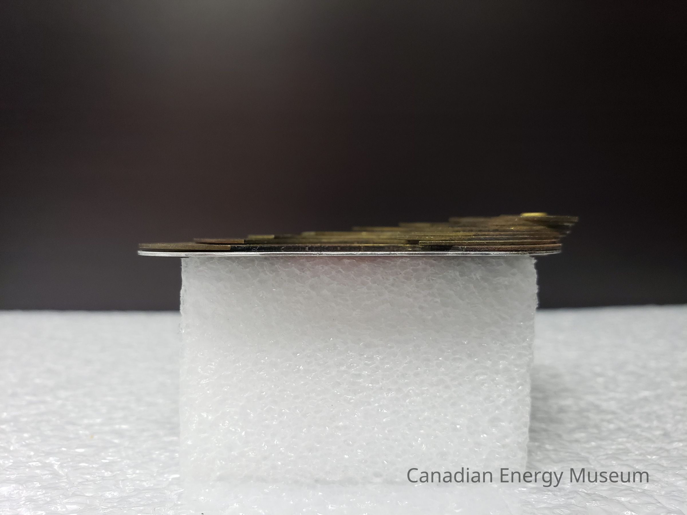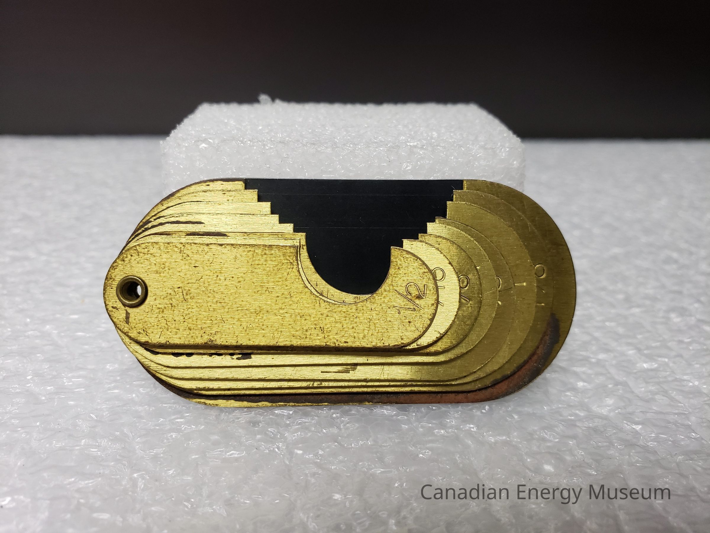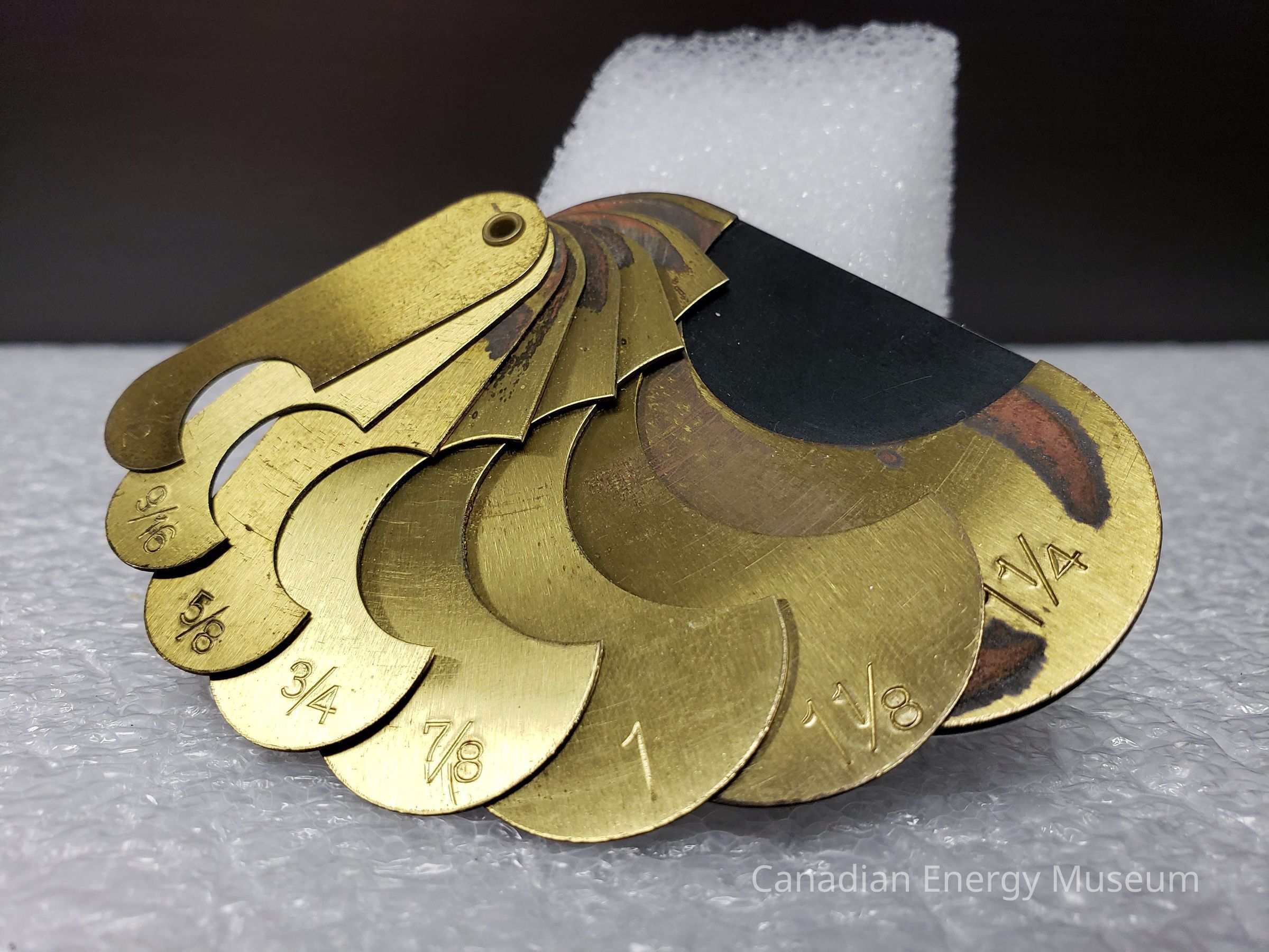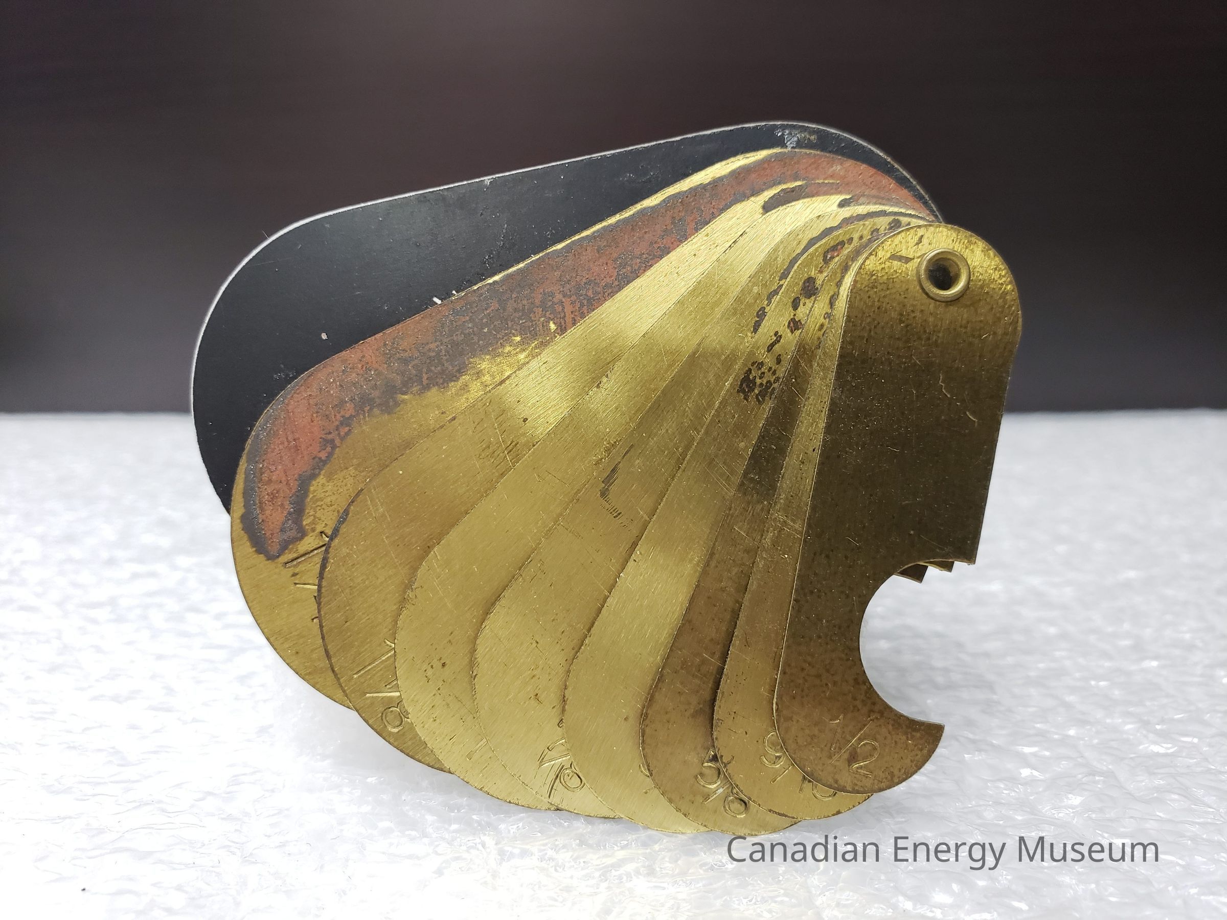 Appearance: A wire rope and sheave gauge in two types of metal, believed to be brass and steel, and with 9 tabs secured at the top with an eyelet. The tabs are in a stadium shape, of increasing size. The wire rope cut-outs likewise increase in size. The outer side of the largest tab bears the following design: black background with a silver-coloured exposed metal border around the tab's edge, and the brands logo on an image of a wire spool in the centre of the tab. The spool is in red, with detailing in black and exposed metal, motion lines are dashed around the spool, and on the surface of the spool illustration reads "CANADA WIRE AND CABLE COMPANY LIMITED (black and silver, curved to top of circle); CANADA WIRE ROPE (silver, script font in centre, slightly angled); SMITH FALLS, ONT. (black and silver, curved to bottom of circle". Of the tabs, 8 bears the corresponding measurements engraved into the metal, in inches.