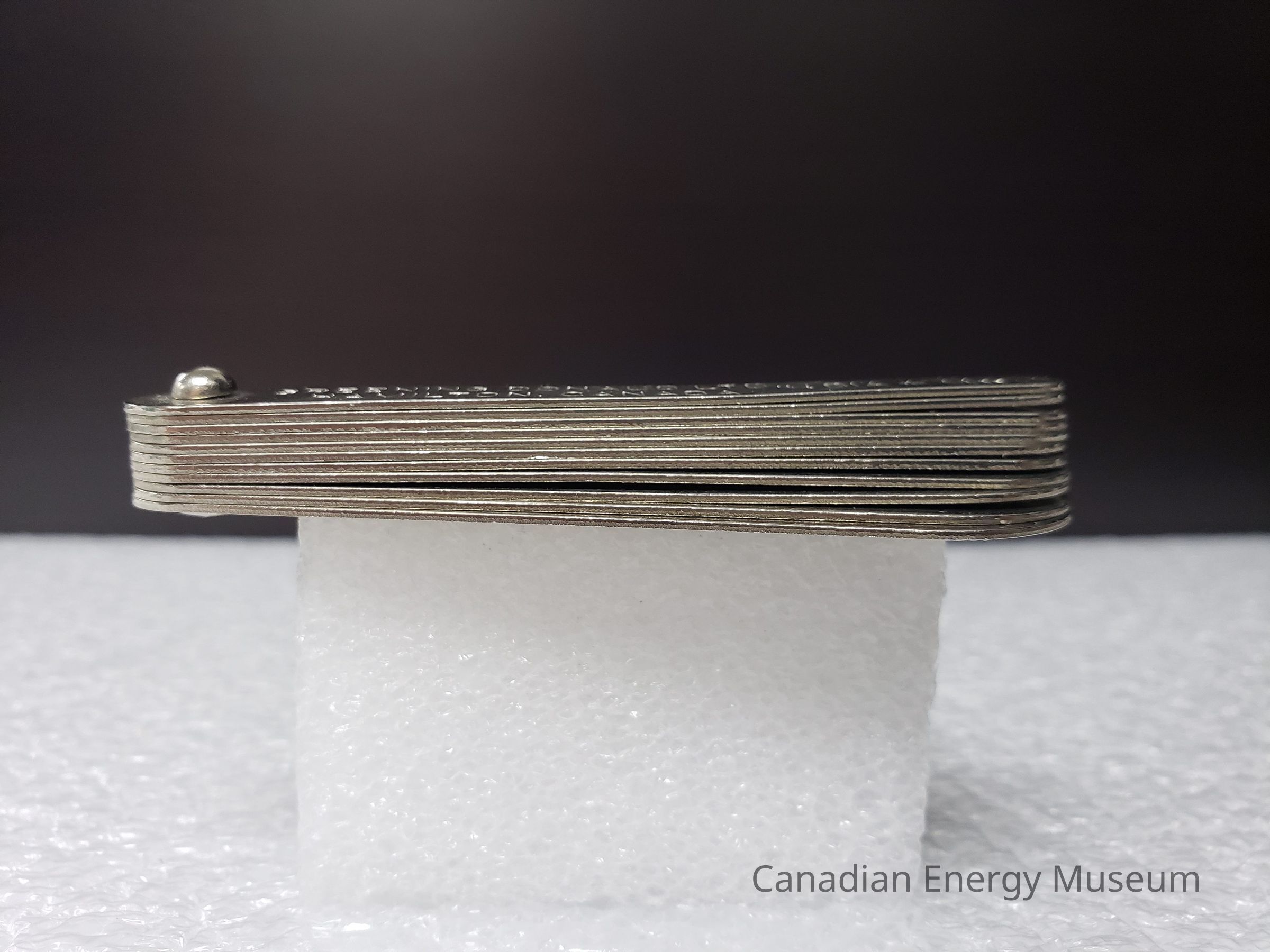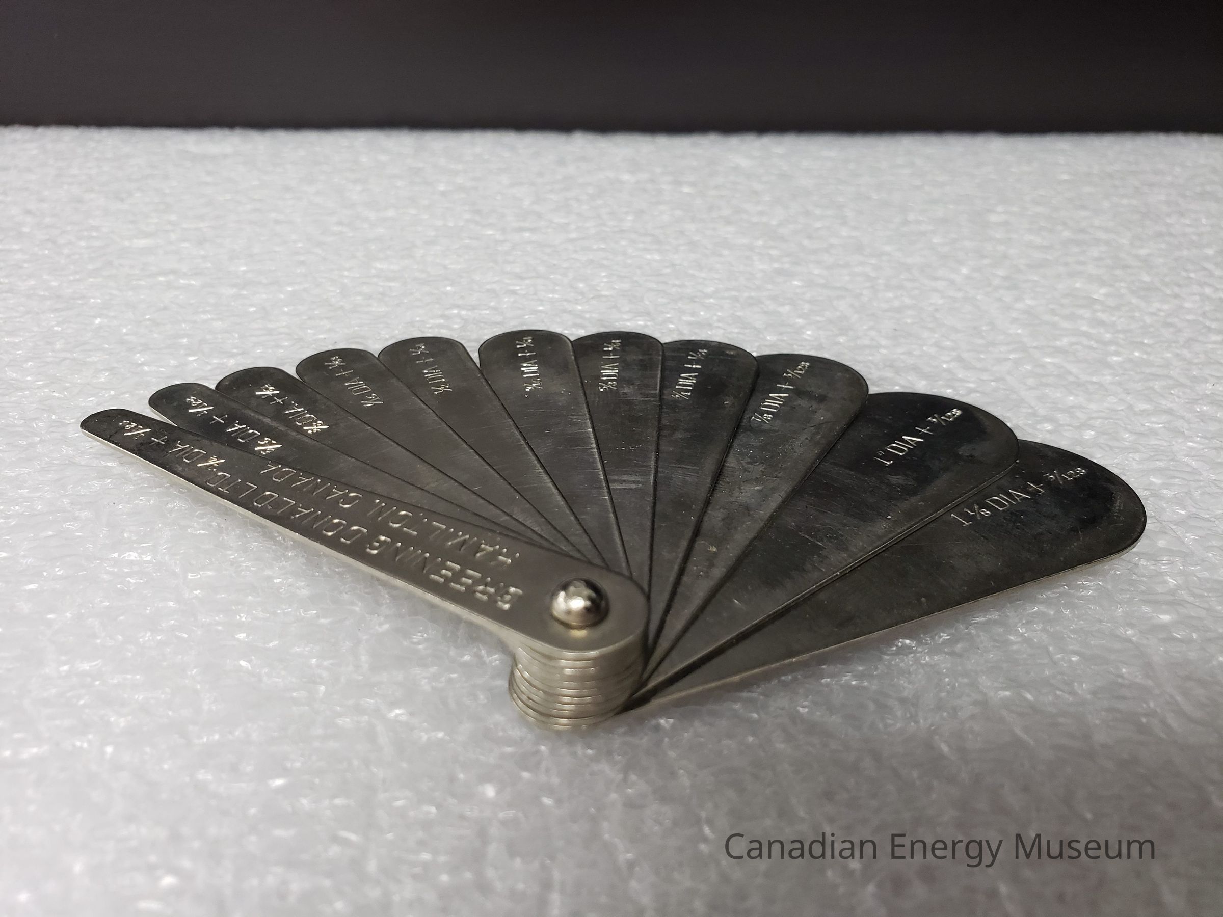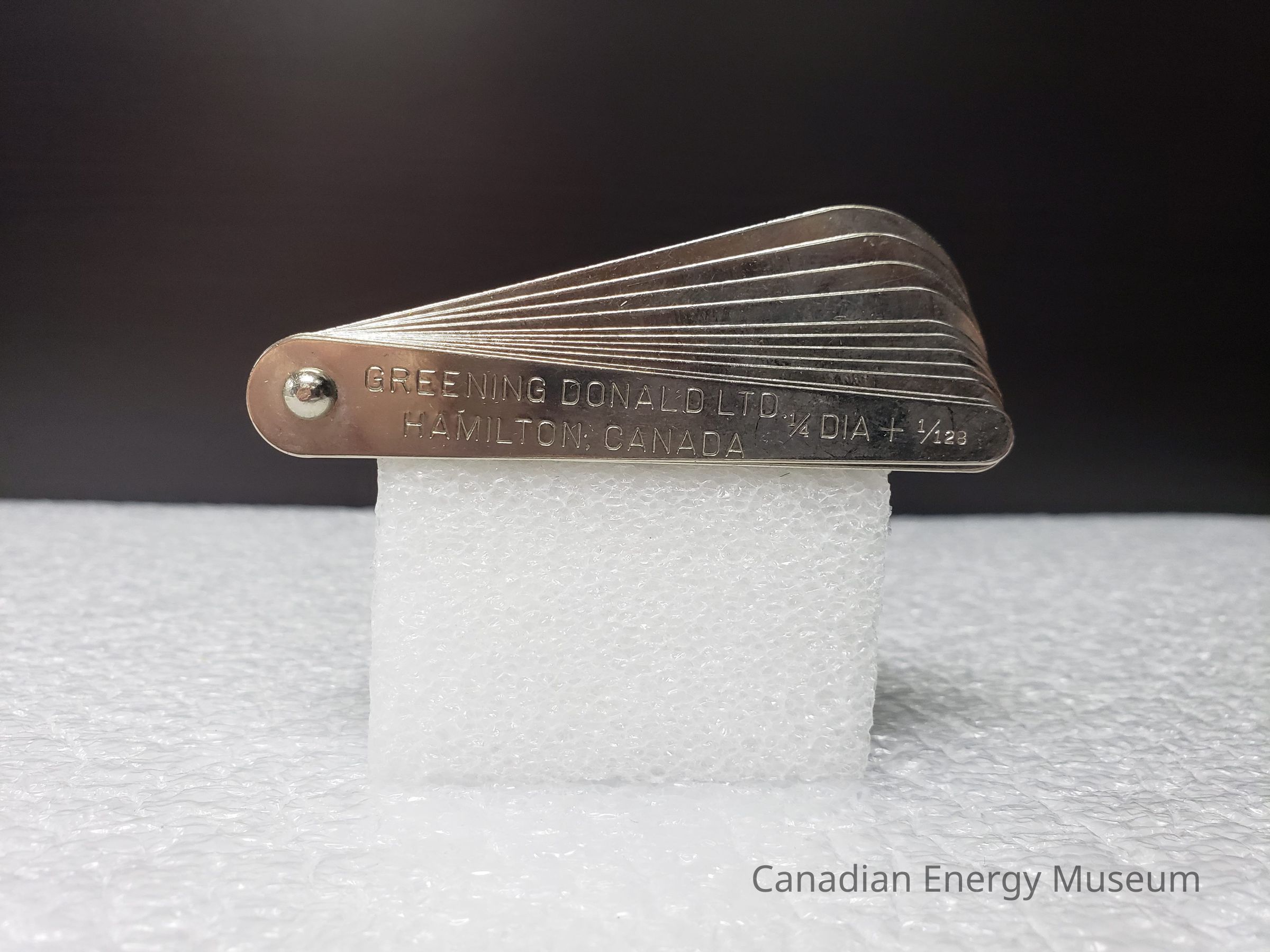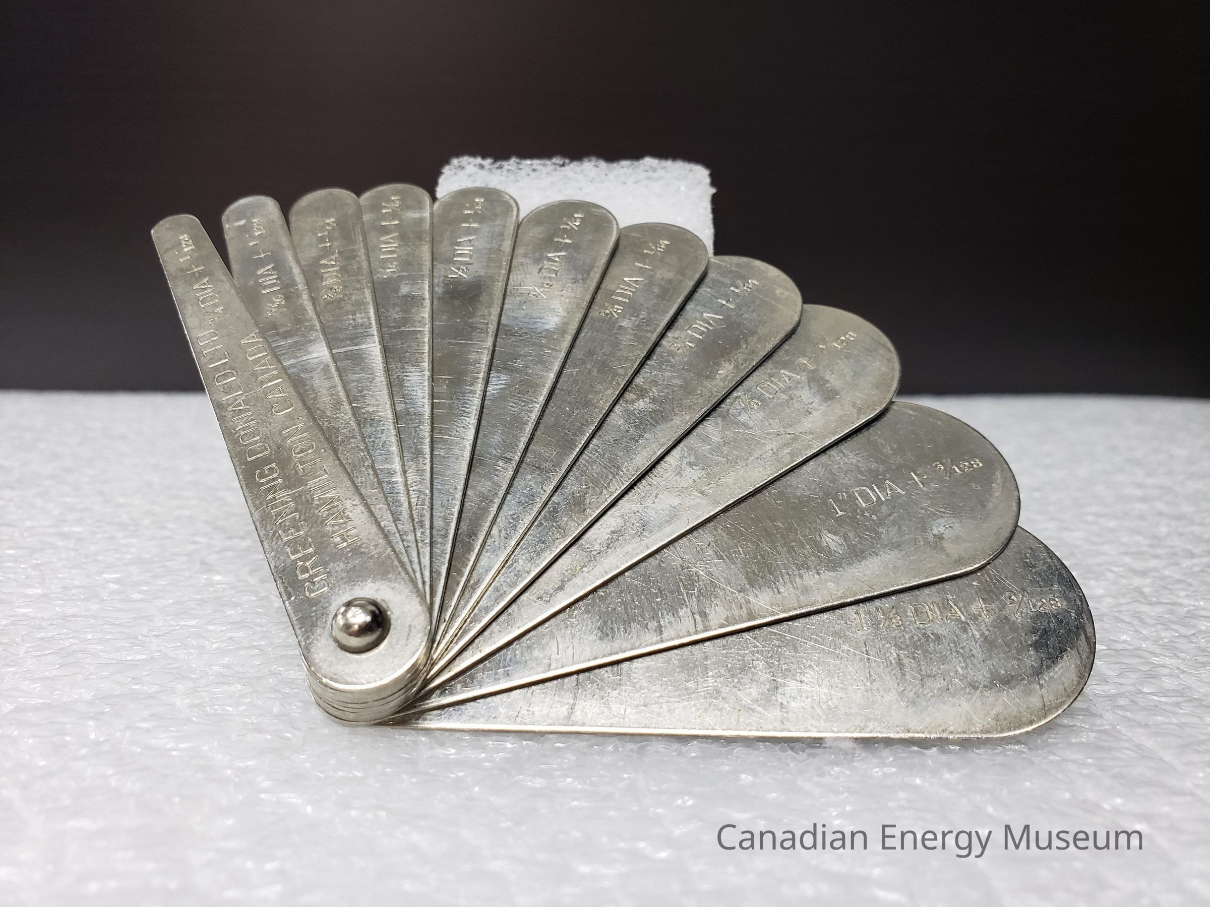 Appearance: A sheave gauge made from metal (likely steel), with 11 tabs connected with a small domed metal bolt. The tabs transition in shape from an irregular stadium-shaped (narrow rounded at the tip and more bulbous at the bolted end) to a narrow drop-shape. On the first tab (narrowest) is engraved the text "GREENING DONALD LTD.; HAMILTON, CANADA". Each of the tabs also bears the corresponding measurements engraved, in inches.