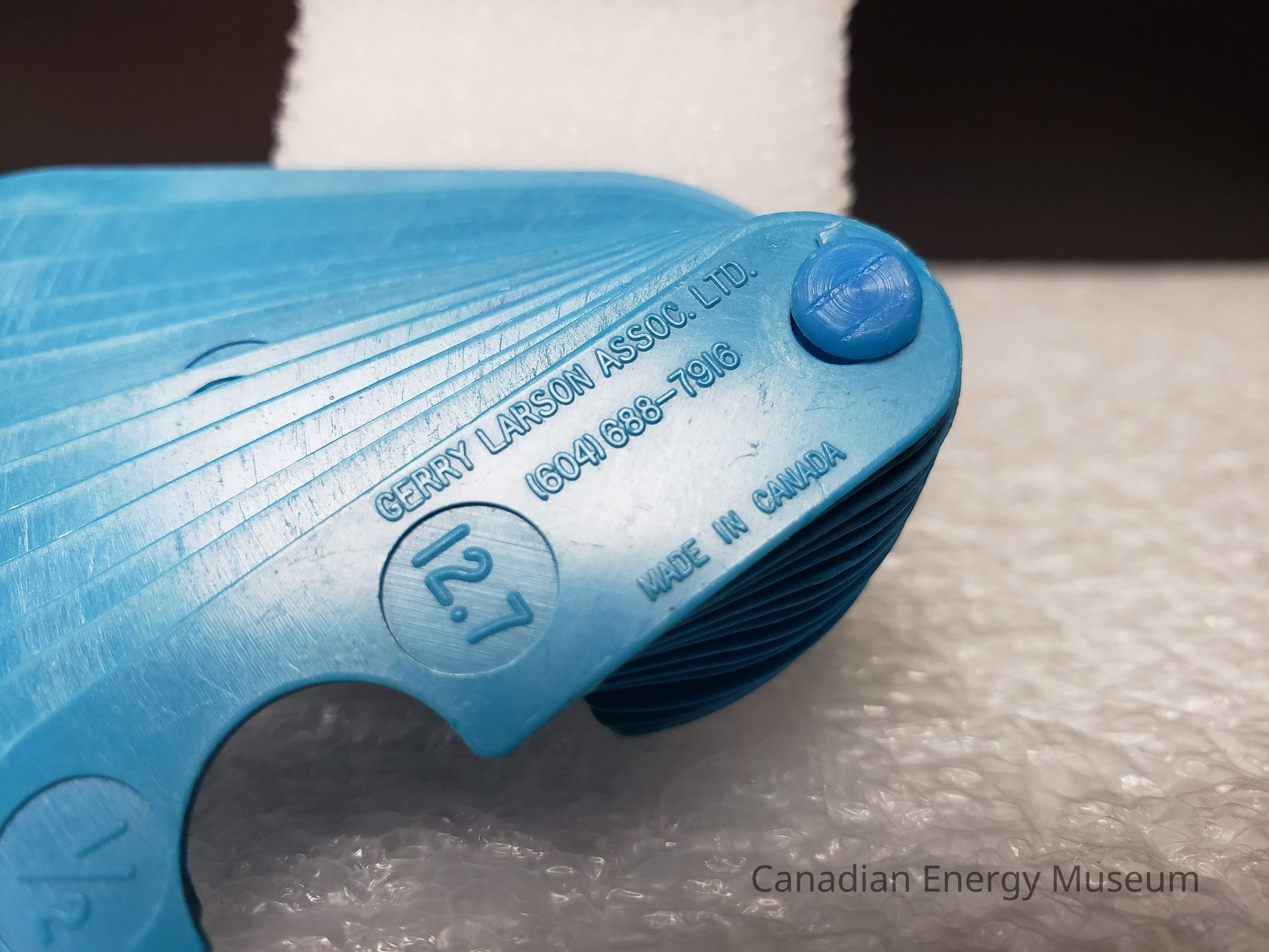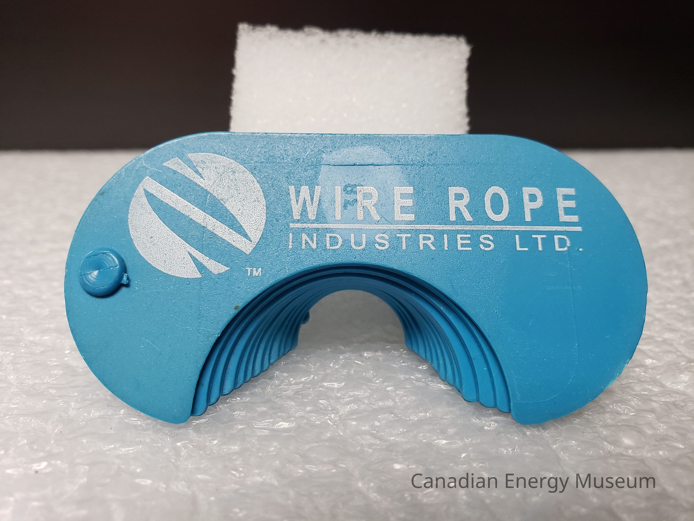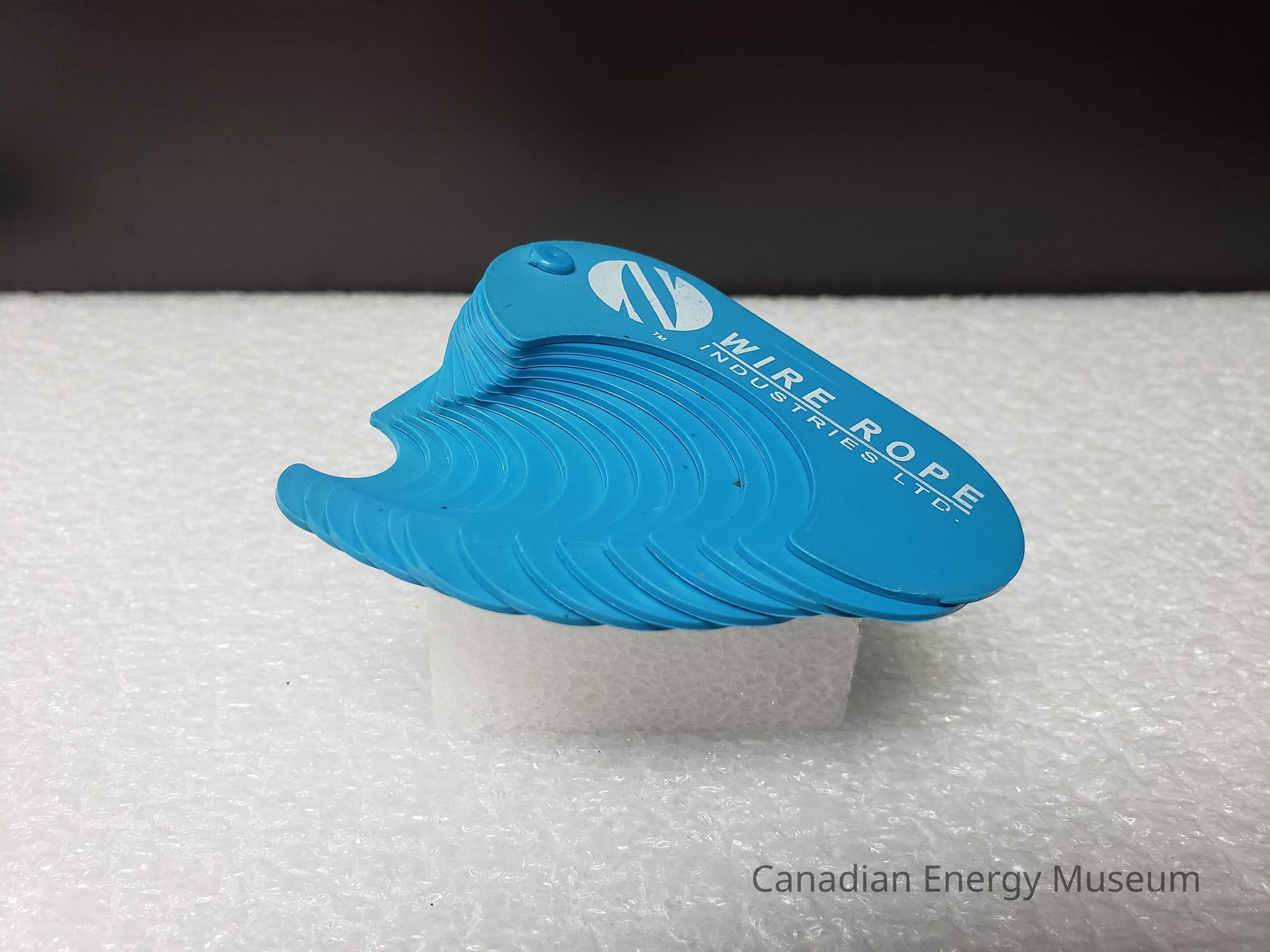 Appearance: A wire rope and sheave gauge in blue plastic, with 14 tabs connected with a plastic bolt to create a fan configuration. The tabs are in a stadium shape, of increasing size. The wire rope cut-outs likewise increase in size. On the outer side of the largest tab is the text logo for "WIRE ROPE; INDUSTRIES LTD." in white print (white circle with stylised wire coil in blue; "WIRE ROPE" and "INDUSTRIES LTD." are separated by a horizontal line). Each of the other 14 tabs bears the corresponding measurements molded into the plastic, in both inches and millimetres.