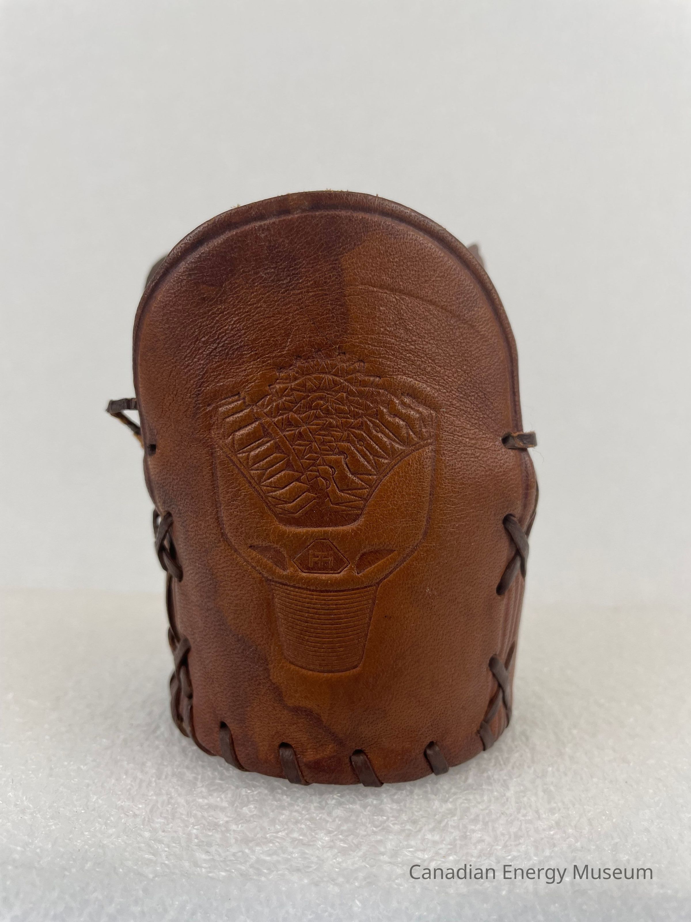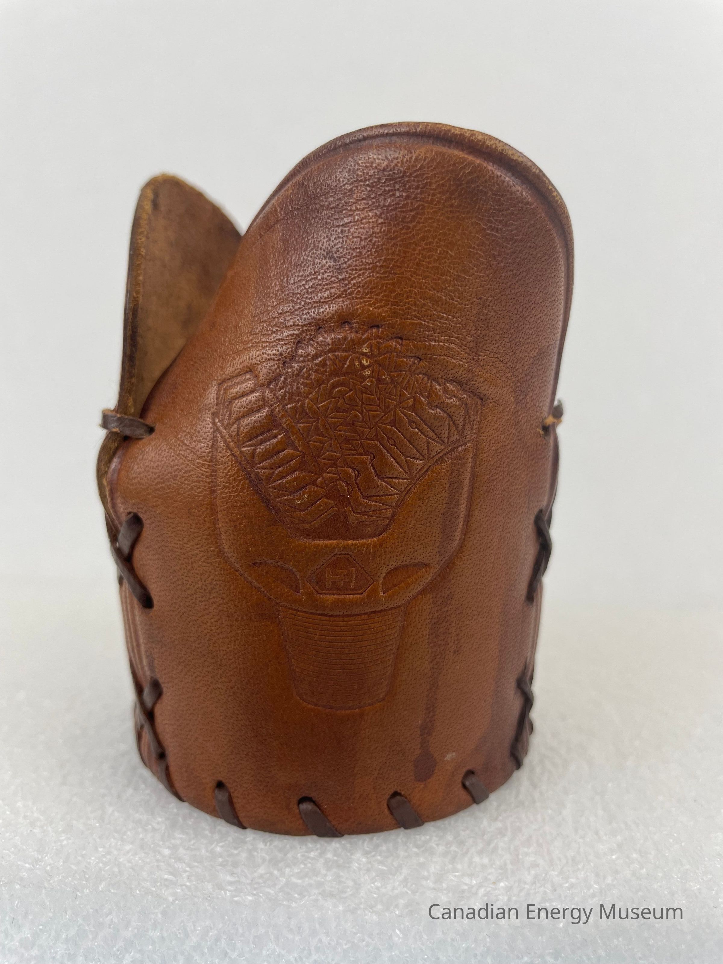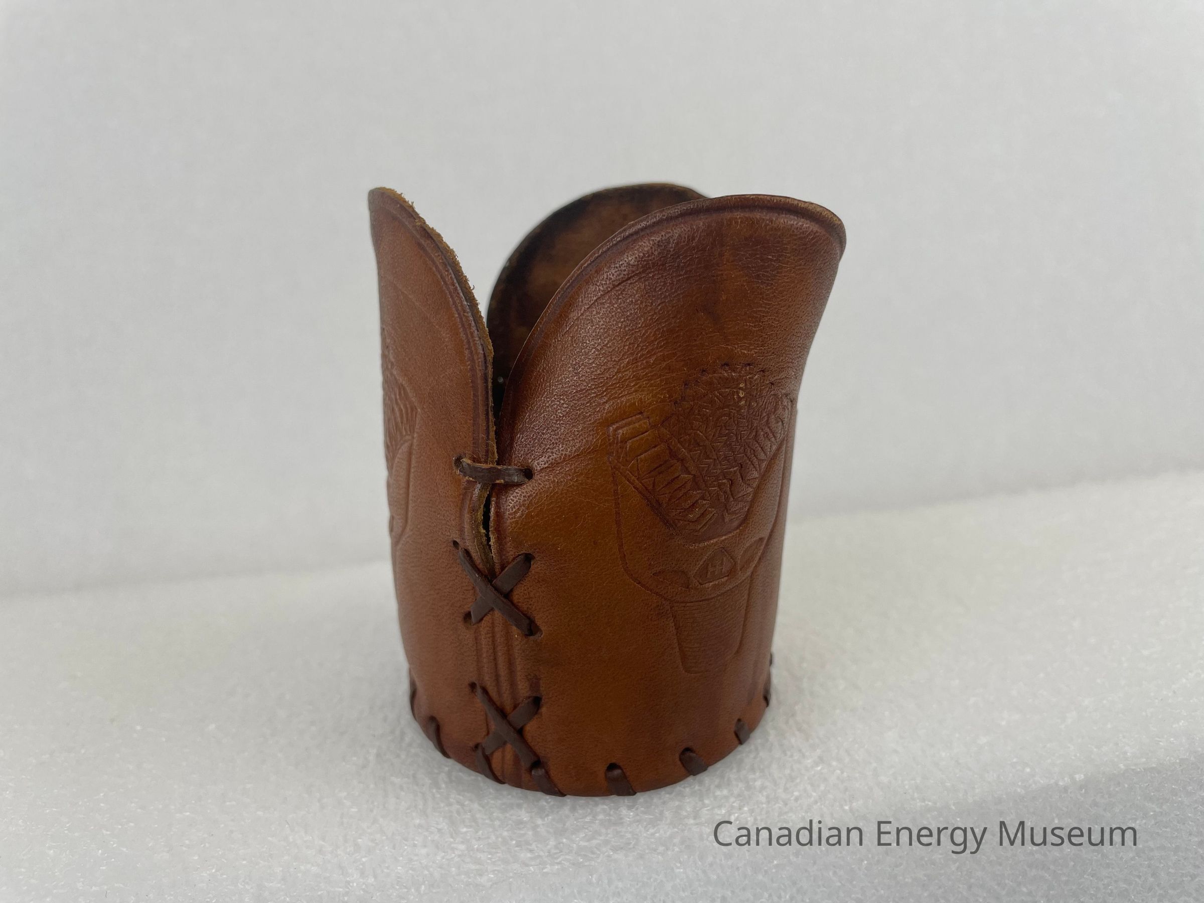Description: A leather glass koozie, made by Hughes Tool Company. The koozie is made up of four different leather pieces. The bottom is a circular leather piece, and the interior features an engraved logo of a triangle with the letters "HT" in the centre. The sides are made up of three rounded rectangular shapes, each with identical engraved drill bits. The pieces are stitched together with brown leather string.Collection