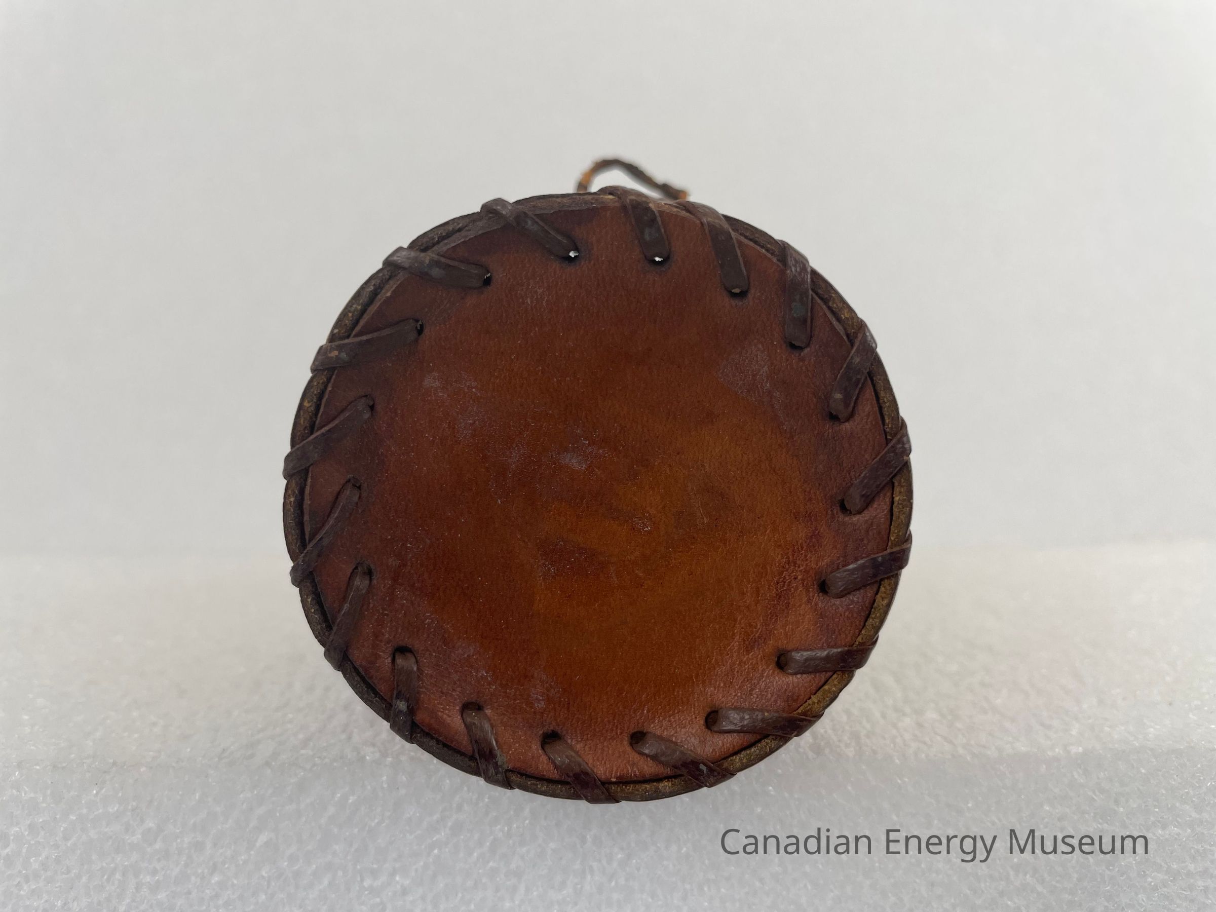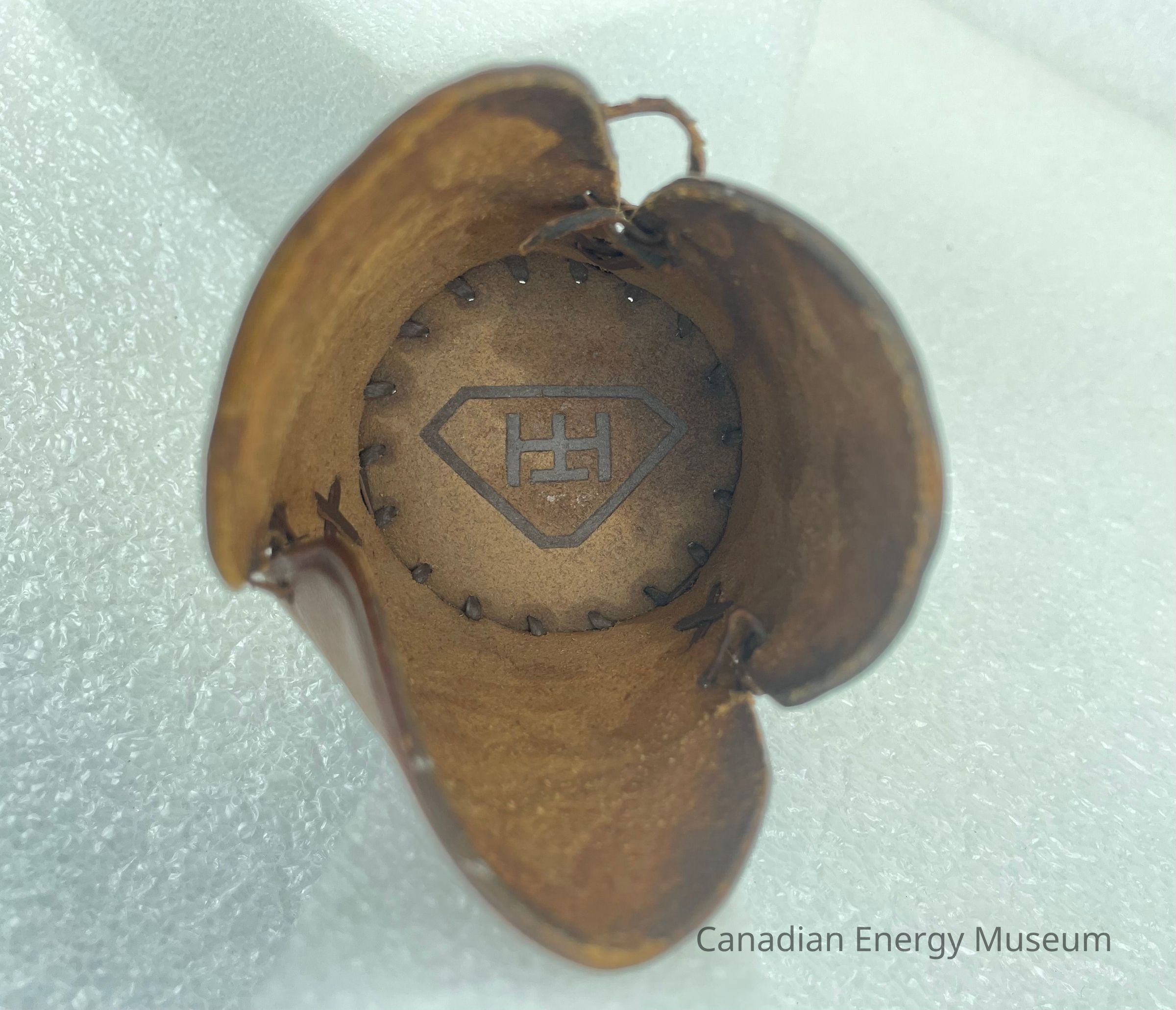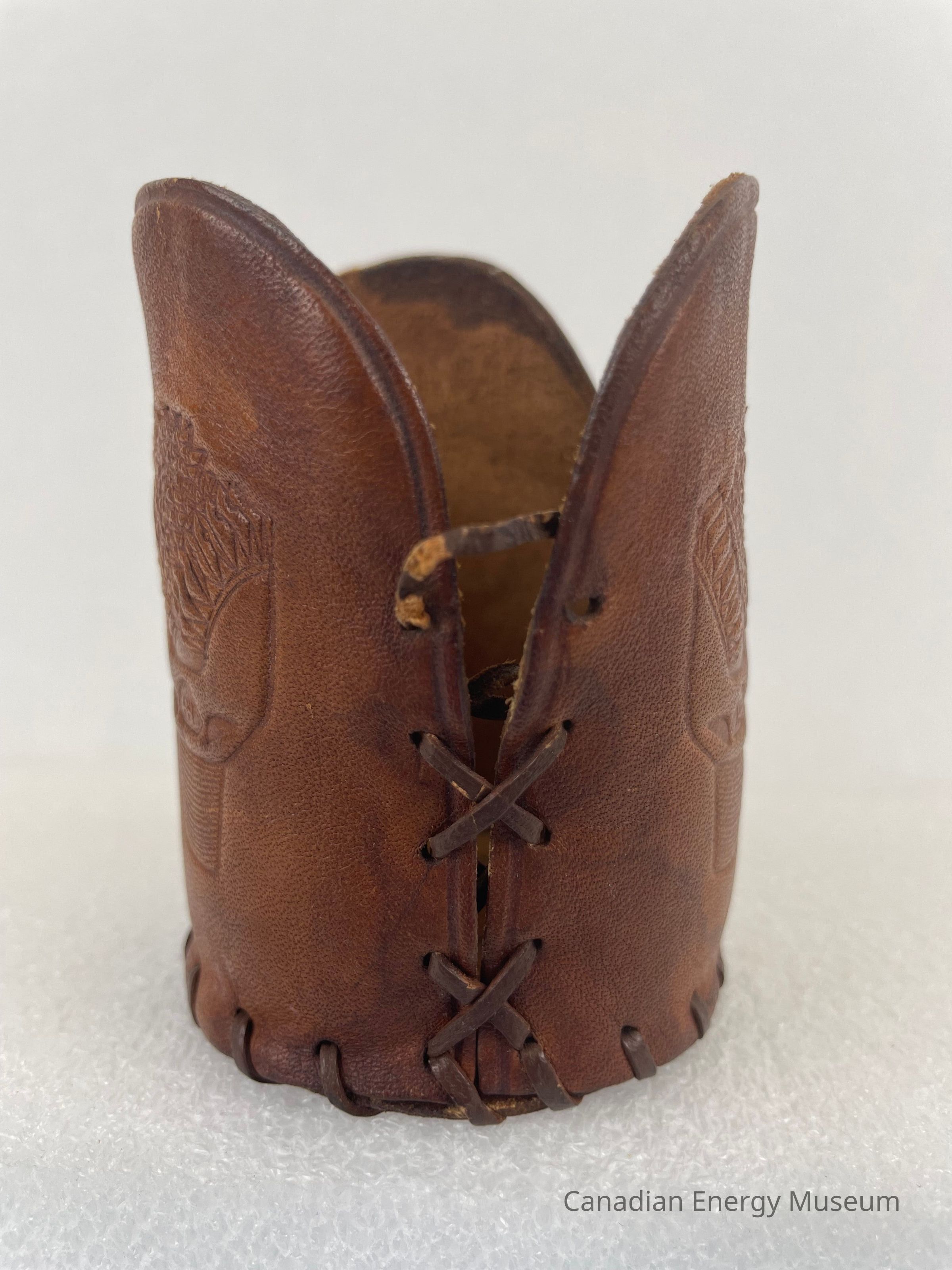 Description: A leather glass koozie, made by Hughes Tool Company. The koozie is made up of four different leather pieces. The bottom is a circular leather piece, and the interior features an engraved logo of a triangle with the letters "HT" in the centre. The sides are made up of three rounded rectangular shapes, each with identical engraved drill bits. The pieces are stitched together with brown leather string.Collection