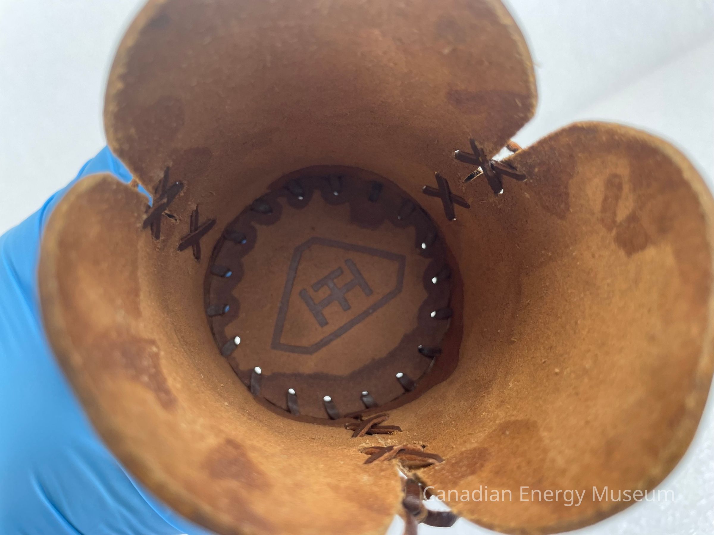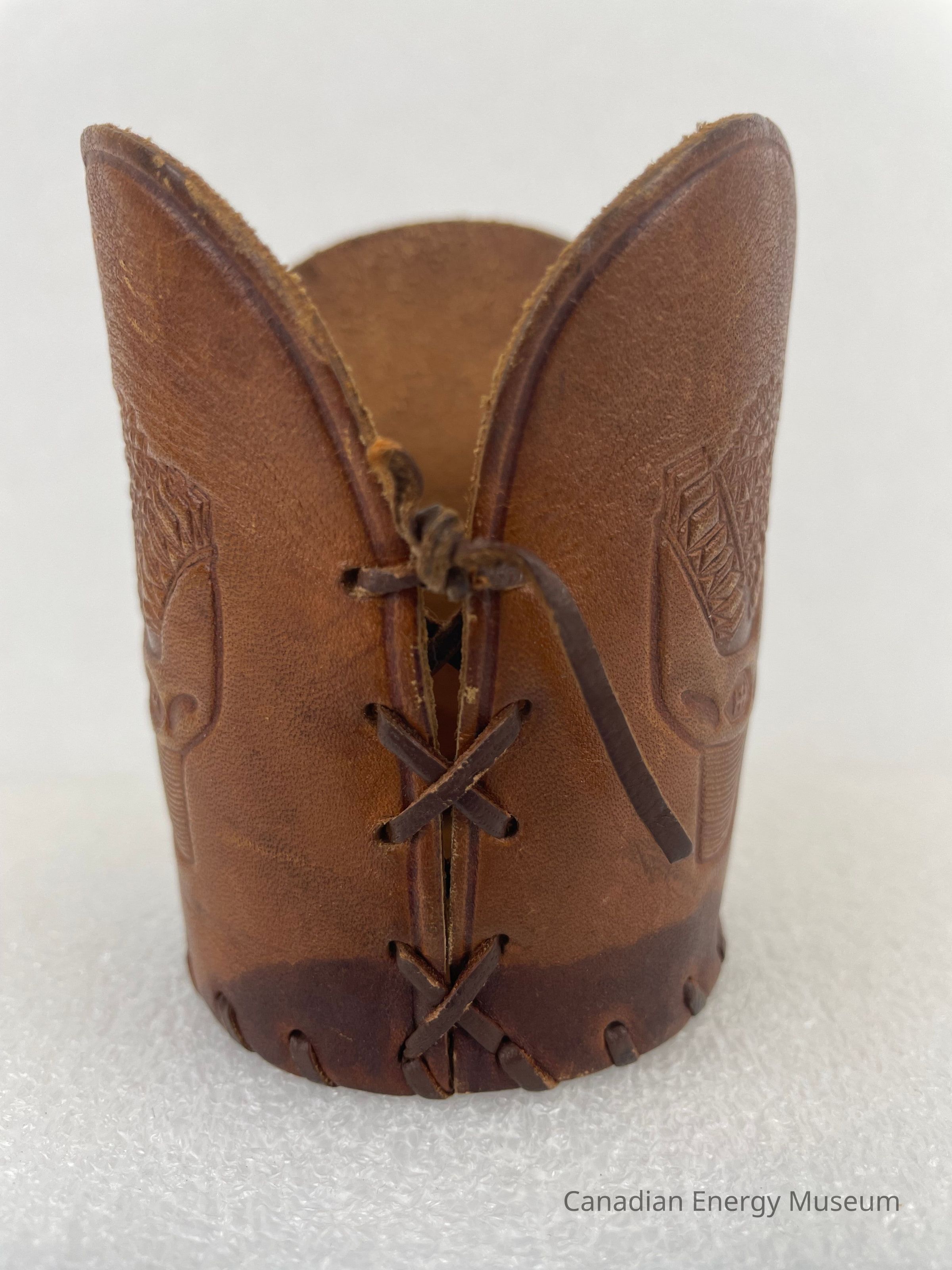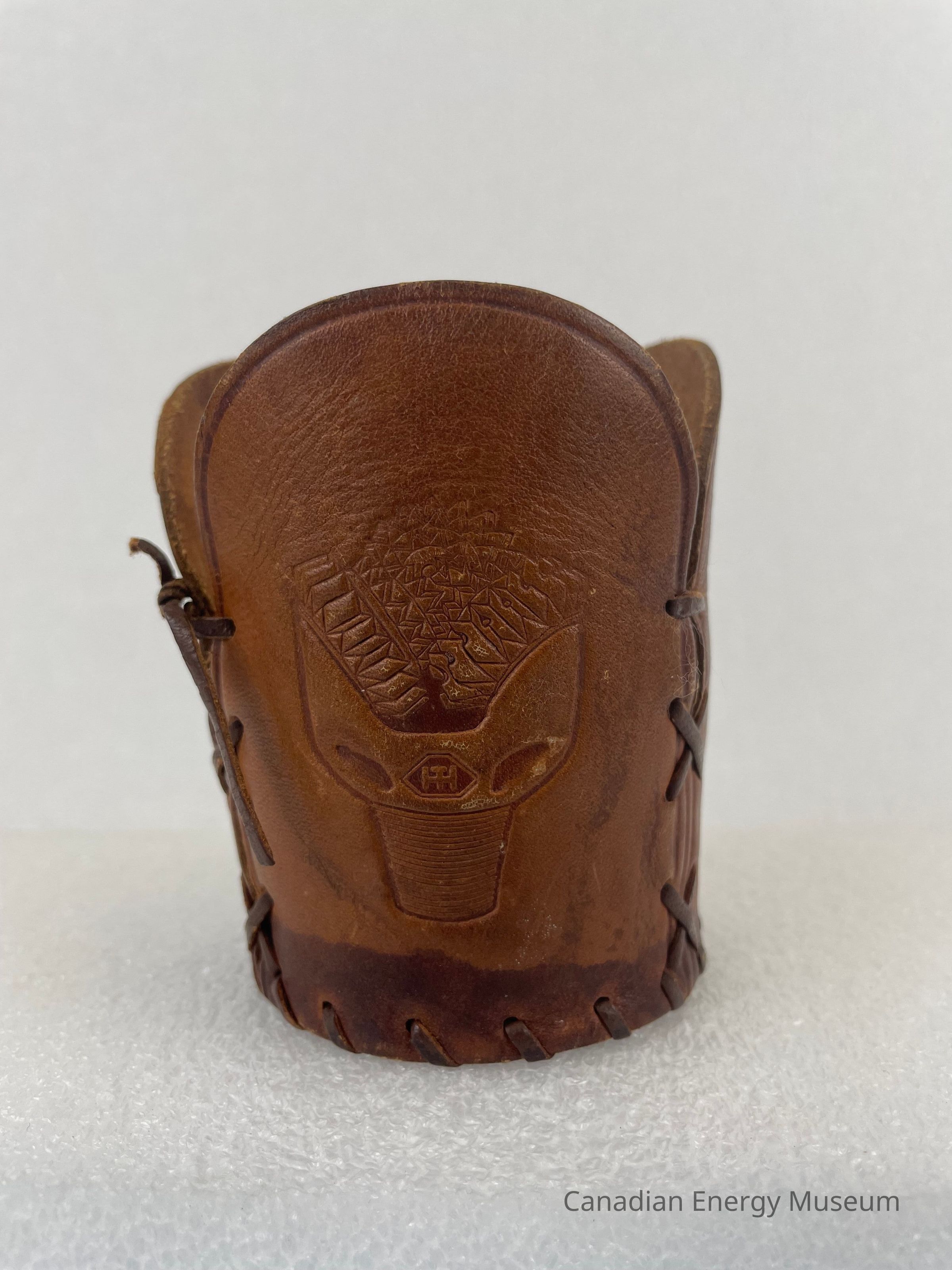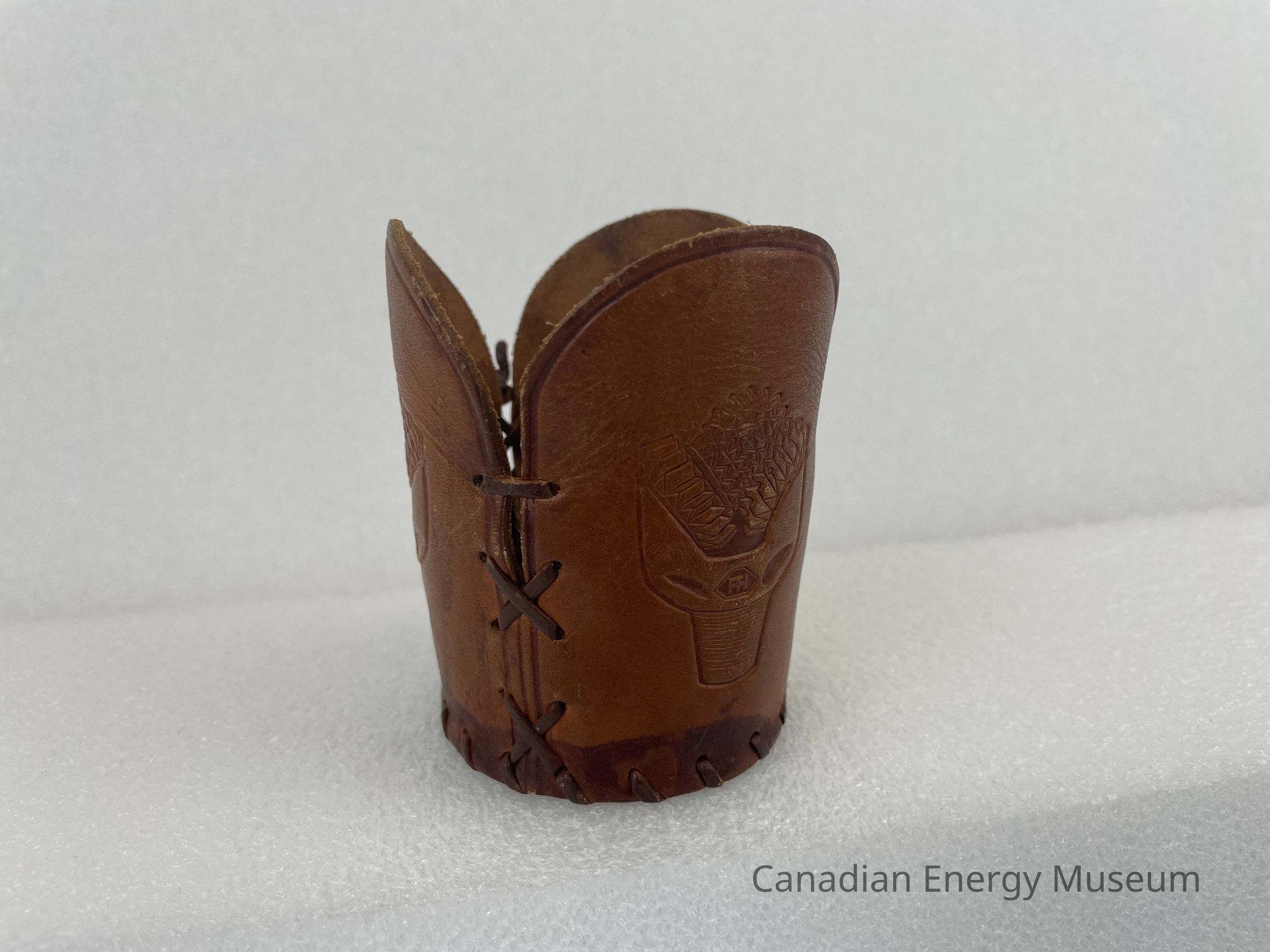 Description: A leather glass koozie, made by Hughes Tool Company. The koozie is made up of four different leather pieces. The bottom is a circular leather piece, and the interior features an engraved logo of a triangle with the letters "HT" in the centre. The sides are made up of three rounded rectangular shapes, each with identical engraved drill bits. The pieces are stitched together with brown leather string.Collection