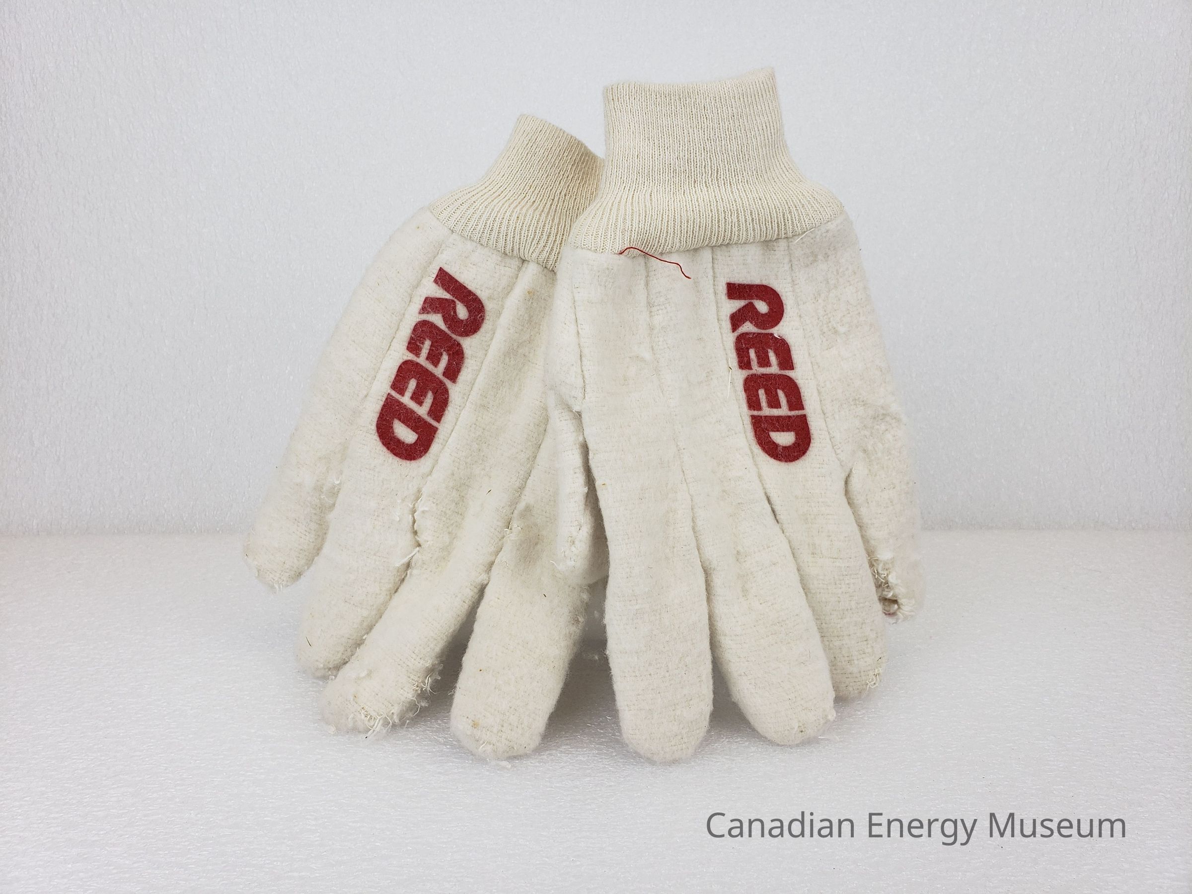 A pair of thick gloves, branded to Reed.