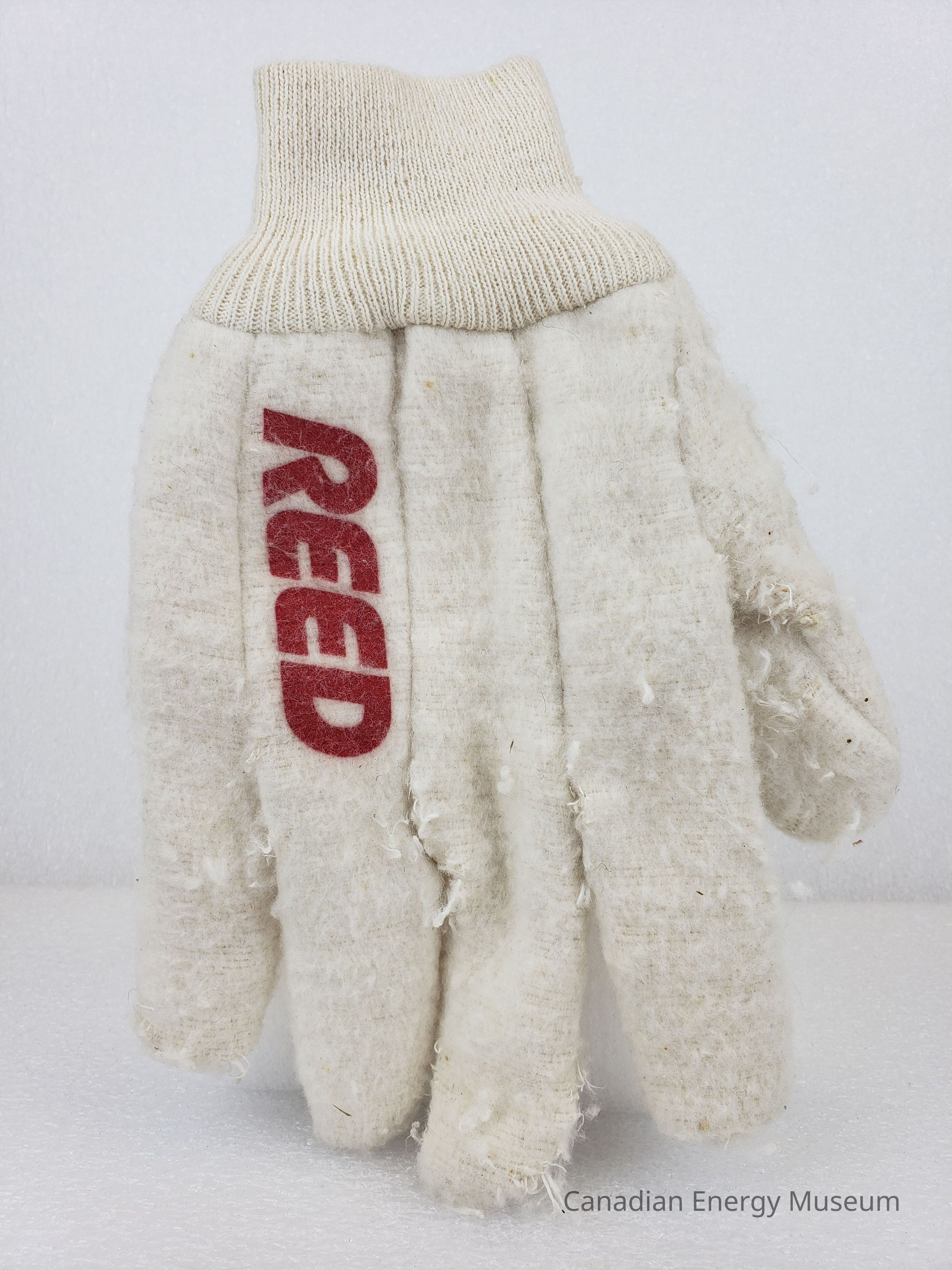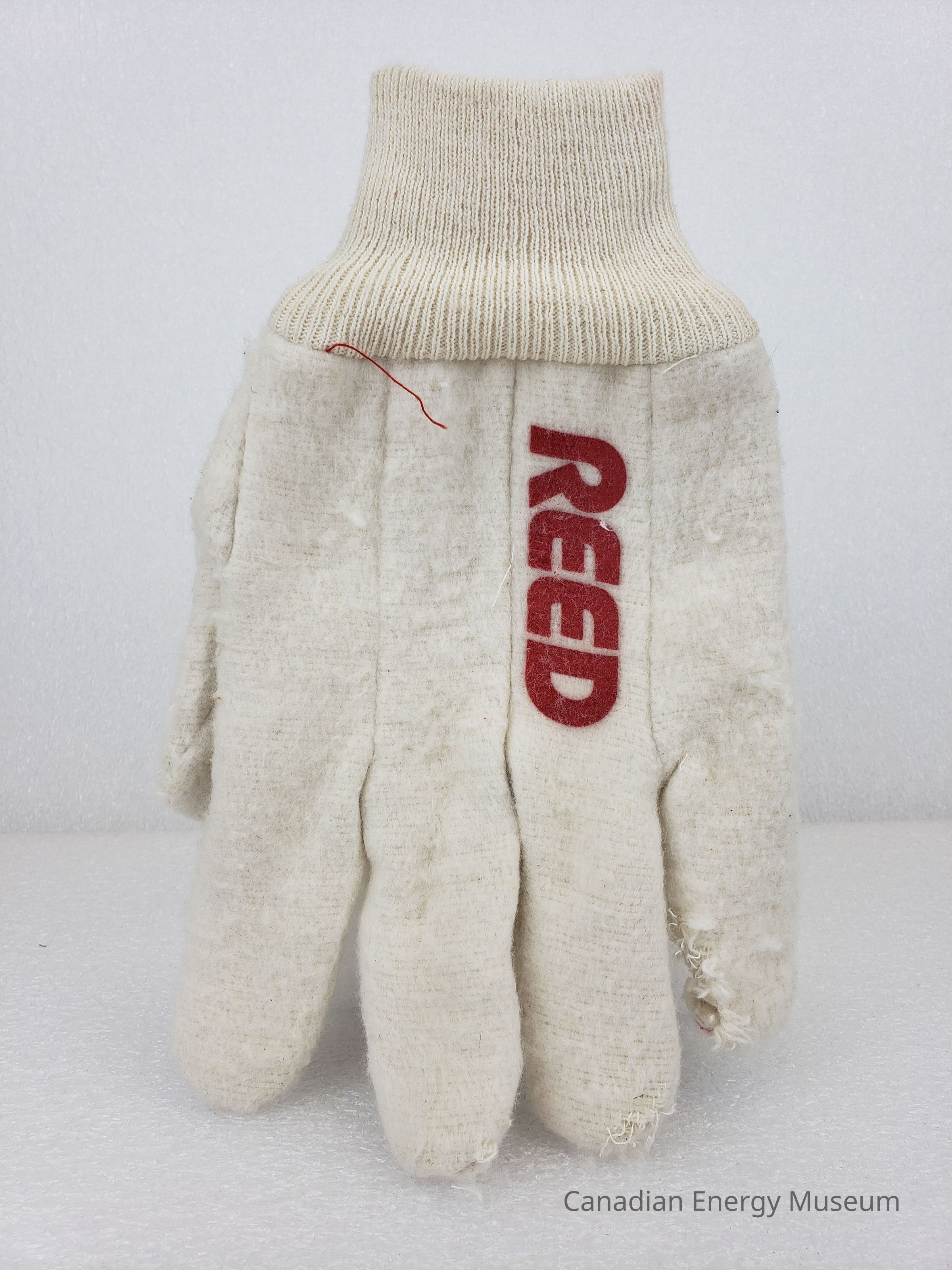 Design: A pair of thick, white gloves, with knit wrists, and printed branding to Reed. The red text logo reading "REED" is printed on the top of each glove, below the ring finger.