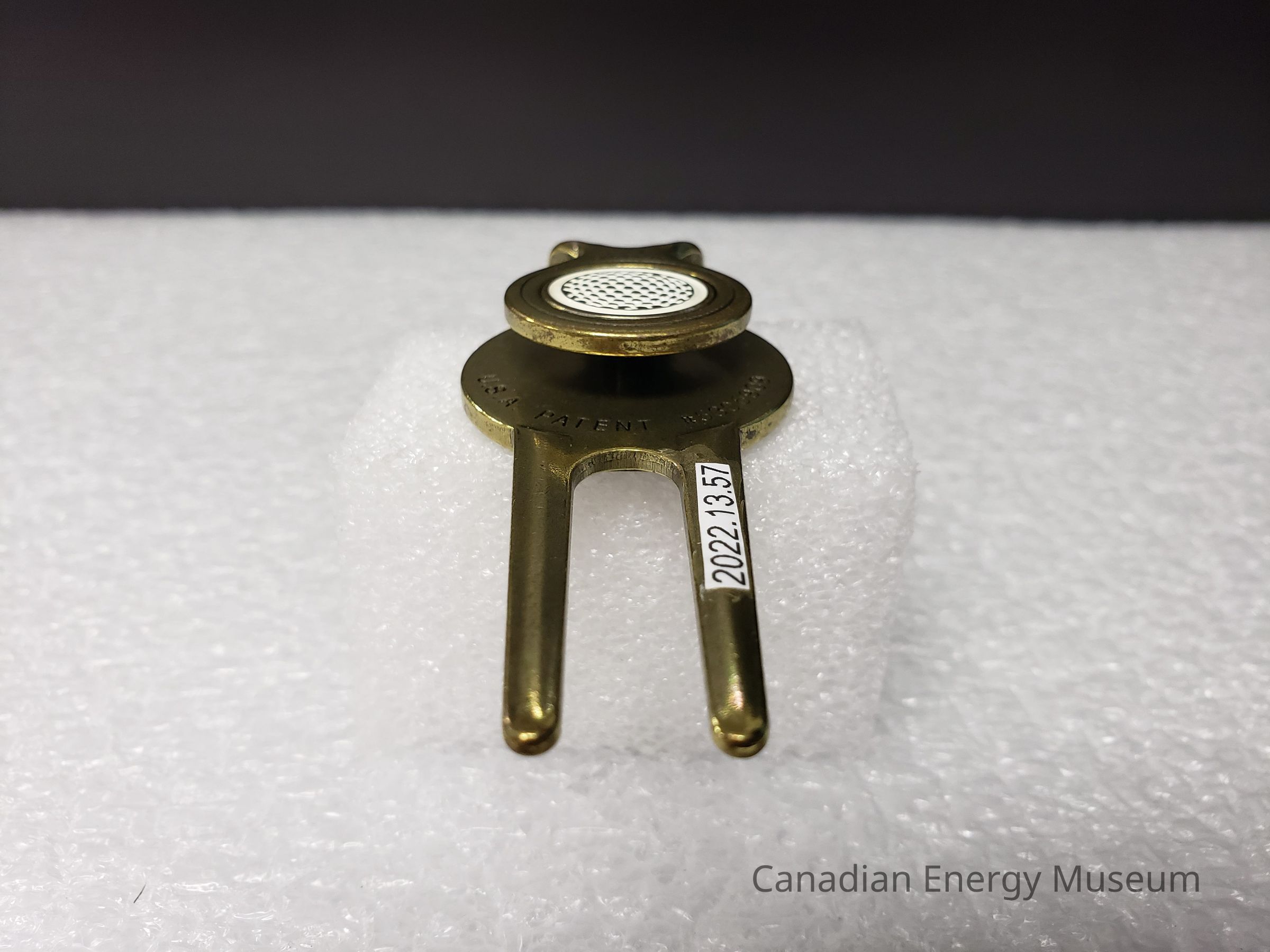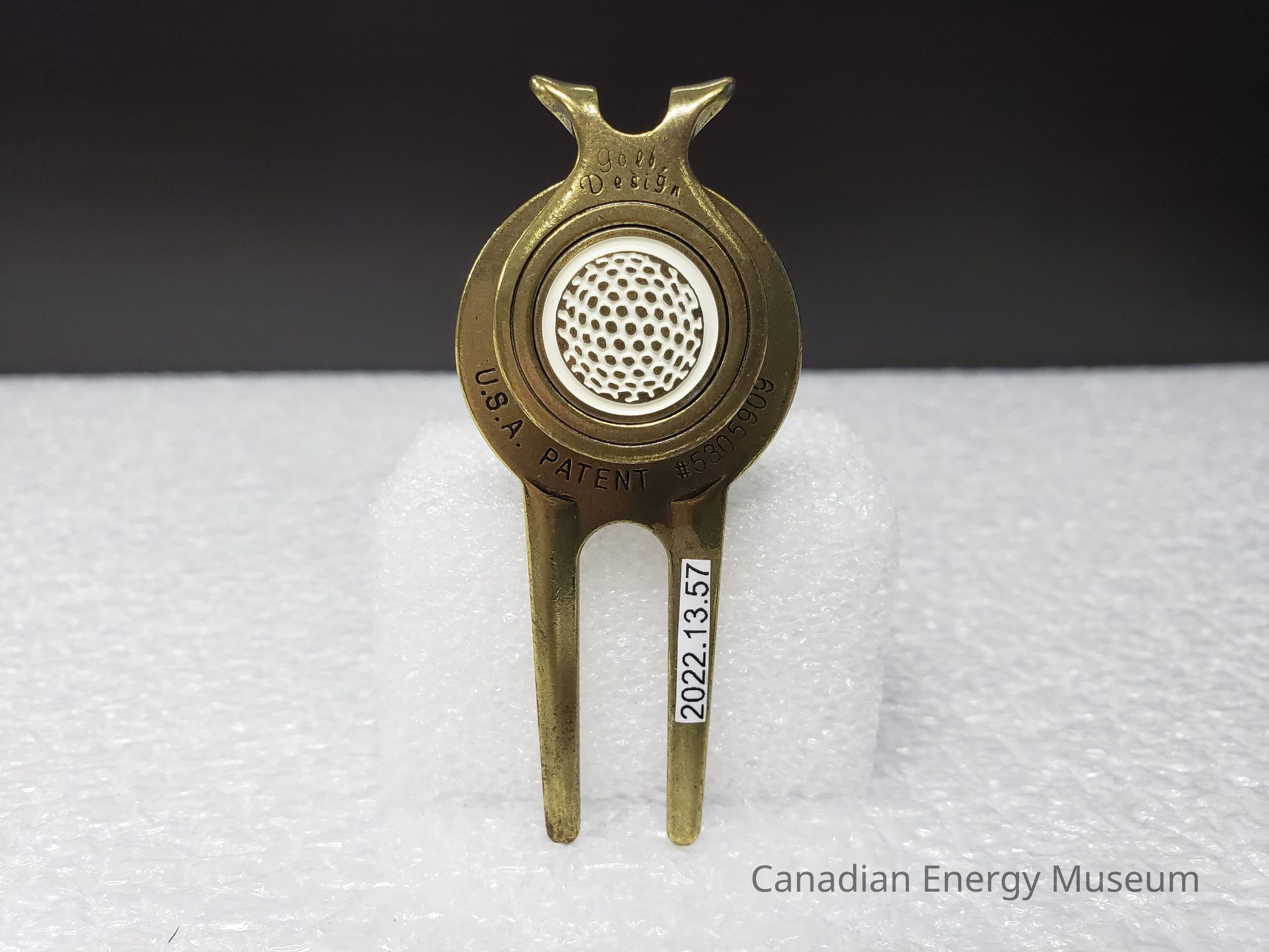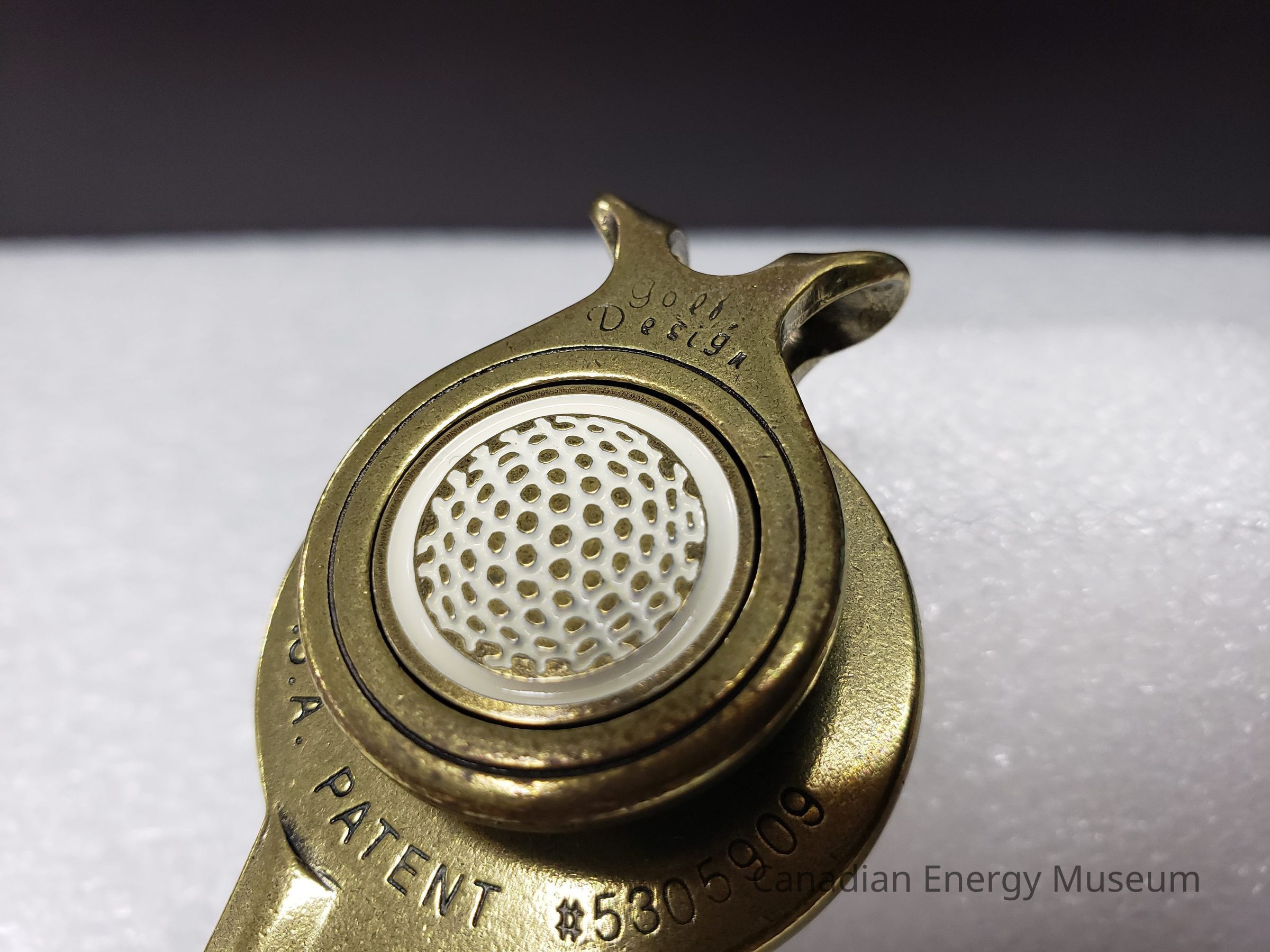 The tool has a hooked piece of metal at the top that curves behind to a smaller circle forming a belt clip. making the rest of the belt clip a smaller circle of metal. An above the circle says " " and has a white enamel golf ball with the cast metal making the golf ball details. One the back of the clip it has "U.S. PATENT #5305909" engravedCollection