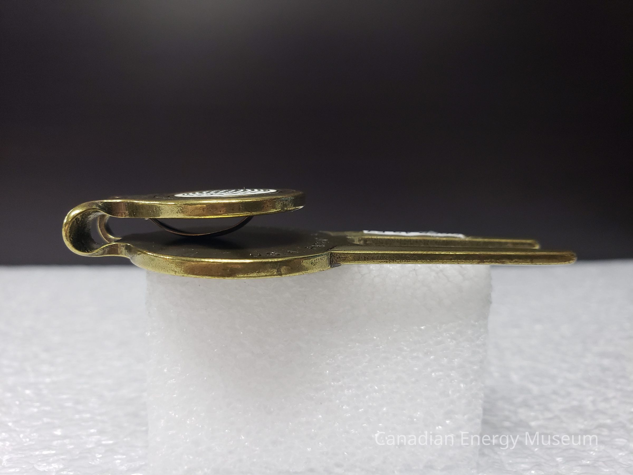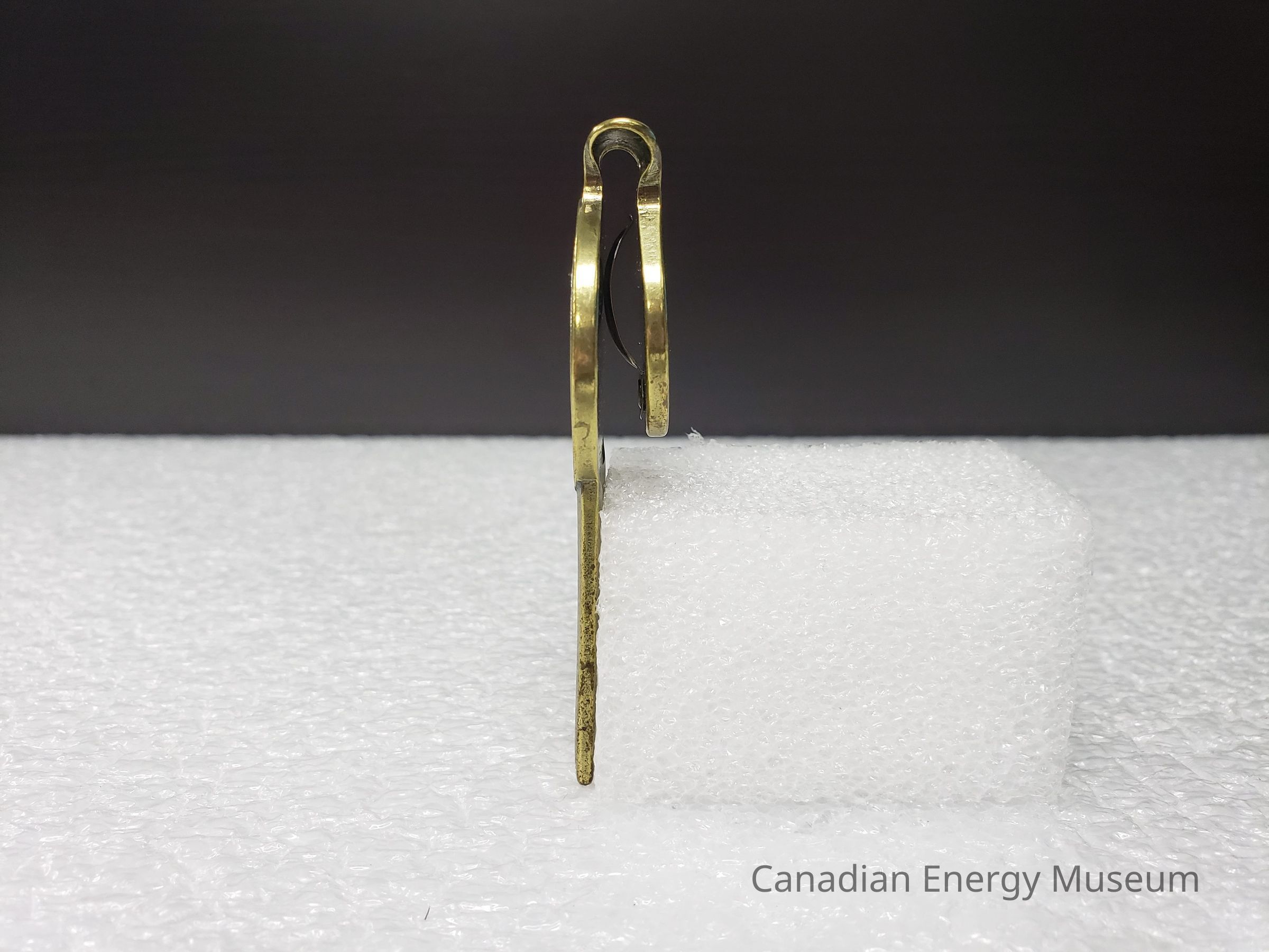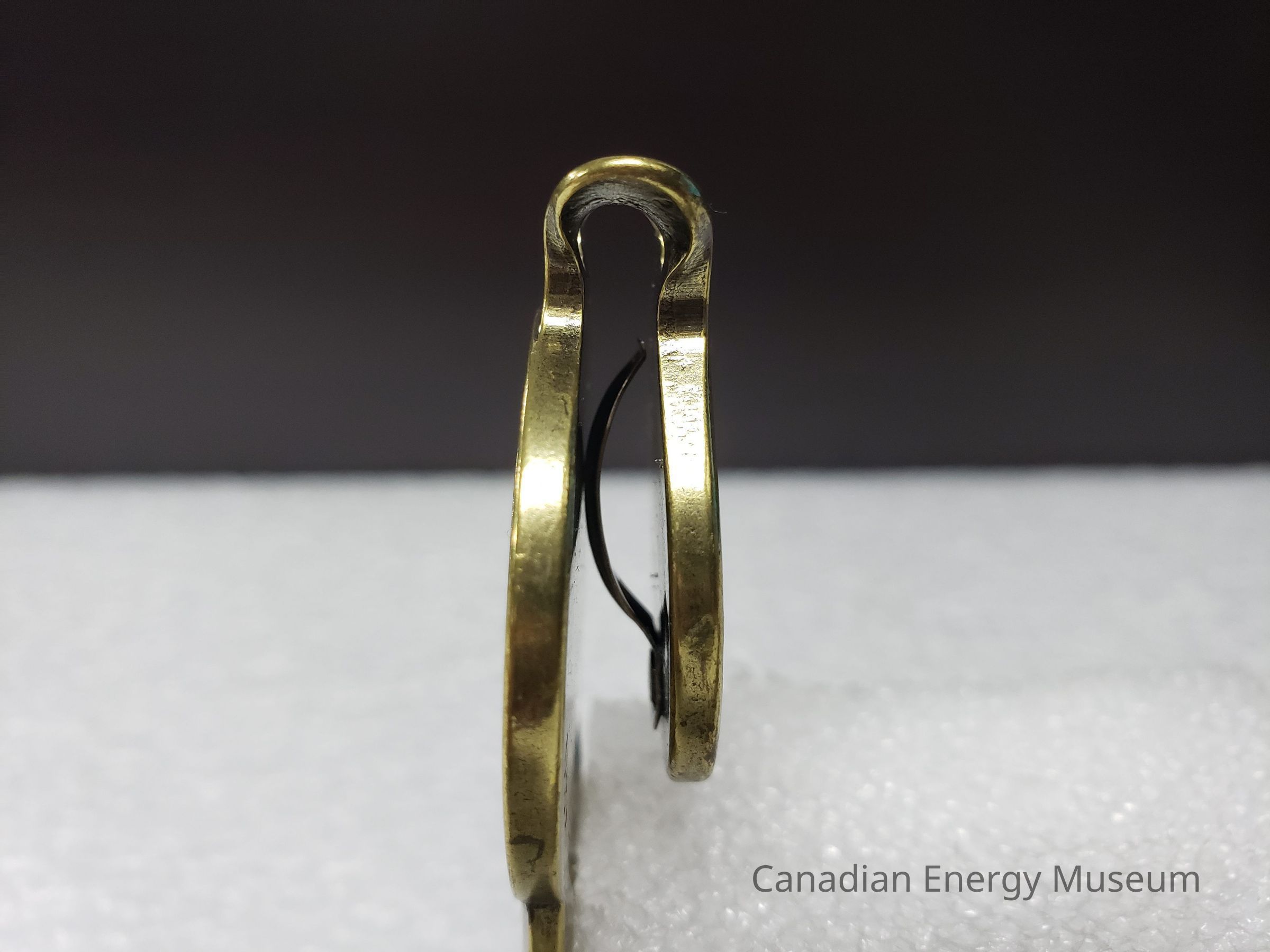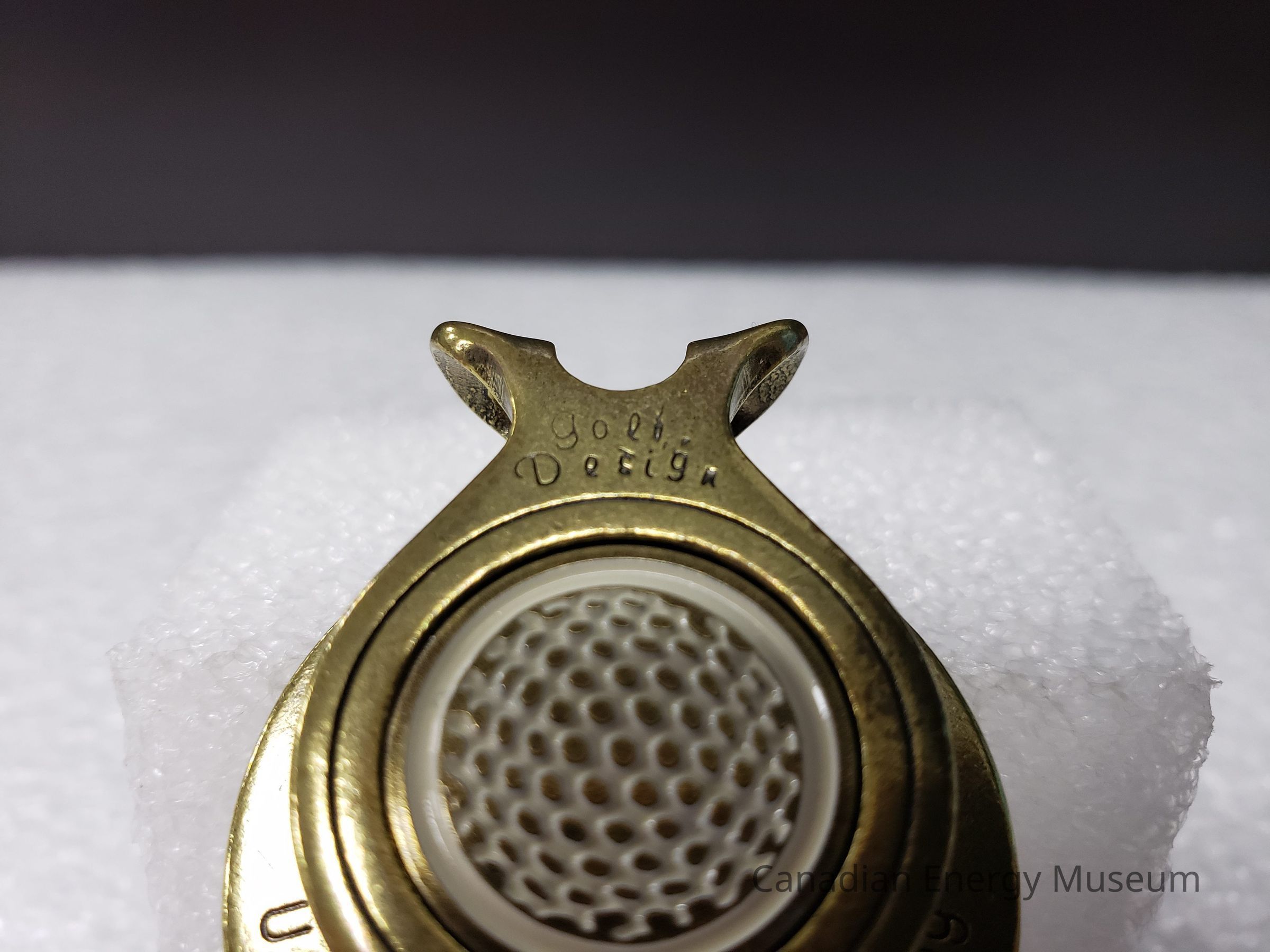 The tool has a hooked piece of metal at the top that curves behind to a smaller circle forming a belt clip. making the rest of the belt clip a smaller circle of metal. An above the circle says " " and has a white enamel golf ball with the cast metal making the golf ball details. One the back of the clip it has "U.S. PATENT #5305909" engravedCollection