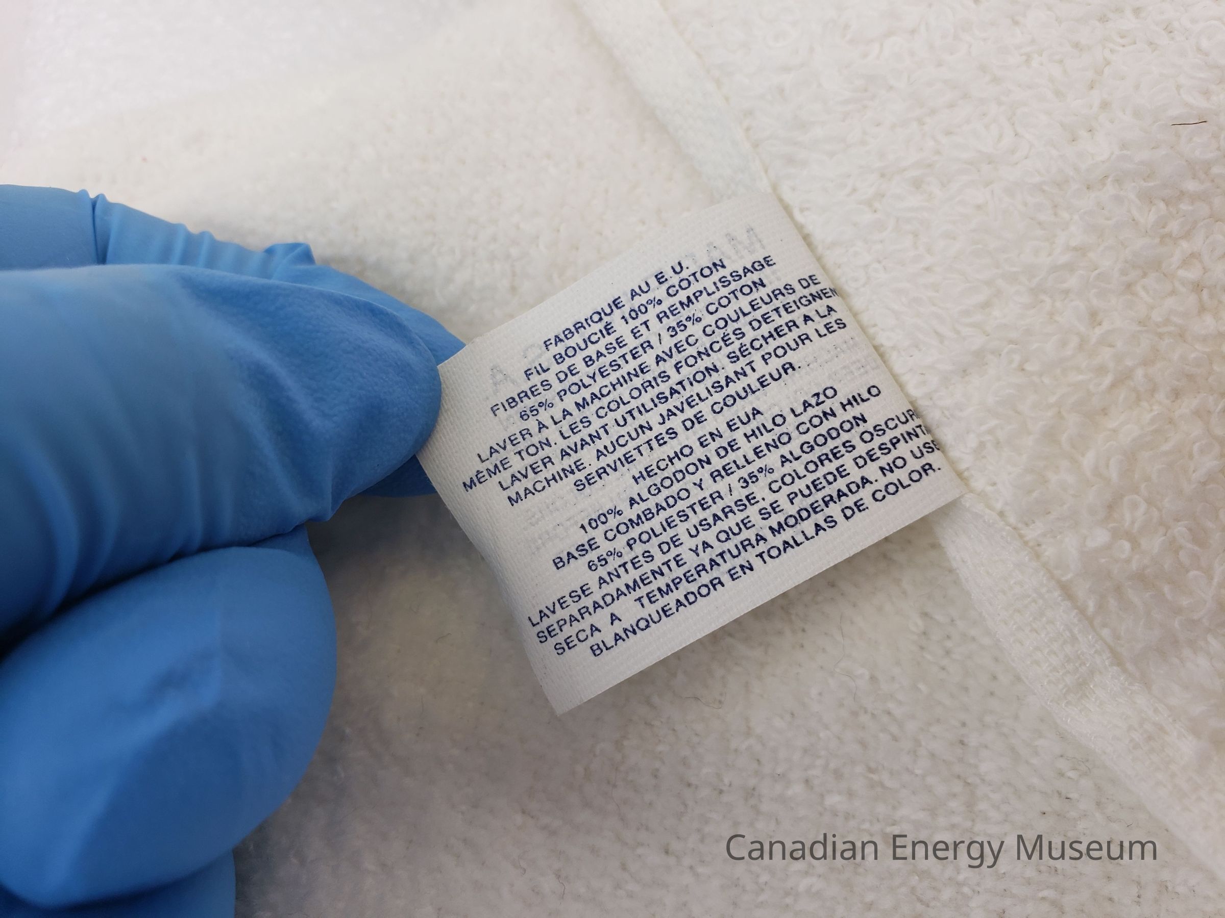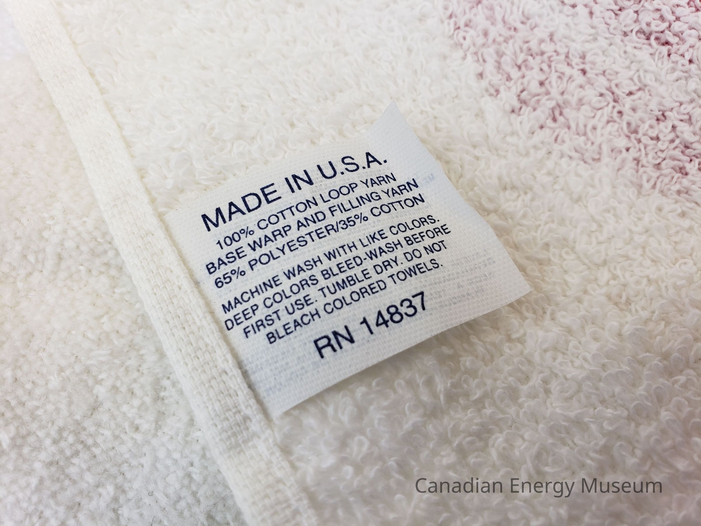 Towel Material: Fabric, white cotton/polyester blend. Red black print.