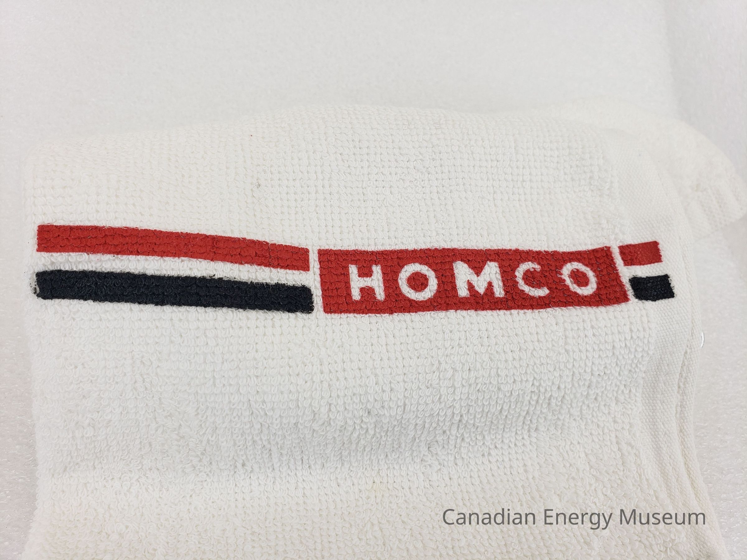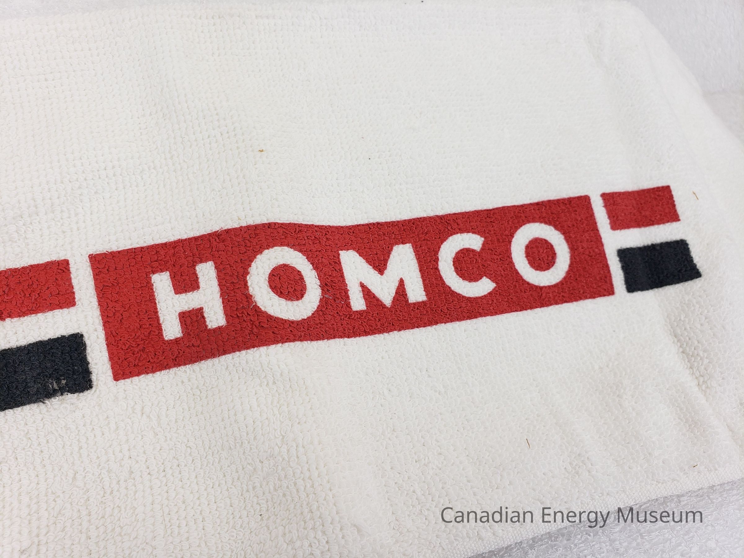 Design: A white terry golf towel, with the Homco text logo printed in two places. Running vertically along the left side of the two is the larger of the two logos, with a red and black band to either side. The second logo is smaller, and runs horizontally at the bottom of the right side of the towel. The material is of a medium-weight thickness, and the towel is bi-folded vertically. A silver eyelet is set through the centre-top of the folded towel, through which is a matching pear clip.