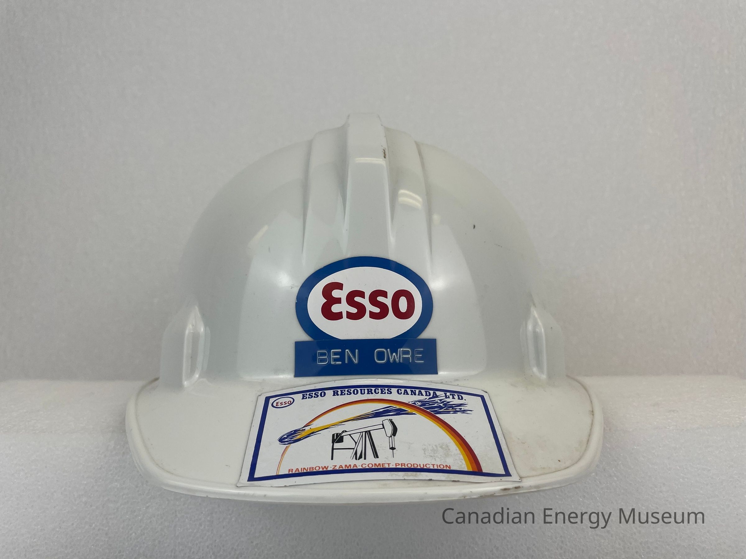 The front of the hat displays three stickers. The top sticker displays a tattered sticker branded to Esso. Beneath it, somewhat layered over the Esso sticker, is a blue label with white embossed text reading, "BEN OWRE". The last sticker is placed on the brim of the hat. It is a large rectangular sticker branded to Esso, with a white background. A dark blue outline of a rectangle borders the sticker, and features a large image of a comet soaring over a pump jack and a red, orange and yellow rainbow arching over the scene. Blue text at the top reads, "ESSO RESOURCES CANADA LTD." Red text at the bottom reads, "RAINBOW . ZAMA . COMET . PRODUCTION".