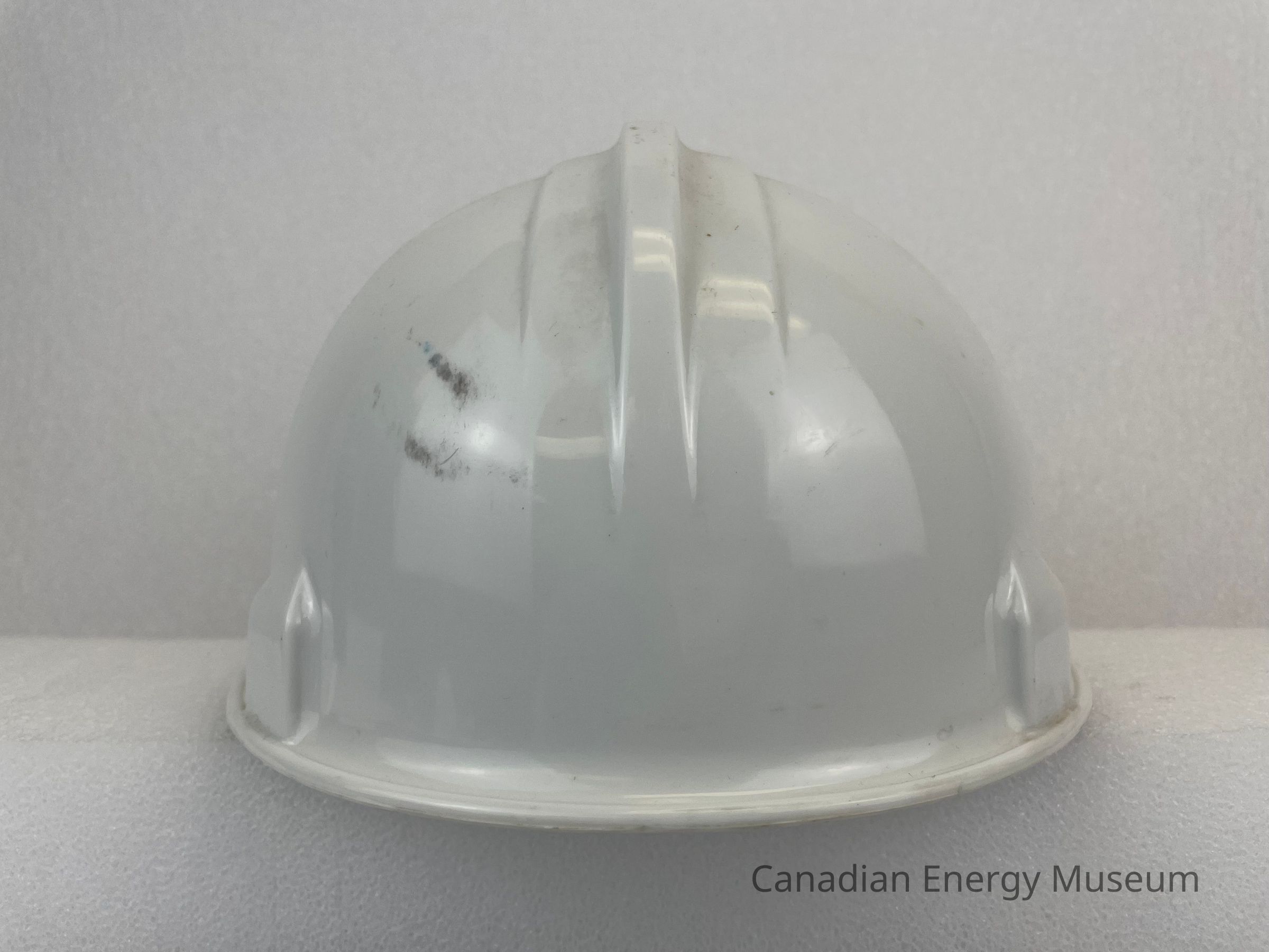 A white plastic hard hat, once belonging to Ben Owre.
