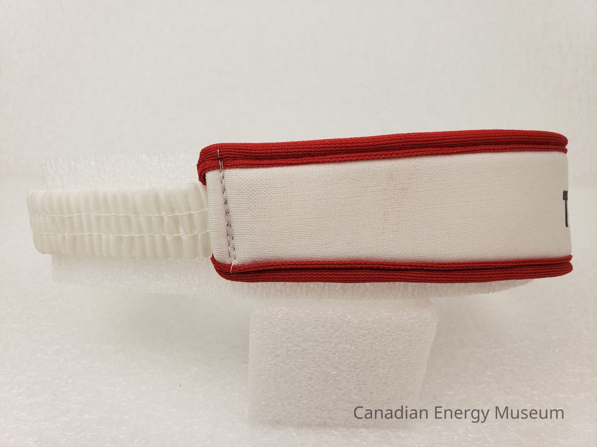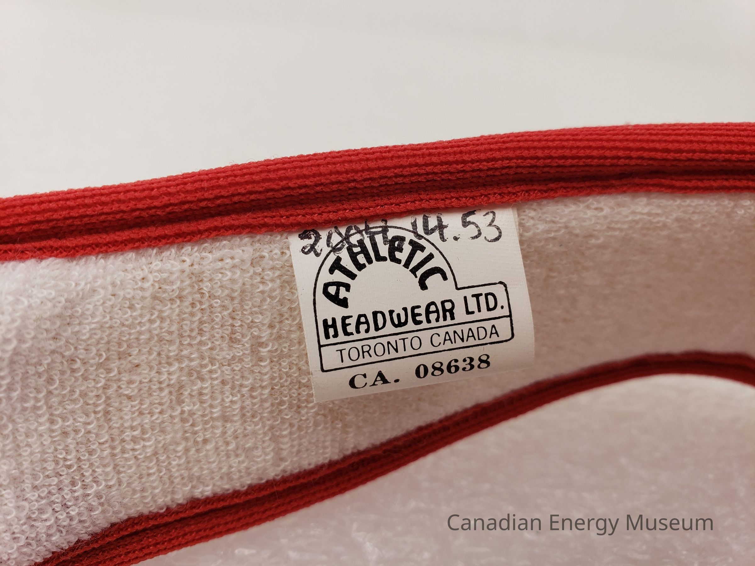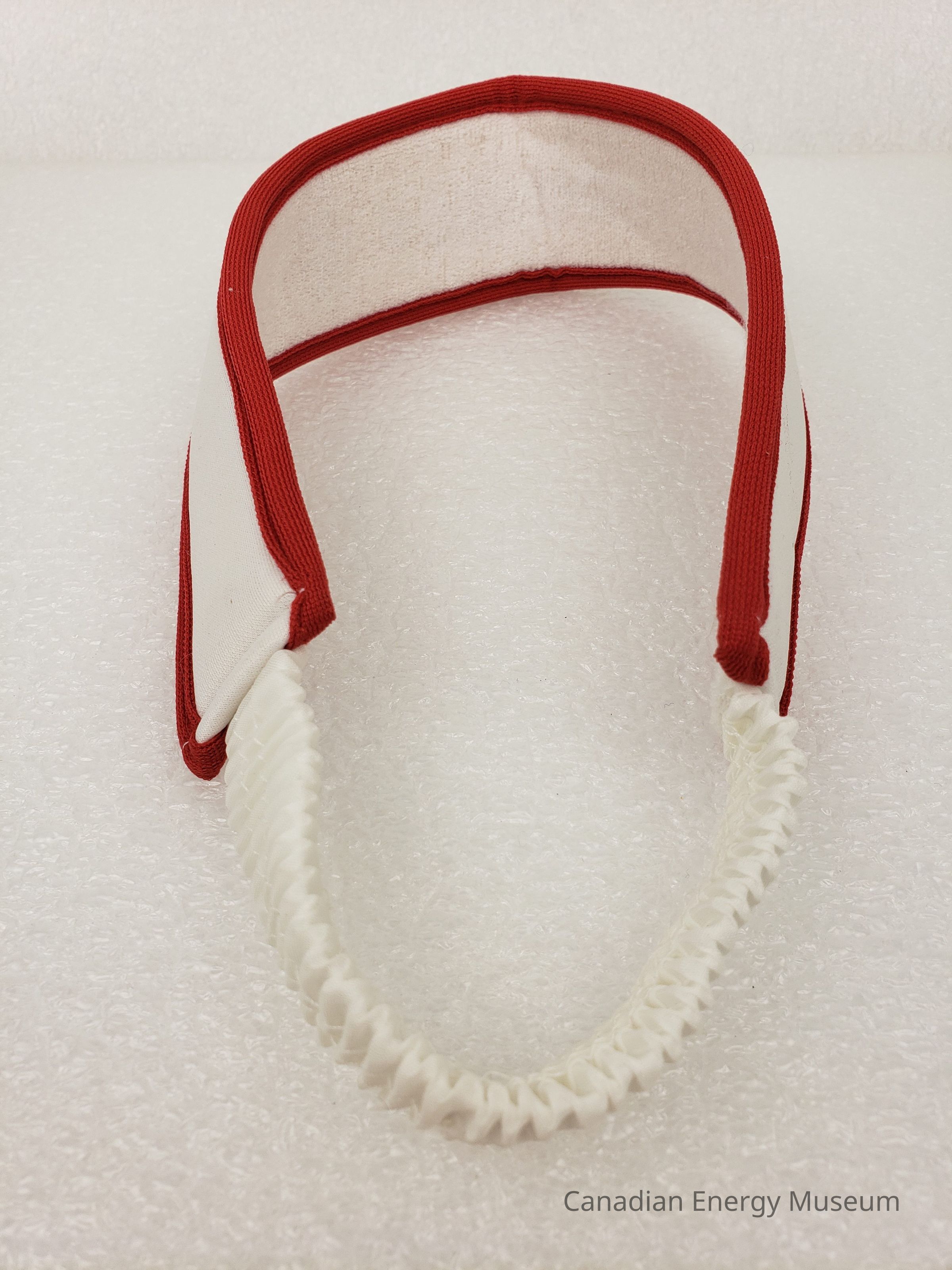 Construction: Front and sides exterior is white jersey fabric with red piping on top and bottom. White terry cloth material lining interior of front and sides. The back section is white crimped fabric covered elastic. On the right-side interior is a tag with maker's and care information.Collection