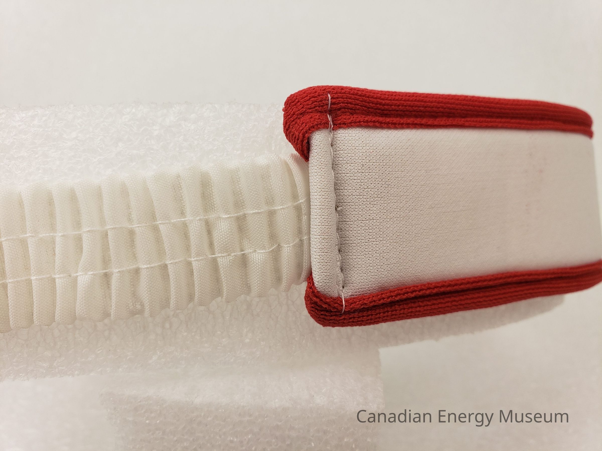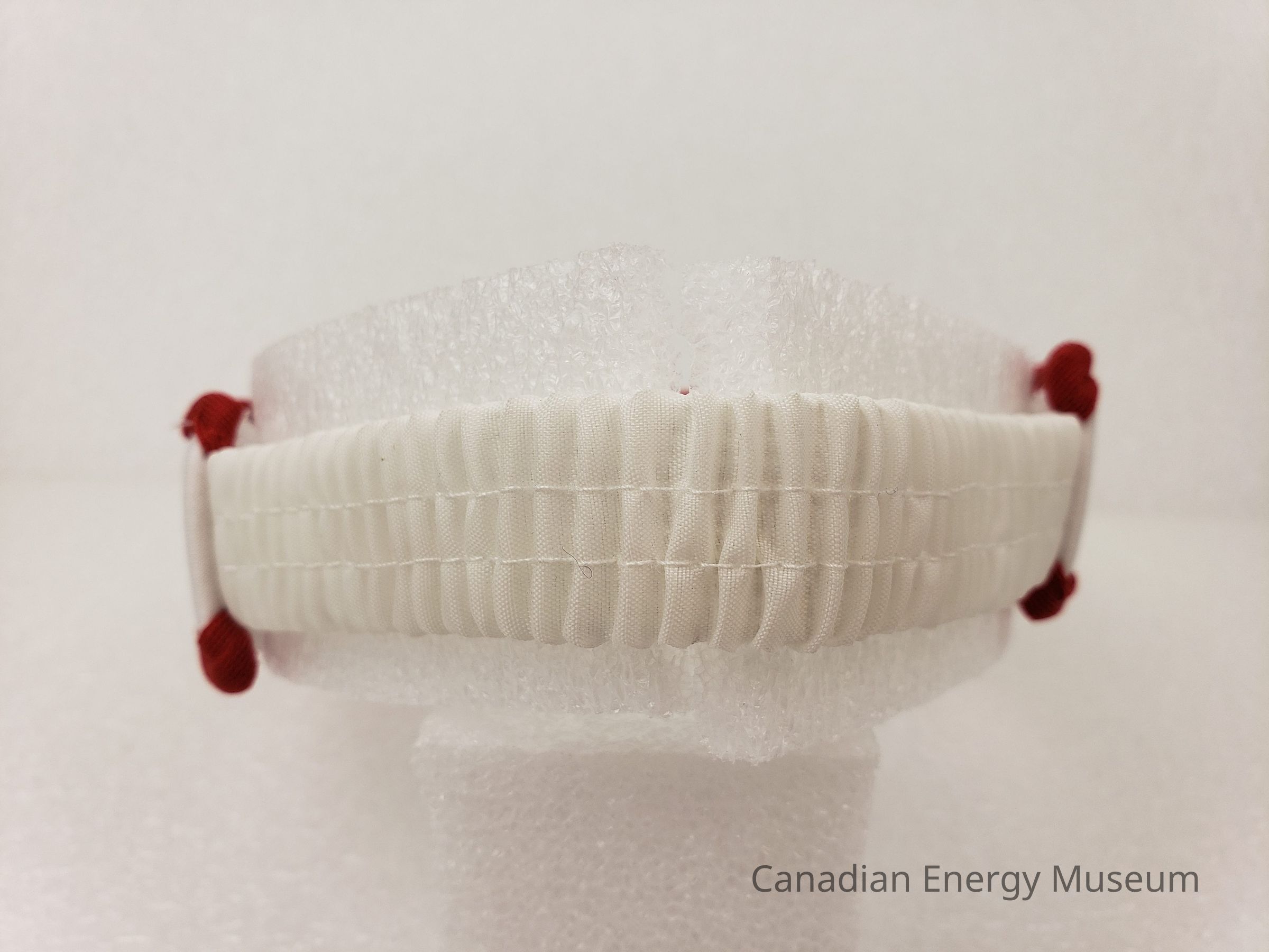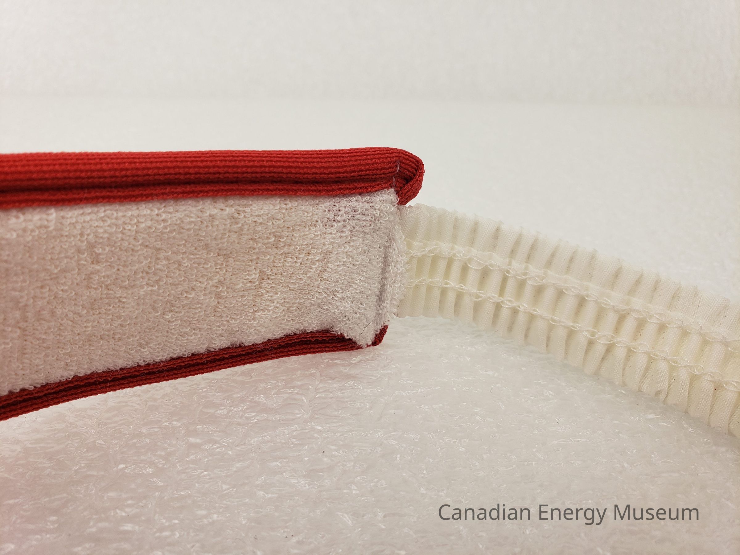 Construction: Front and sides exterior is white jersey fabric with red piping on top and bottom. White terry cloth material lining interior of front and sides. The back section is white crimped fabric covered elastic. On the right-side interior is a tag with maker's and care information.Collection