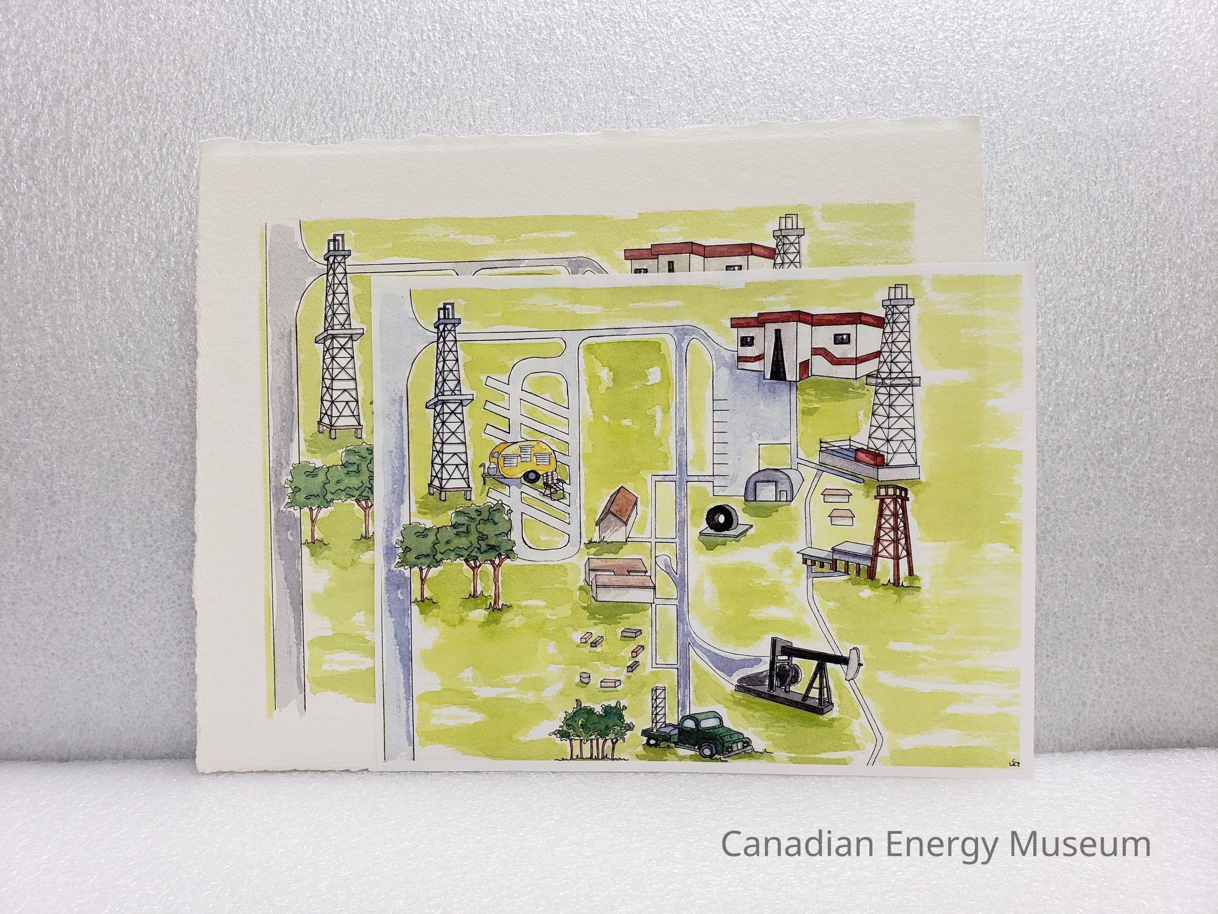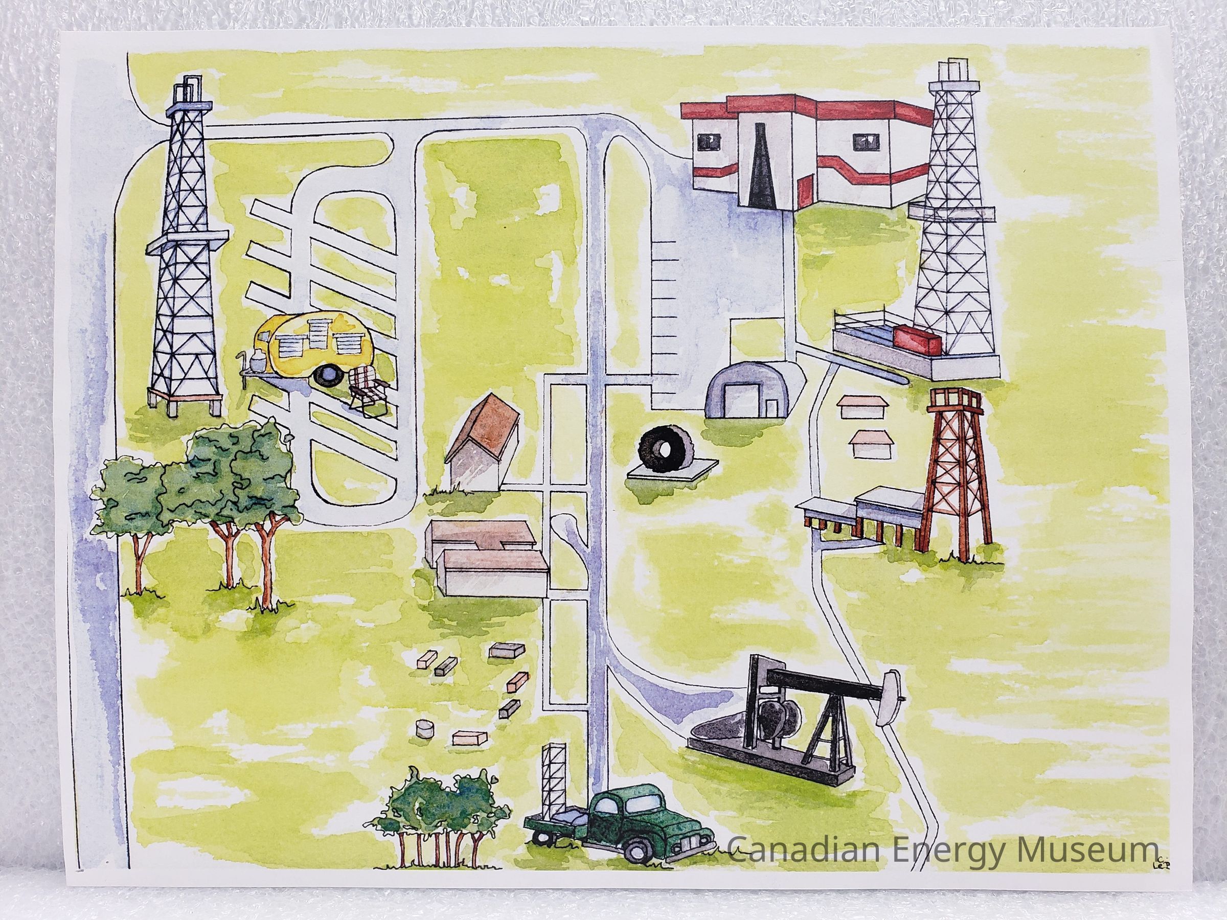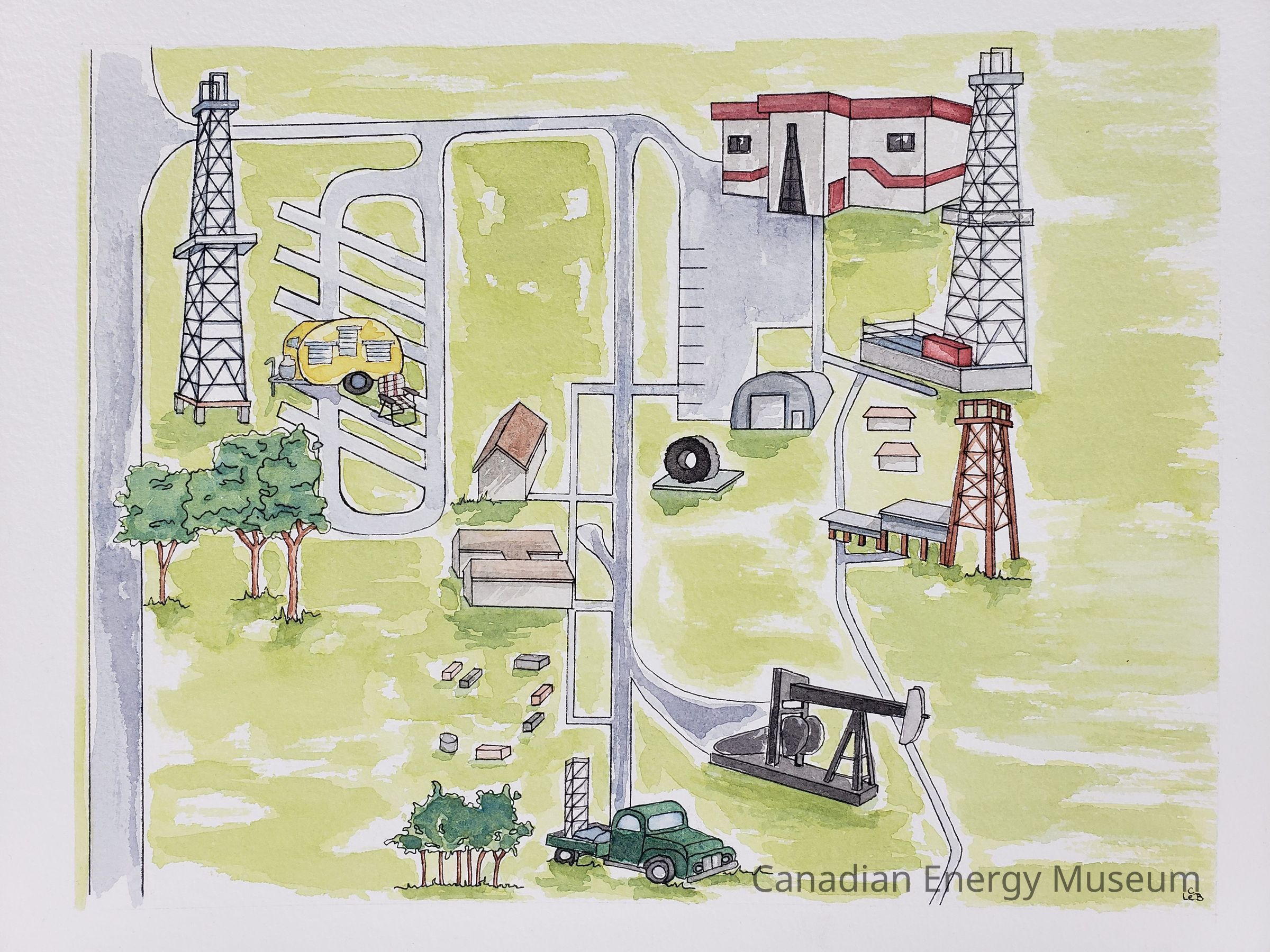 An original stylised illustration of the museum's grounds. Shows the museum building, three derricks, the campground, Atco and MI Safety buildings, a pumpjack, and service truck. Outlines done in black ink, with colouring done with watercolours.