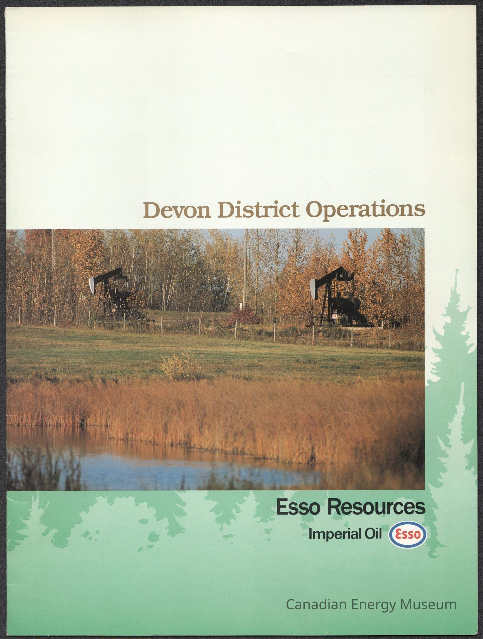 Cover Design: Features a white and green gradient background with darker green illustrations of trees surrounding the large photograph. The photograph is of two oil rigs with pump jacks along a treeline, and in front of a body of water. Above the picture in gold foil is text reading, "Devon District Operations", and at the bottom in black text reads, "Esso Resources Imperial Oil" with the Esso logo next to it.