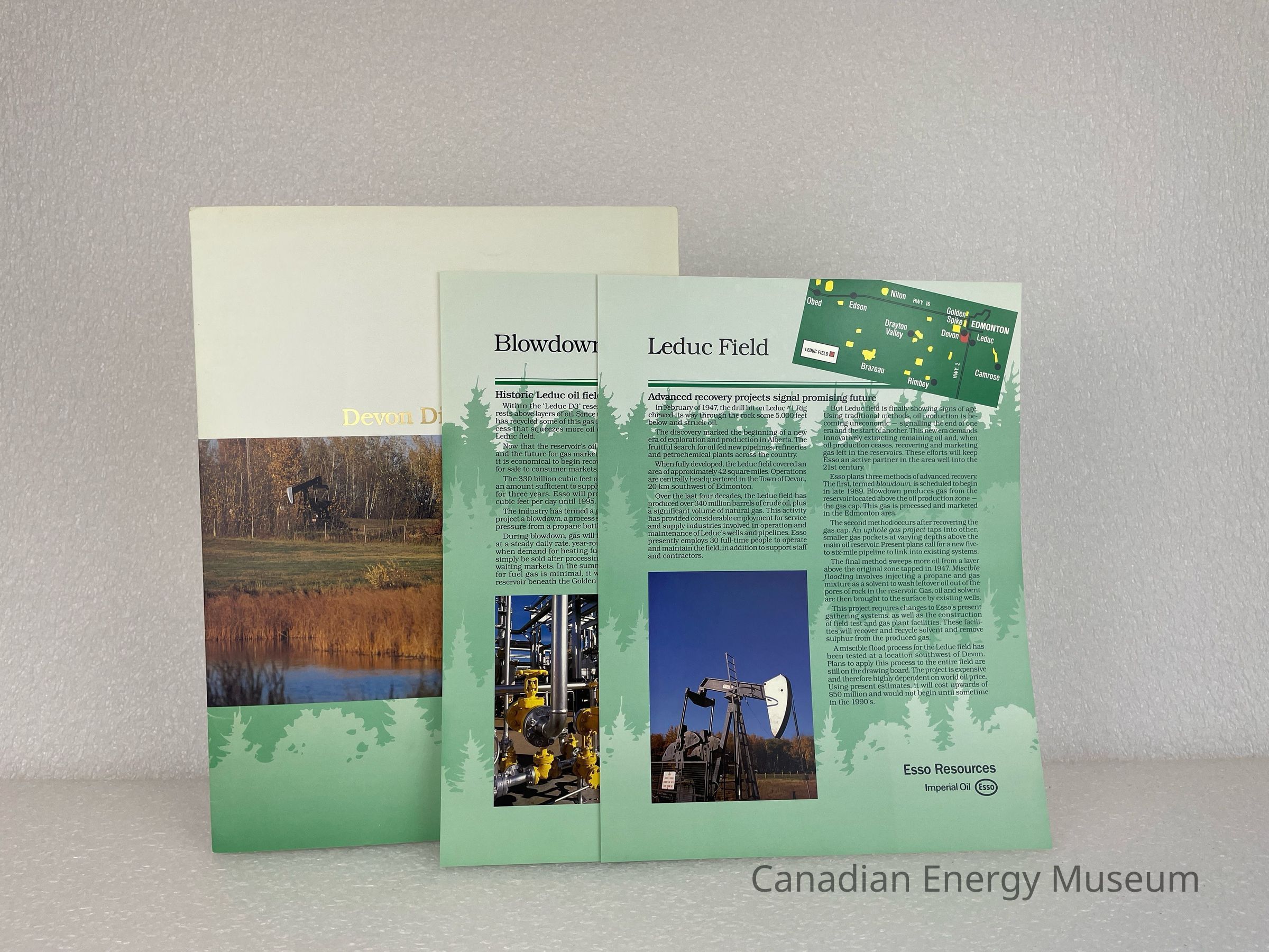 A large-format information packet produced by ESSO/Imperial Oil, containing sheets with information on the oil/gas operations in Devon and surrounding areas, c.1989.