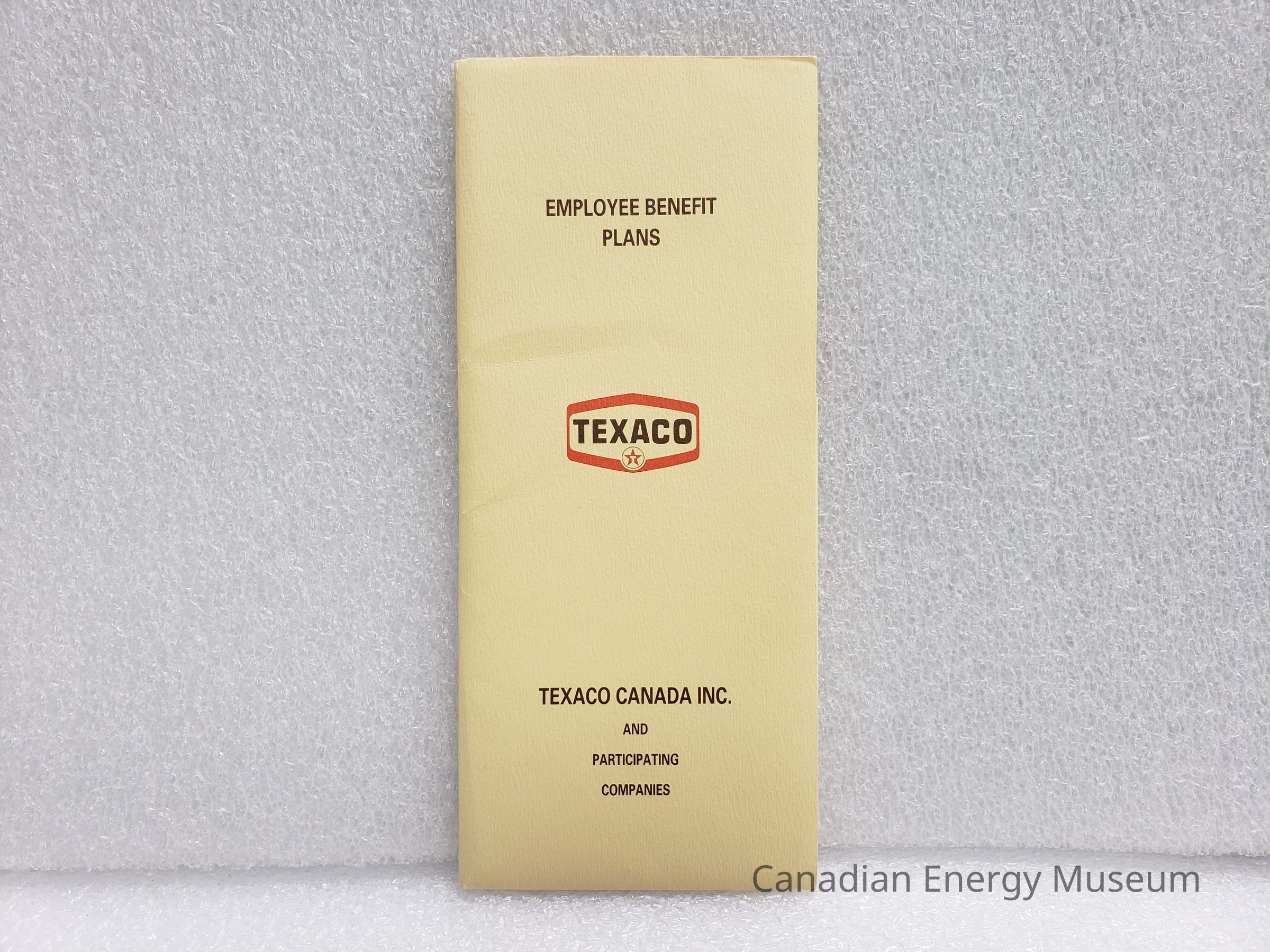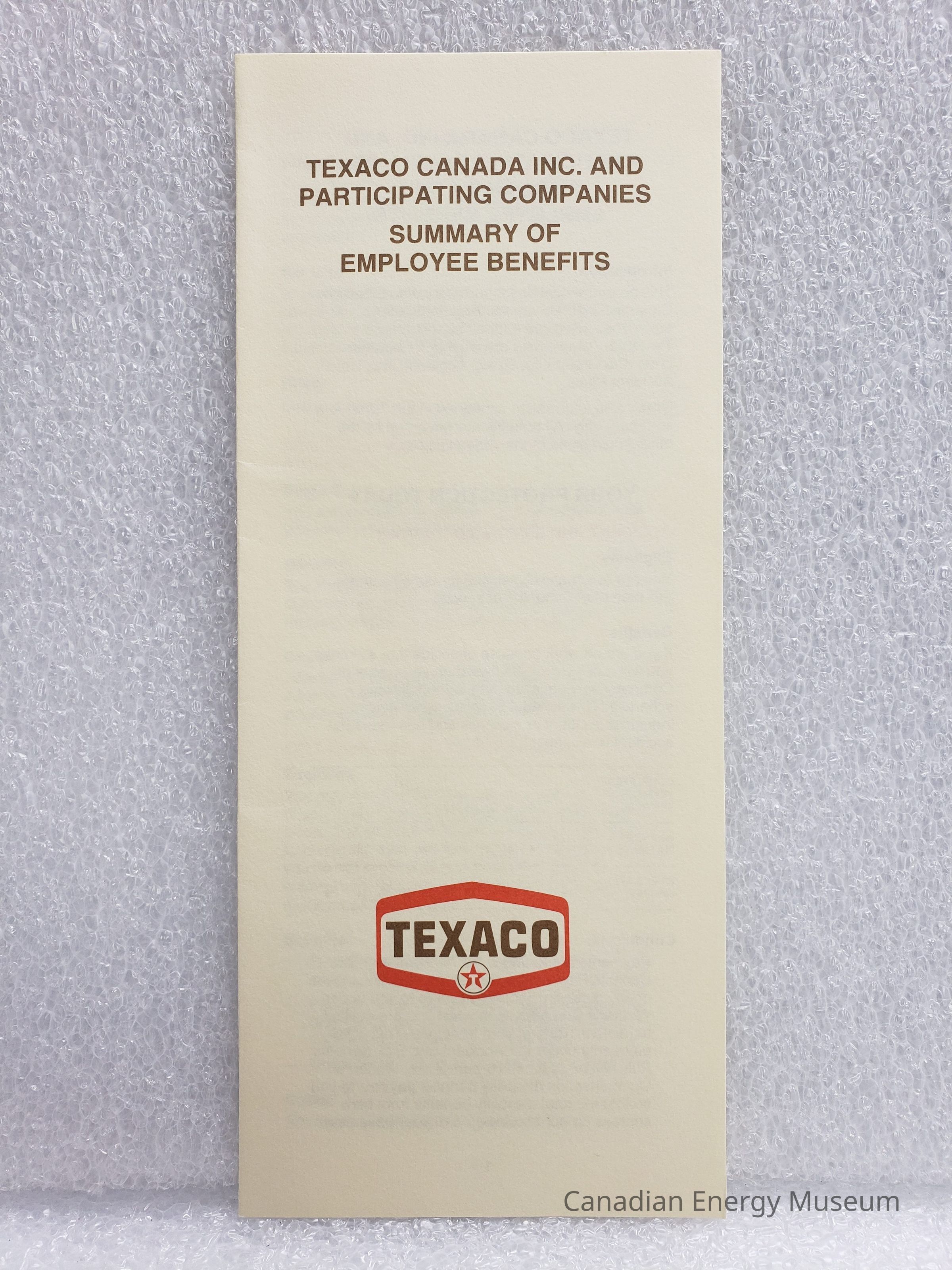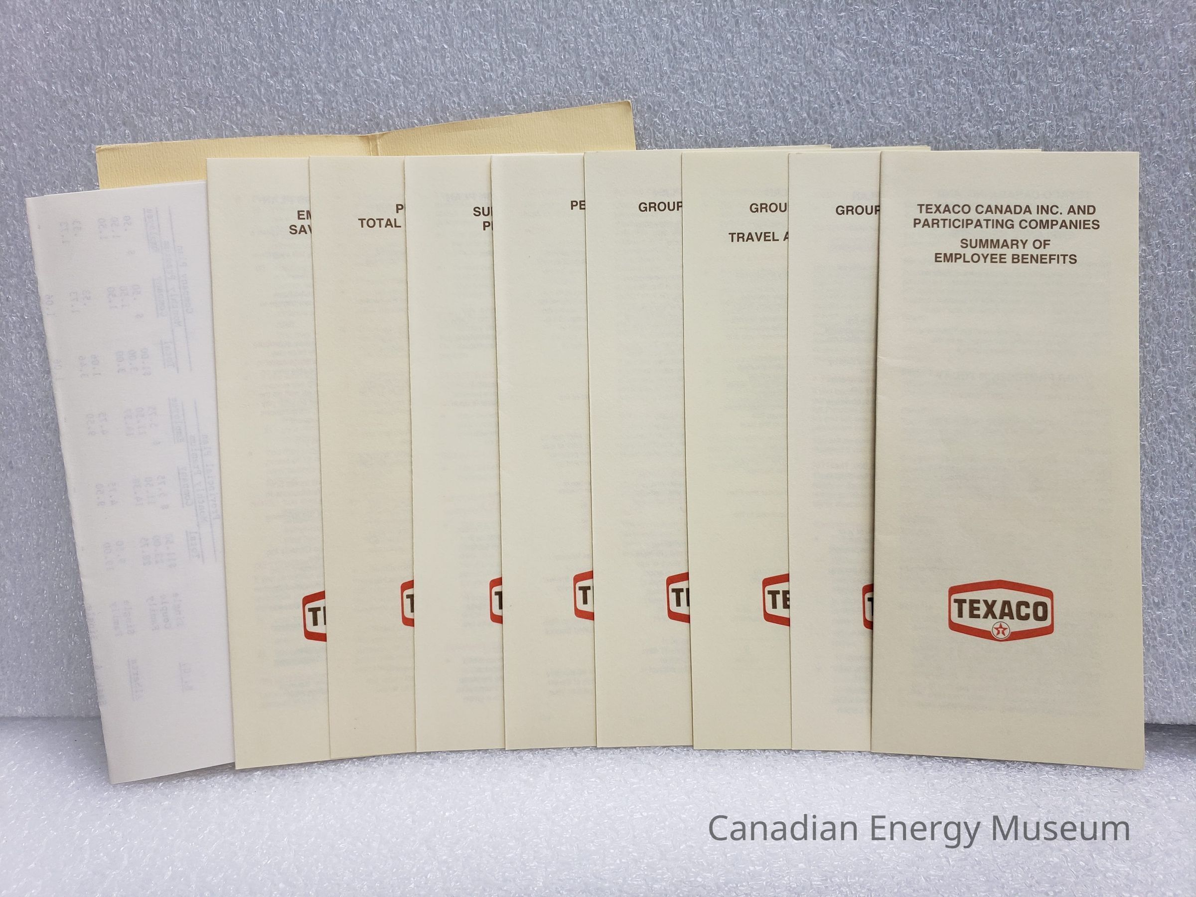 A booklet-sized manilla folder, containing NINE booklets related to Texaco Canada's Employee Benefit Plans, dated to 1982.Collection