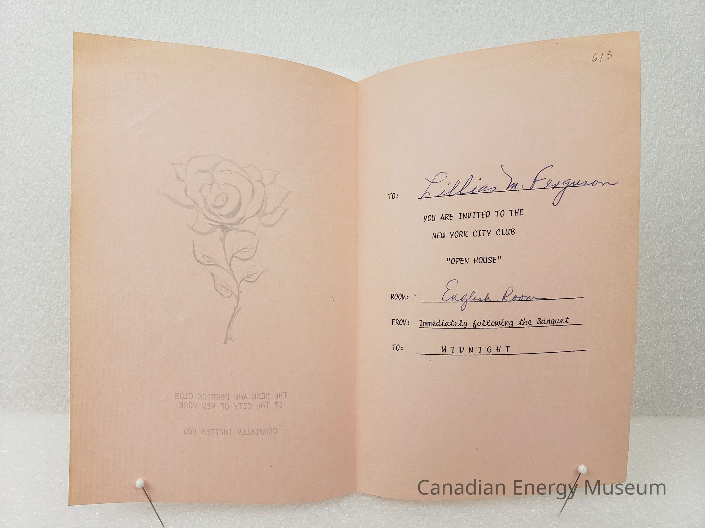 An invitation for the New York City Club "Open House" event (English Room, September 1972), addressed to Lillias M. Ferguson; as part of the Association of Desk and Derrick Clubs Convention, 7-9 September 1972. The cover has an illustration of a rose and the text "The Desk and Derrick Club of the City of New York: Cordially Invites You". The inside has a simple pre-printed invitation form, filled in with blue ballpoint pen.