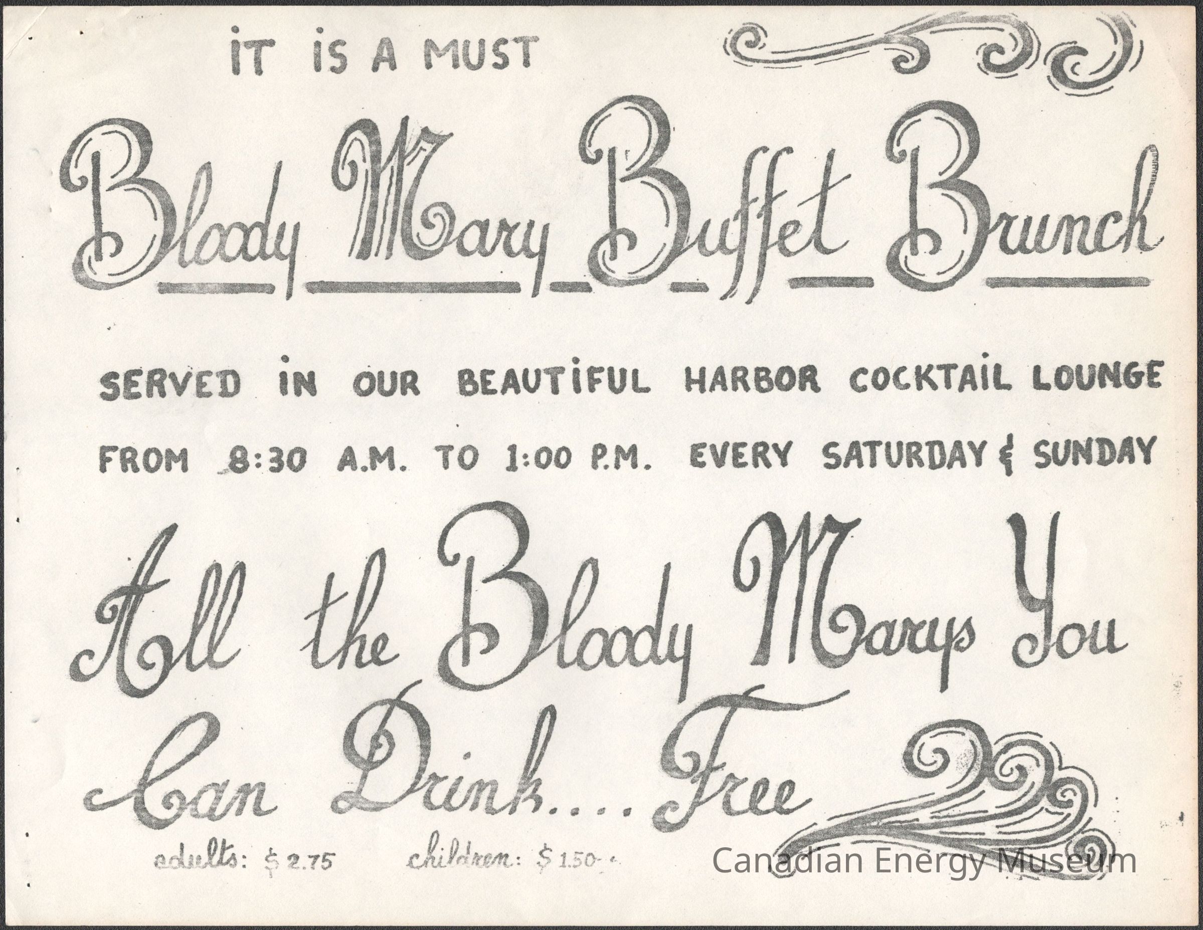 A letter-sized invitation to the Desk and Derrick Club of Anchorage's "Past Progress-- Future Solidarity" Presentation of Candidates, held at the Convention Center of the Sheraton Inn (San Diego) at 8:00 pm on 26 August 1971. Attached by staple is a small slip of paper on the same paperstock with typewritten text. Includes the orange print-put, and a black-and-white photocopy of a poster for the Bloody mary Buffet Brunch held at the Harbor Cocktail Lounge. Coincides with the 1971 Association of Desk and Derrick Clubs of North America's 20th Annual Convention in San Diego. Two sheets were originally stapled together with three staples along the top of the sheets.