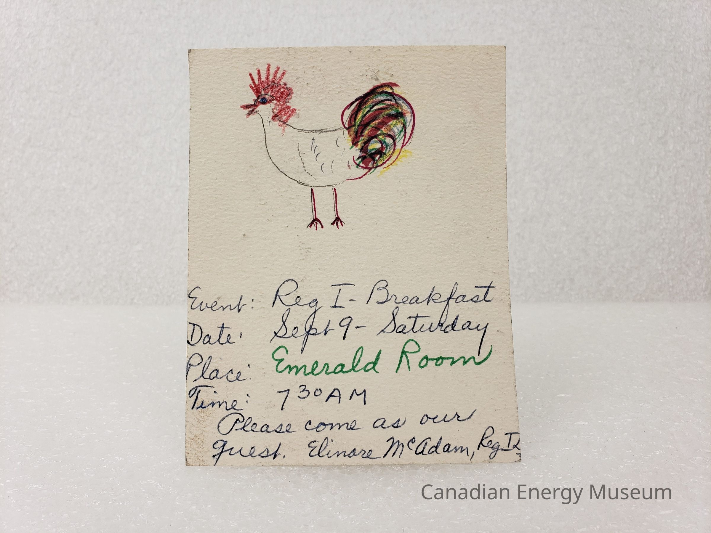An invitation to the Region I Breakfast (Emerald Room, Fairmont Mayo Hotel, 9 September 1972); as part of the Association of Desk and Derrick Clubs Convention, 7-9 September 1972. The invitation is a single-sided card, with a handdrawn illustration of a rooster and handwritten event details in blue ballpoint and green pencil. On the reverse are assorted notes in blue ballpoint.