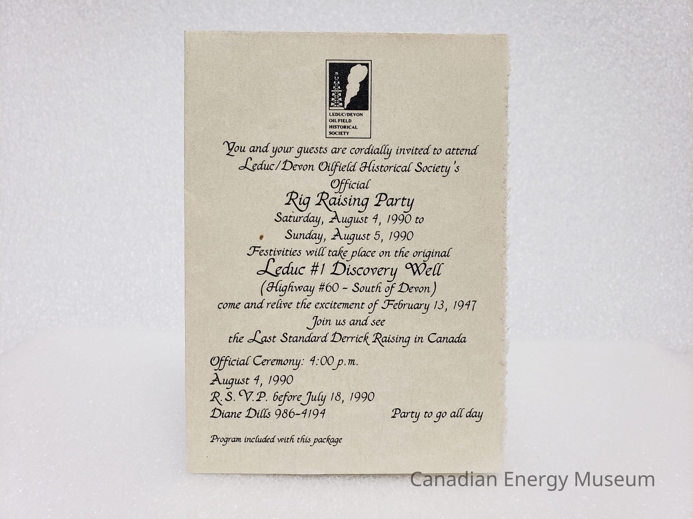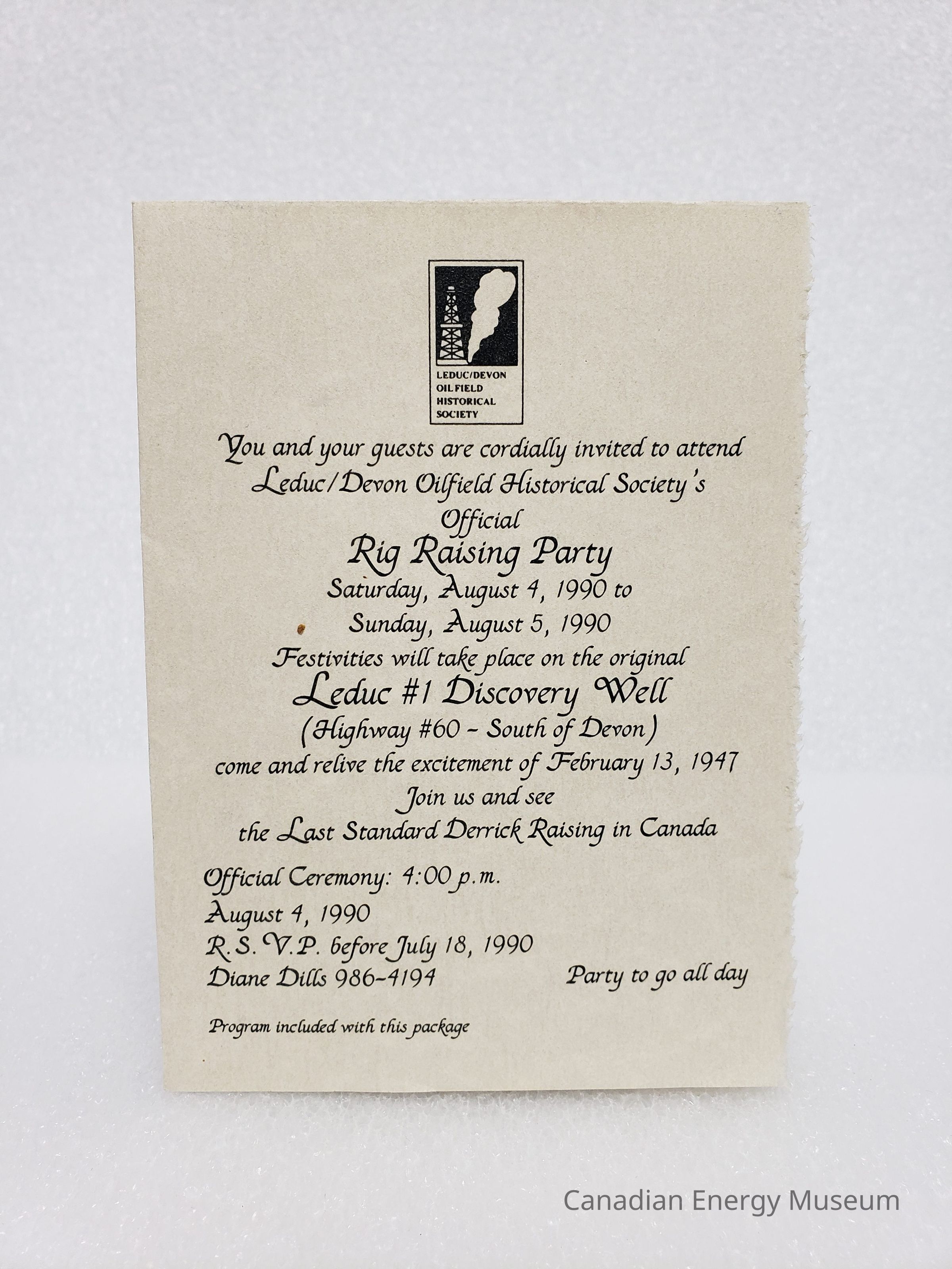 A quarter-fold invitation to the 4-5 August 1990 Rig Raising Party for the installation of the (later) Canadian Energy Museum's conventional oil rig onto the land near to the site of Leduc #1's well.
