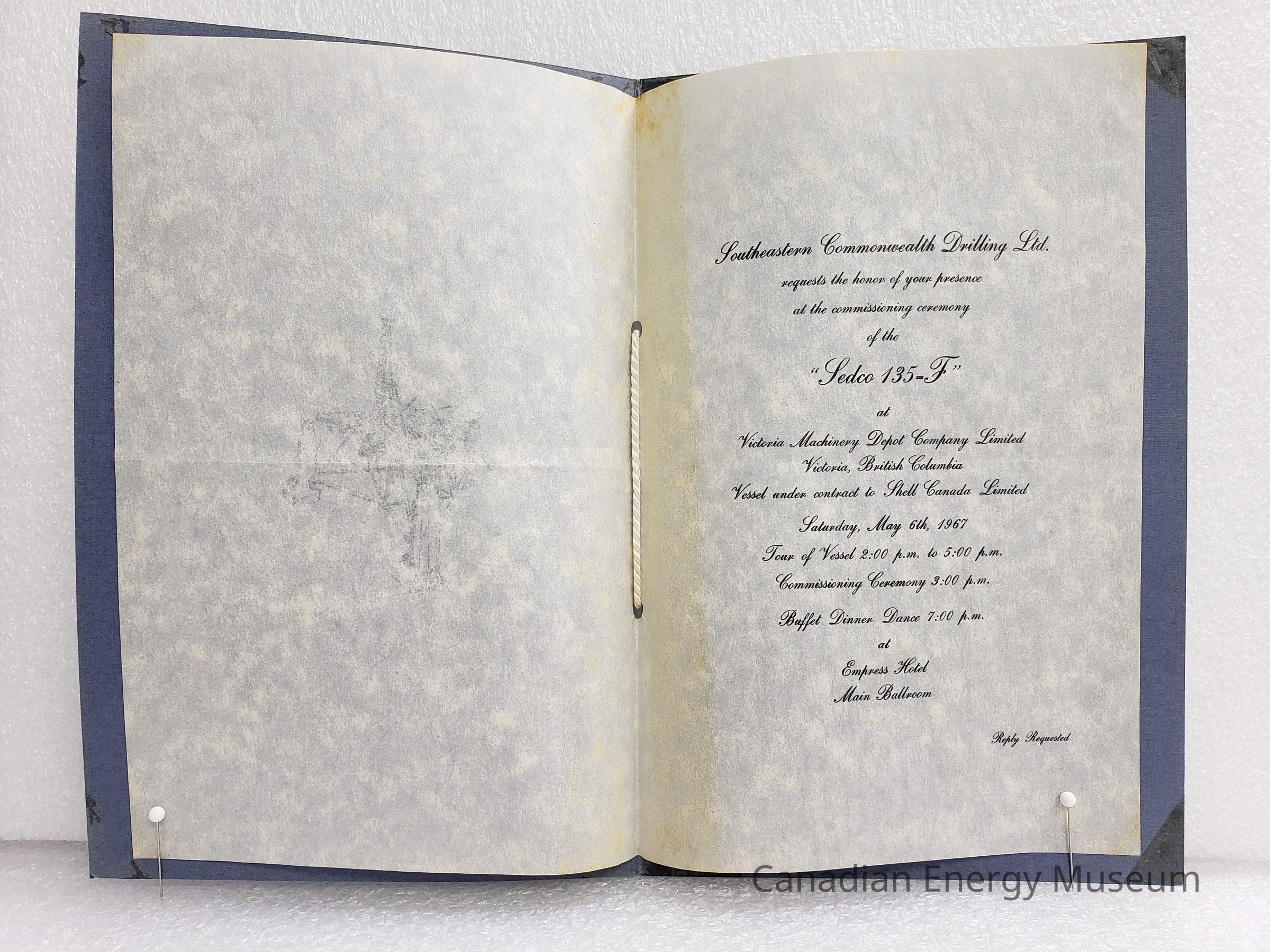 An A5 folio invitation, with blue bard cover, and 2-page velem insert secured with white cord. Invitation to the Sedco 135-F commissioning ceremony, by Southeastern Commonwealth Drilling Ltd/Shell Canada. Held at Empress Hotel.Collection