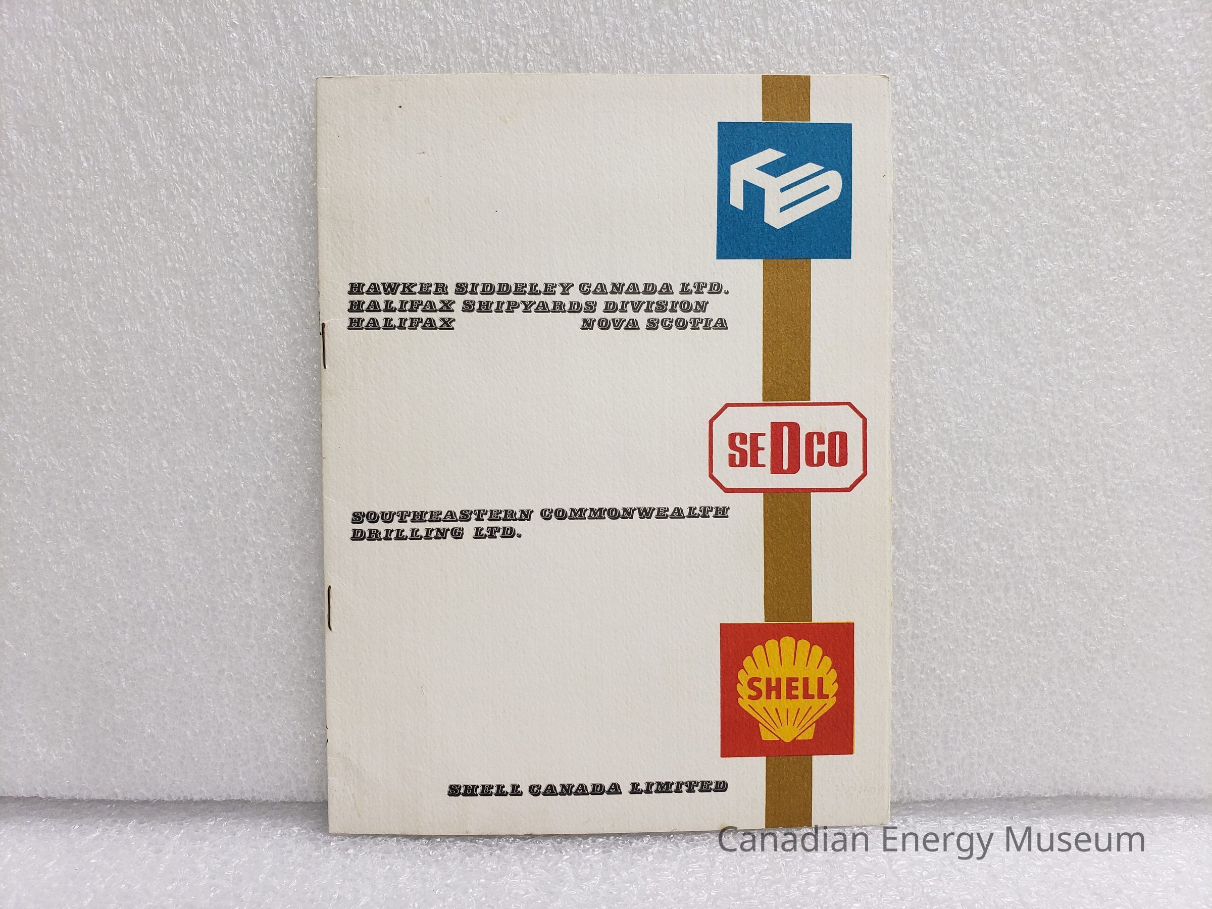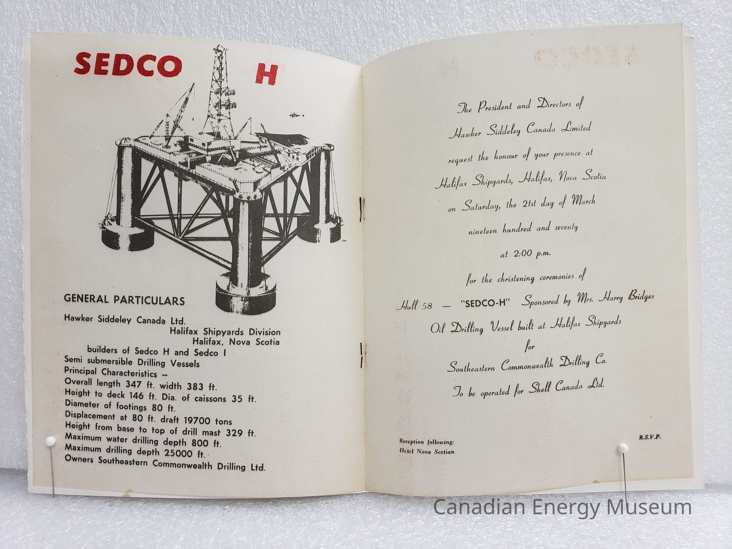 An invitation from the Sedco H Christening Ceremony, 21 March 1970. Connected to Hawker Siddeley Canada Ltd. (Halifax Shipyard Division, Halifax, Nova Scotia); Southeastern Commonwealth Drilling Ltd.; and Shell Canada Limited. White textured card cover, with vellum interior sheet, saddle stitch binding (staple).Collection