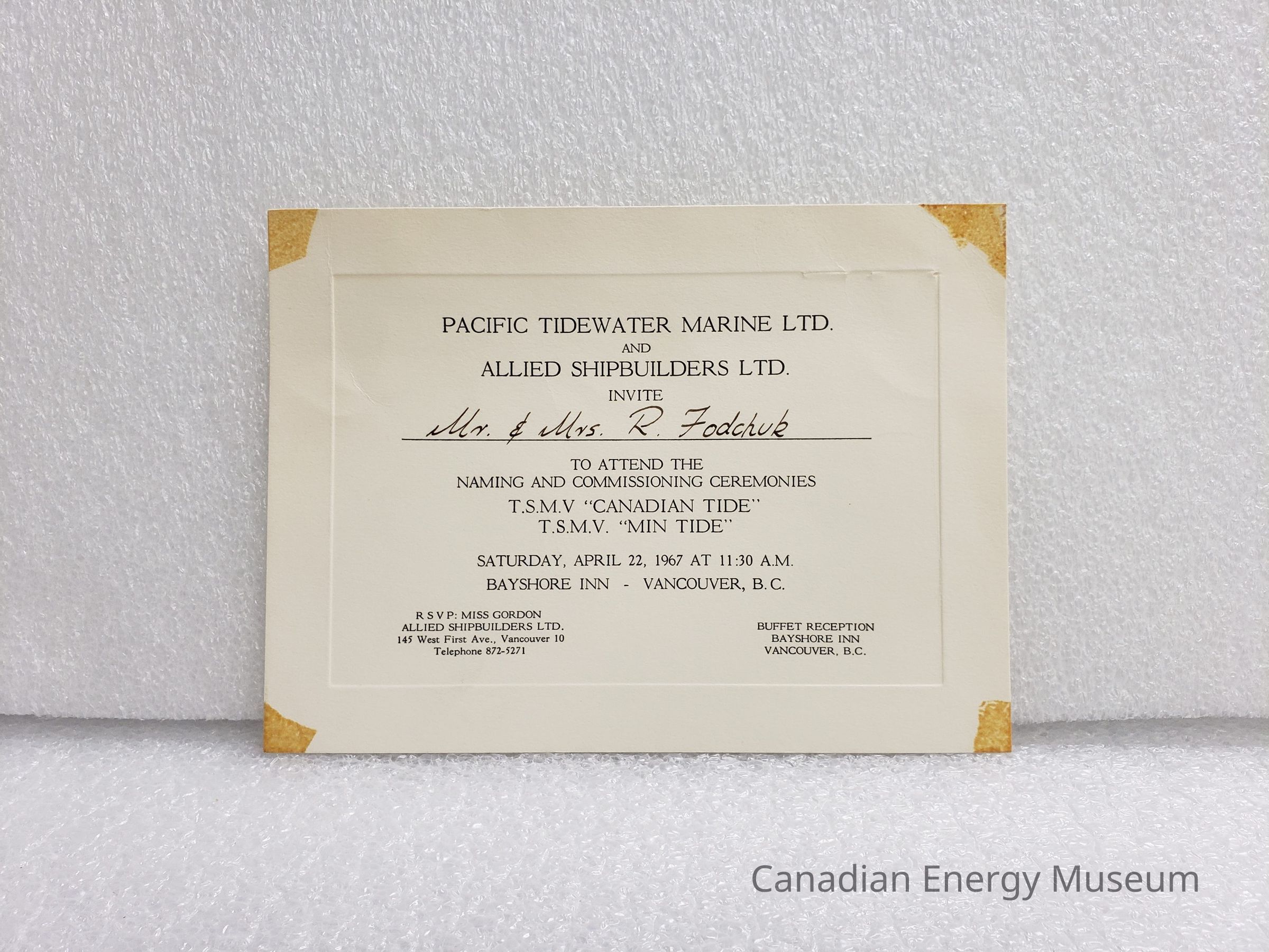 [Invitation] T.S.M.V. "Canadian Tide" and T.S.M.V. "Min Tide" Commissioning Ceremony, Pacific Tidewater Marine Ltd. And Allied Shipbuilders Ltd., R. Fodchuk, 22 April, 1967Entry/Object ID