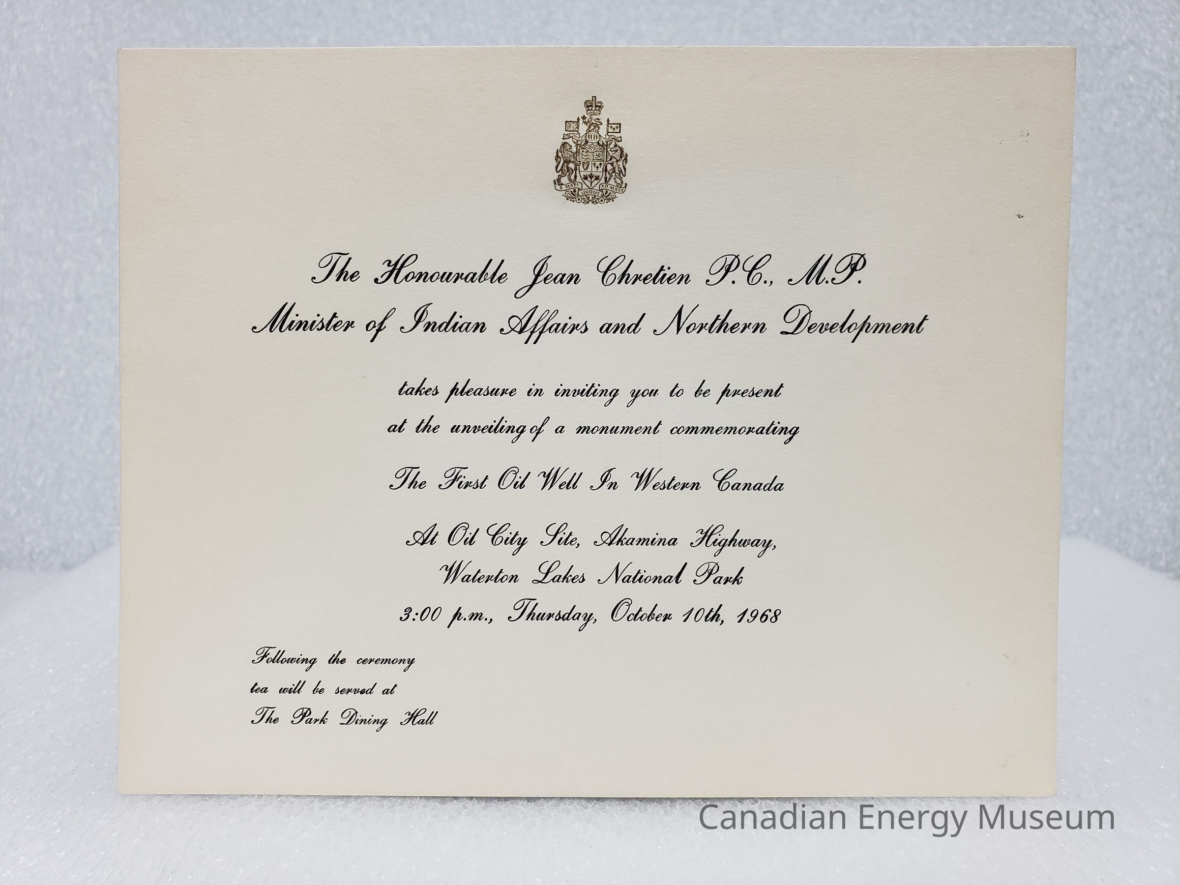 [Invitation] The First Oil Well In Western Canada, Mr. & Mrs. G.H. Stafford, Department of Indian Affairs and Northern Development, w/ Envelope and TWO PhotographsEntry/Object ID