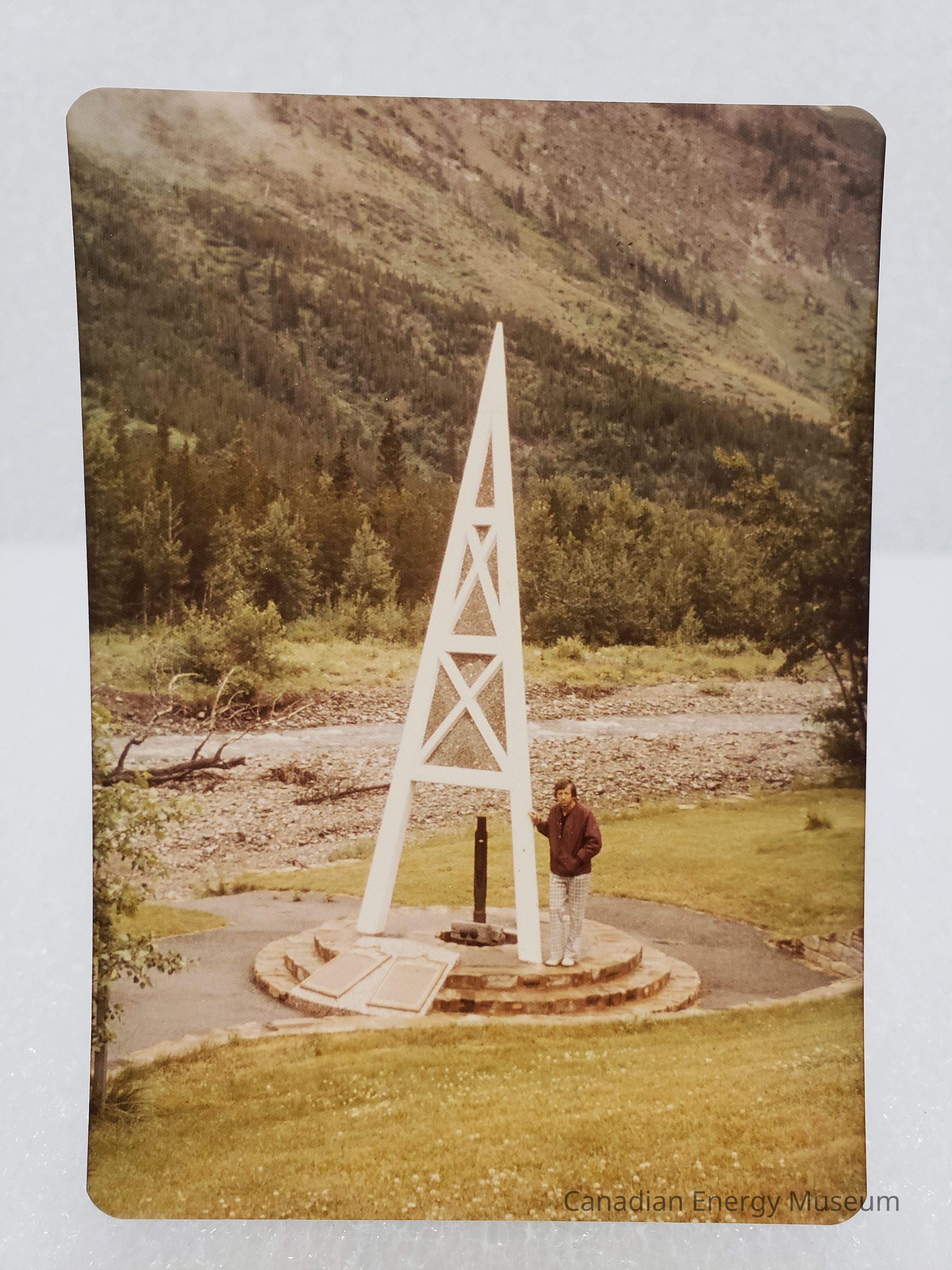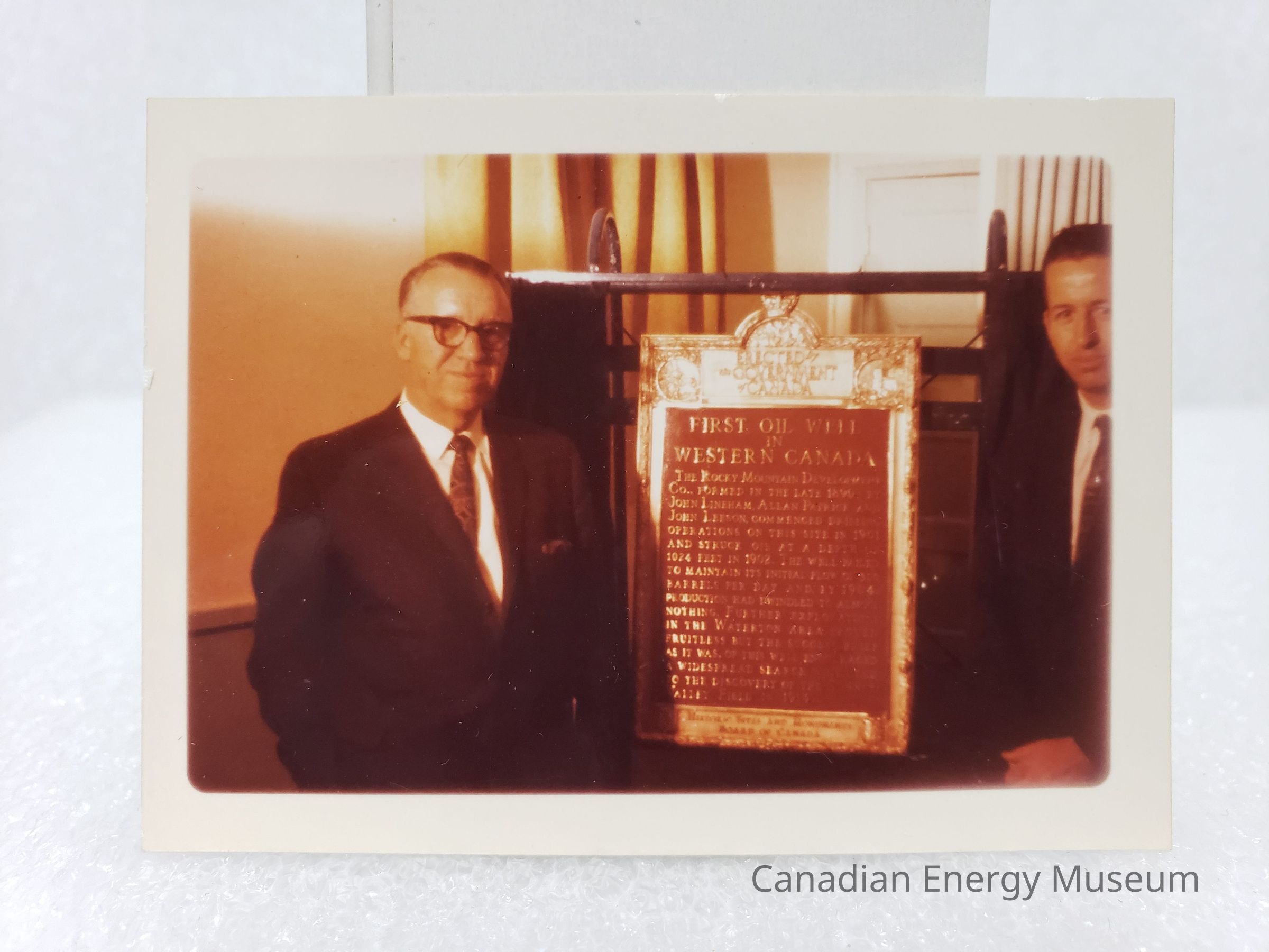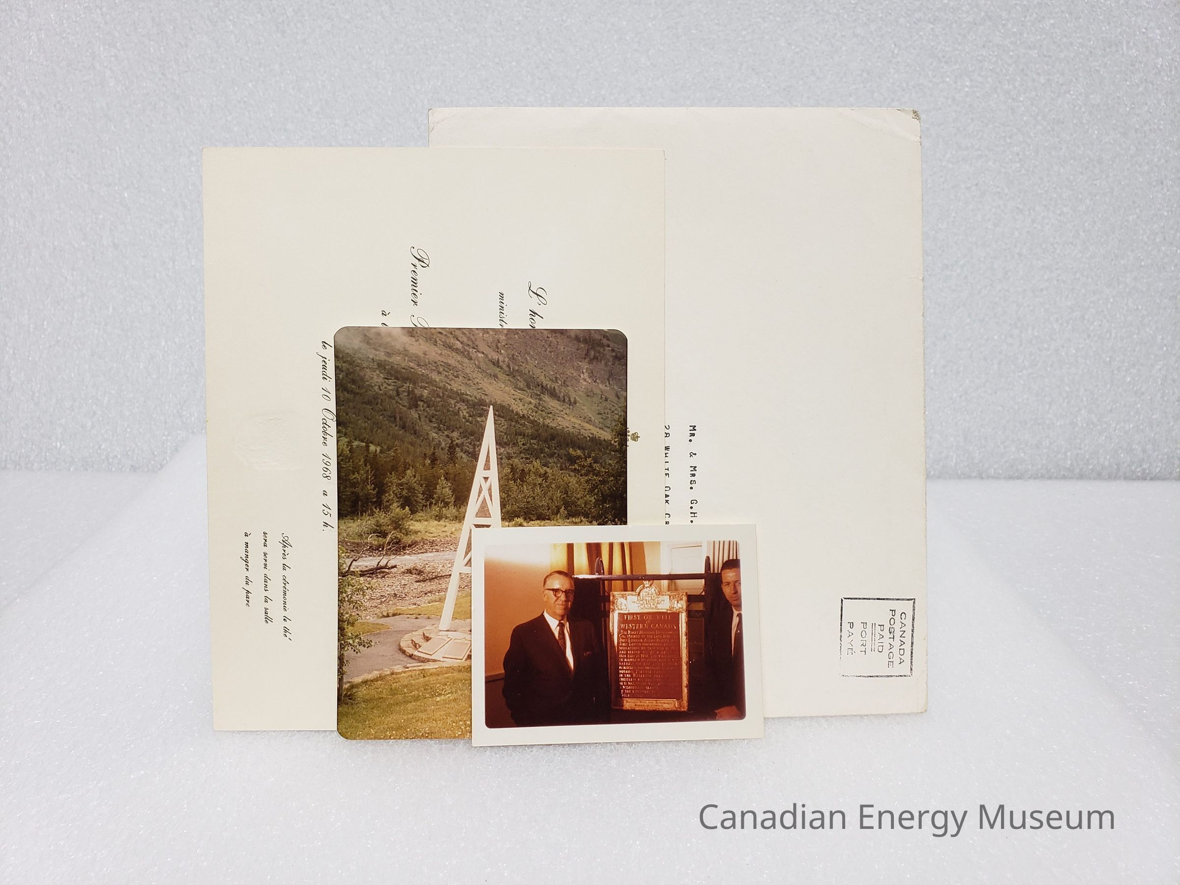 Accompanying the invitation is also a pair of photographs, assumedly from the event. The first is a small portrait-orientated, woven-texture matte, image of the monument (a stylised oil derrick) with a man posted beside it (brown jacket and checkered pants). The second is a small landscape-orientated, glossy, white-bordered, image of TWO men posed beside a commemorative plaque for the First Oil Well in Western Canada.Collection
