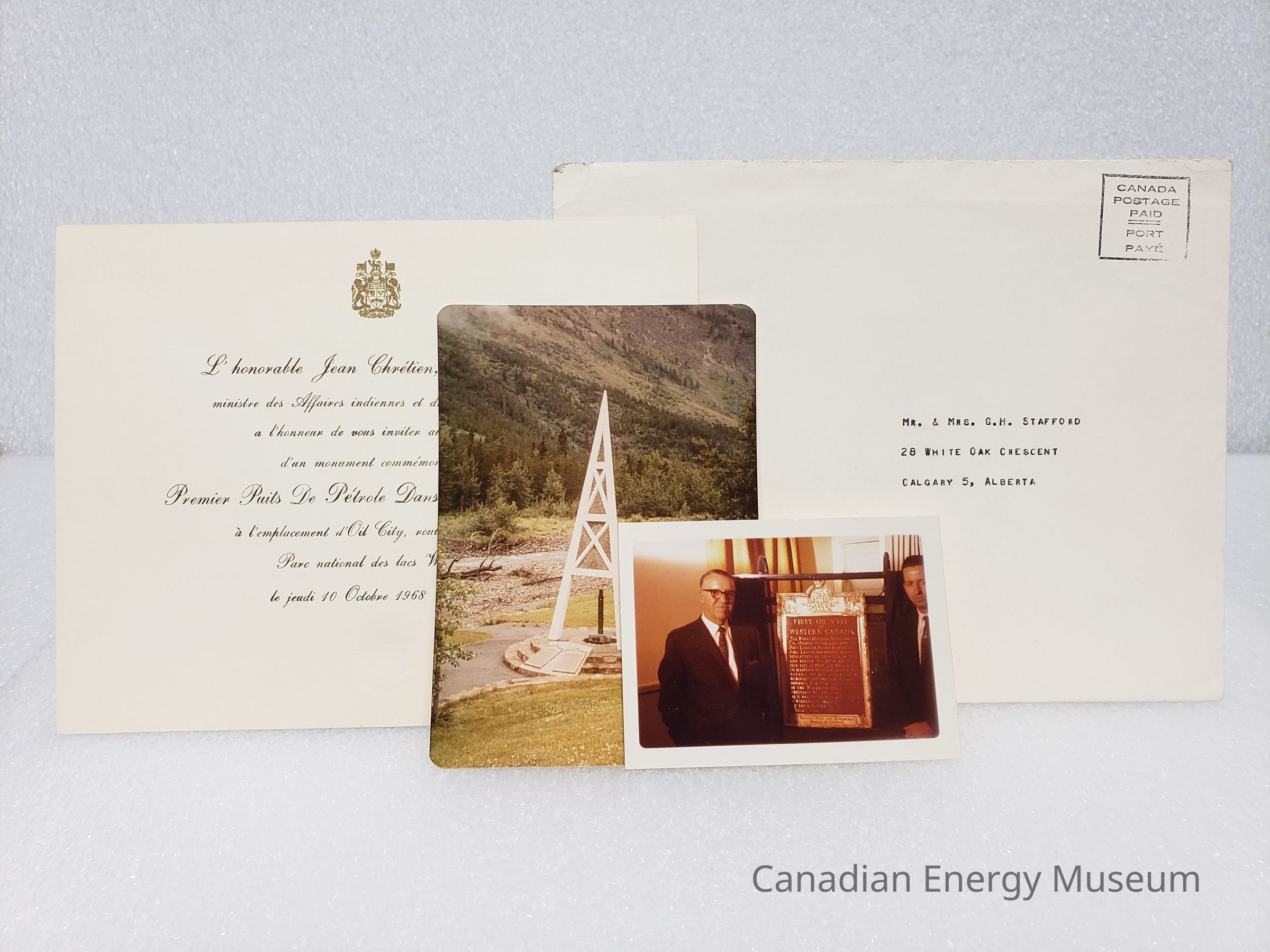 An invitation accompanied by an addressed envelope and two photographs. The invitation is addressed to Mr. & Mrs. G.H. Stafford, for the unavailing of a monument commemorating The First Oil Well in Western Canada, on Thursday 10 October 1968, Oil City Site, Akamina Highway, Waterton Lakes National Park. The invitation has a printed script in black ink and a gold emblem, with English on one side and French on the other.