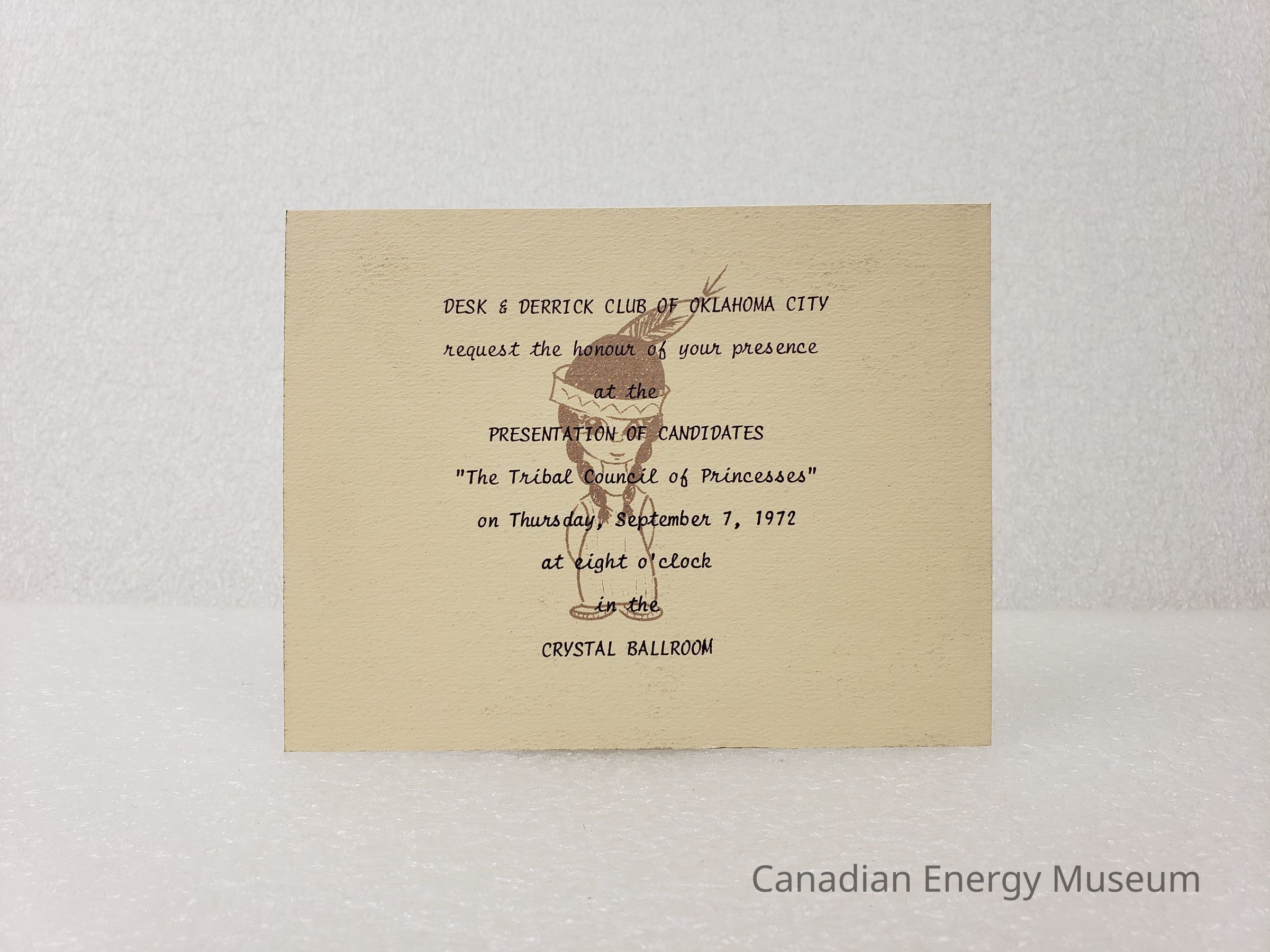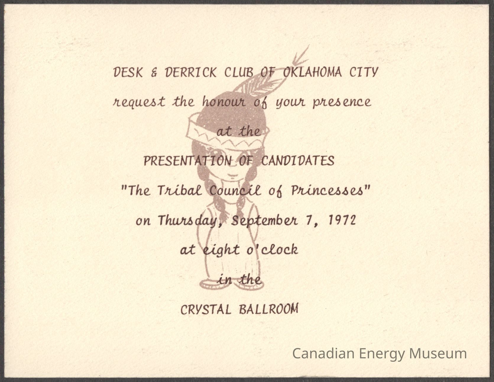 An invitation for "The Tribal Council of Princesses" presentation of candidates event held by the Desk and Derrick Club of Oklahoma City (Crystal Ballroom, Fairmont Mayo Hotel, 7 September 1972); as part of the Association of Desk and Derrick Clubs Convention, 7-9 September 1972. The invitation is a single-sided card, with an illustration of a Native American girl caricature, over which is the invitation text.