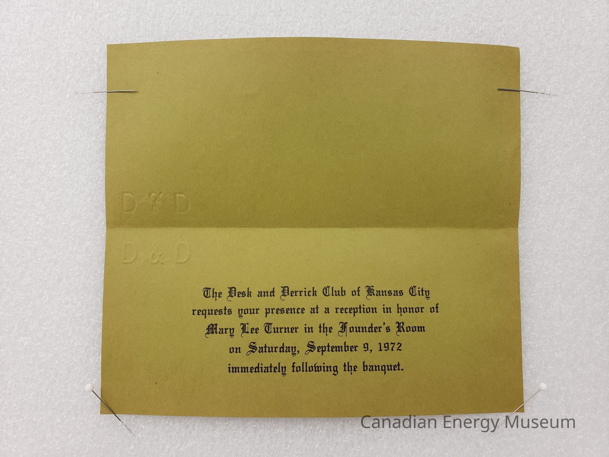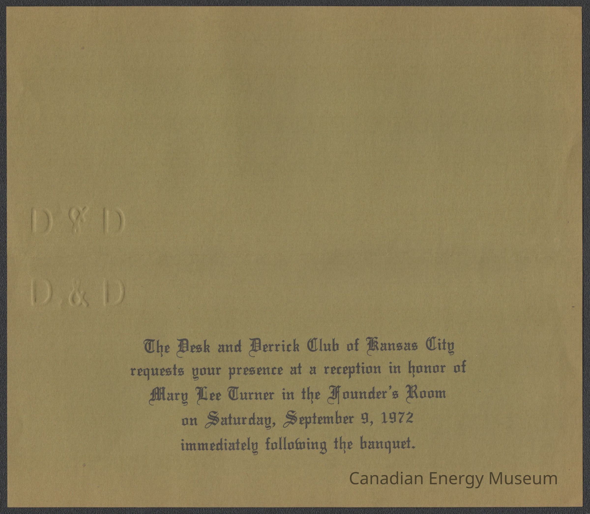 An invitation for a reception in honor of Mary Lee Turner, being held by the Desk and Derrick Club of Kansas City (Founder's Room, 9 September 1972); as part of the Association of Desk and Derrick Clubs Convention, 7-9 September 1972. The cover has the printed text "You are invited..." in gothic font in the bottom-right corner, and in handwritten black ballpoint is "Lillias M. Ferguson" in the centre. On the inside is the event details, printed in black gothic font.