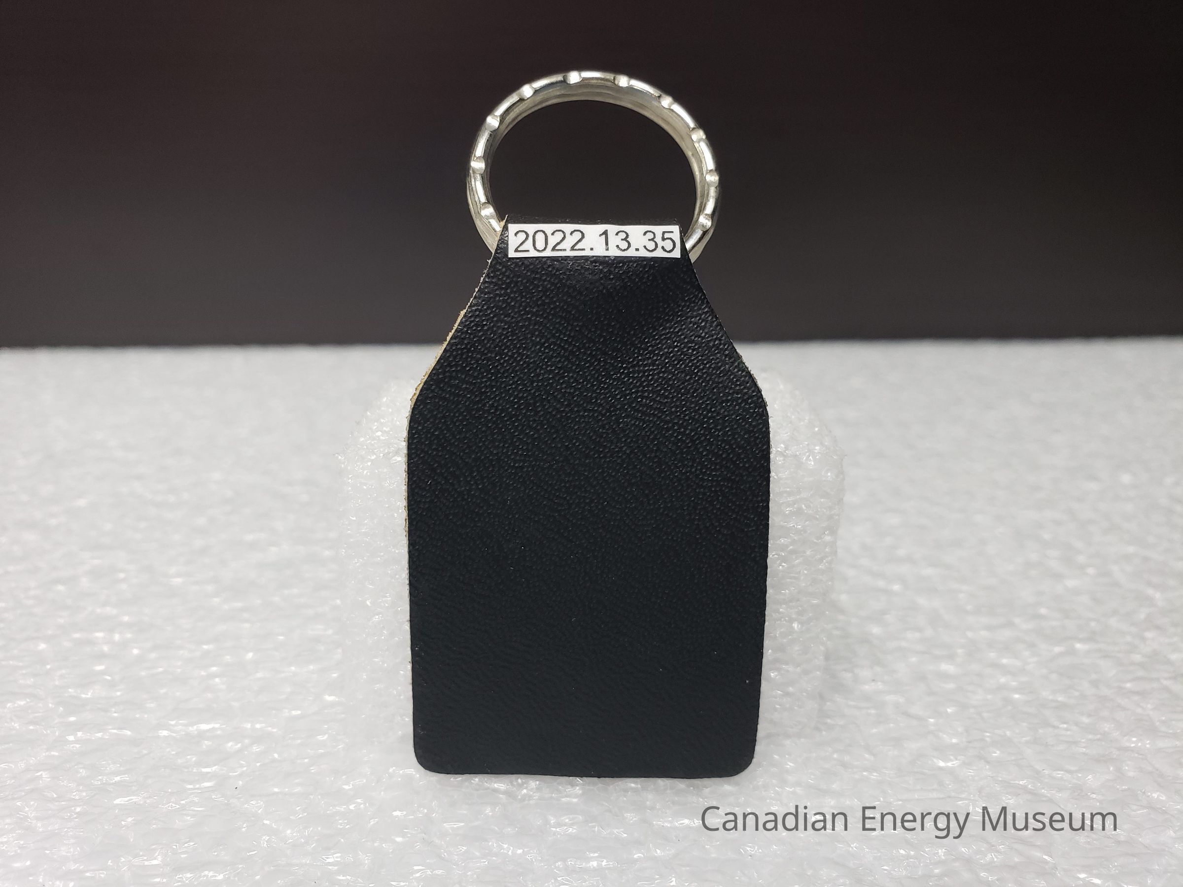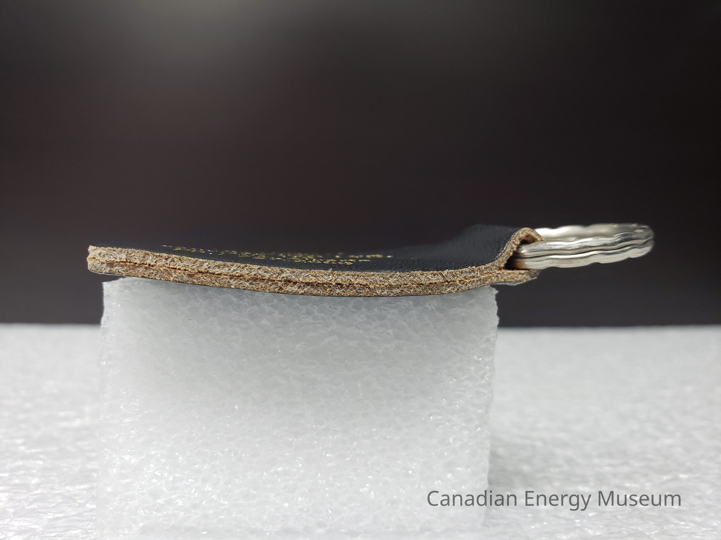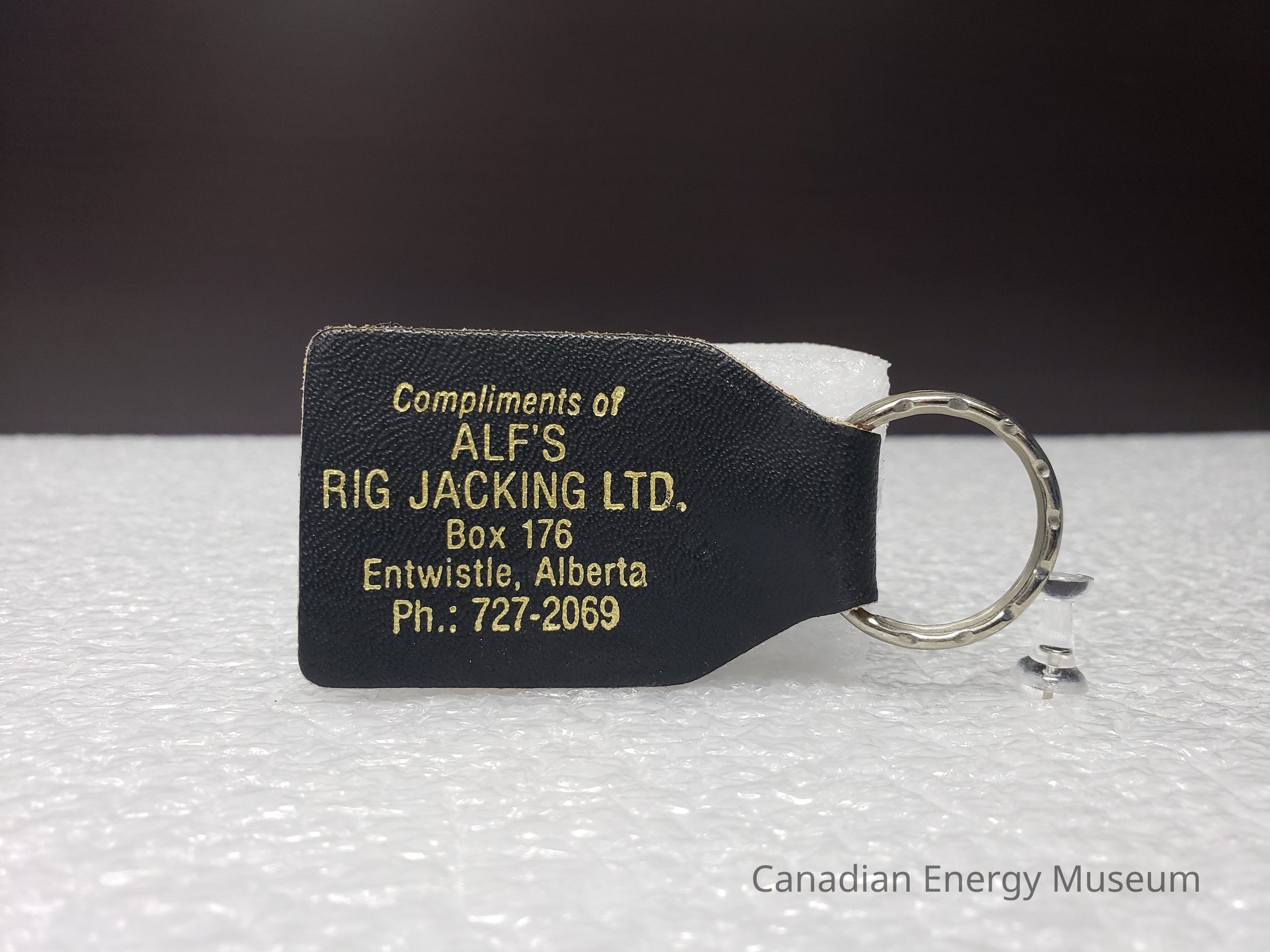 Old Description (Kelsey Steil, 5/24/2022): Key chain with black leather fob. Gold text on one side reads: Compliments of / Alf's Rig Jacking Ltd. / Box 176 / Entwistle, Alberta / Ph: 727-2069.Collection