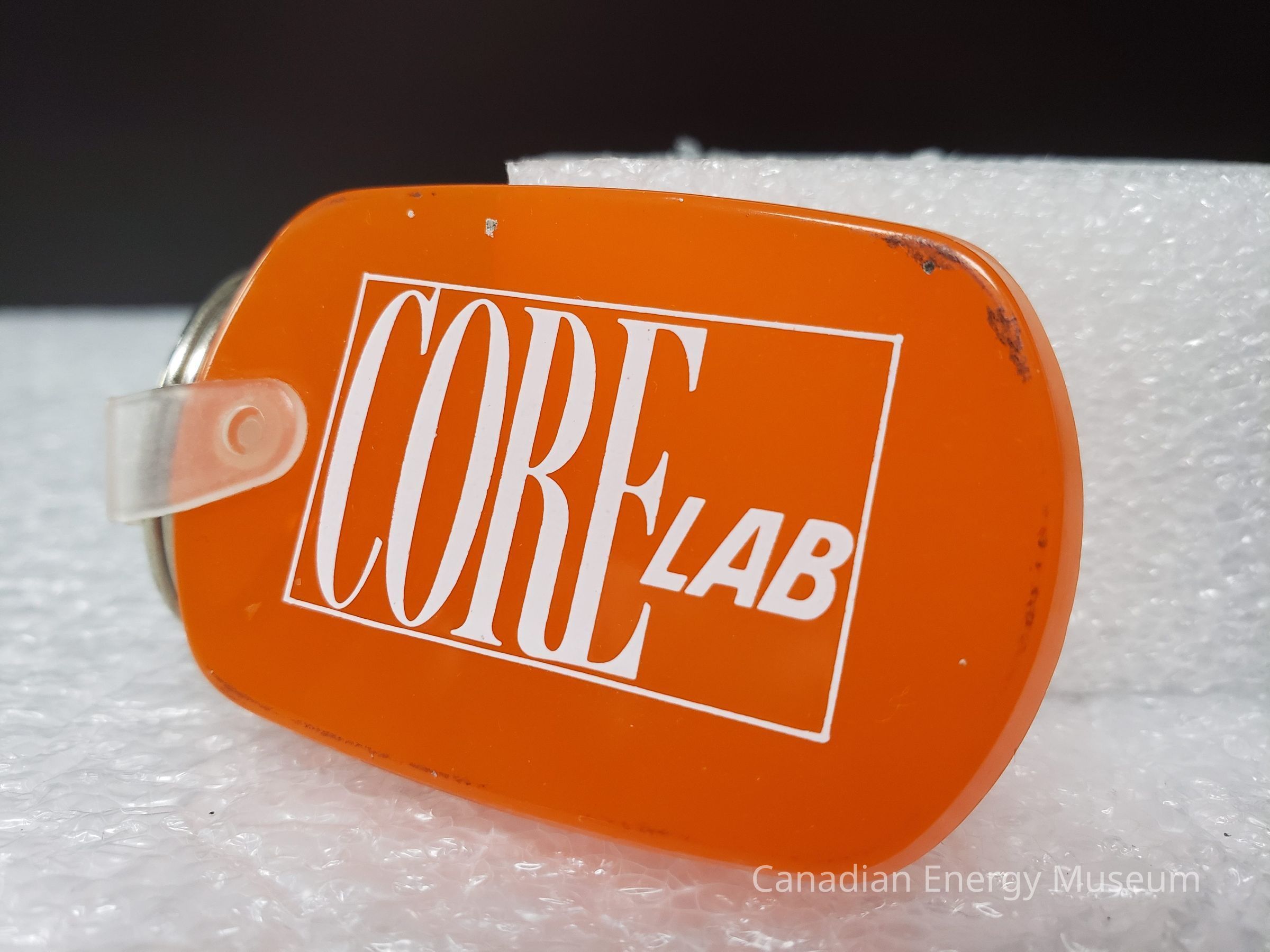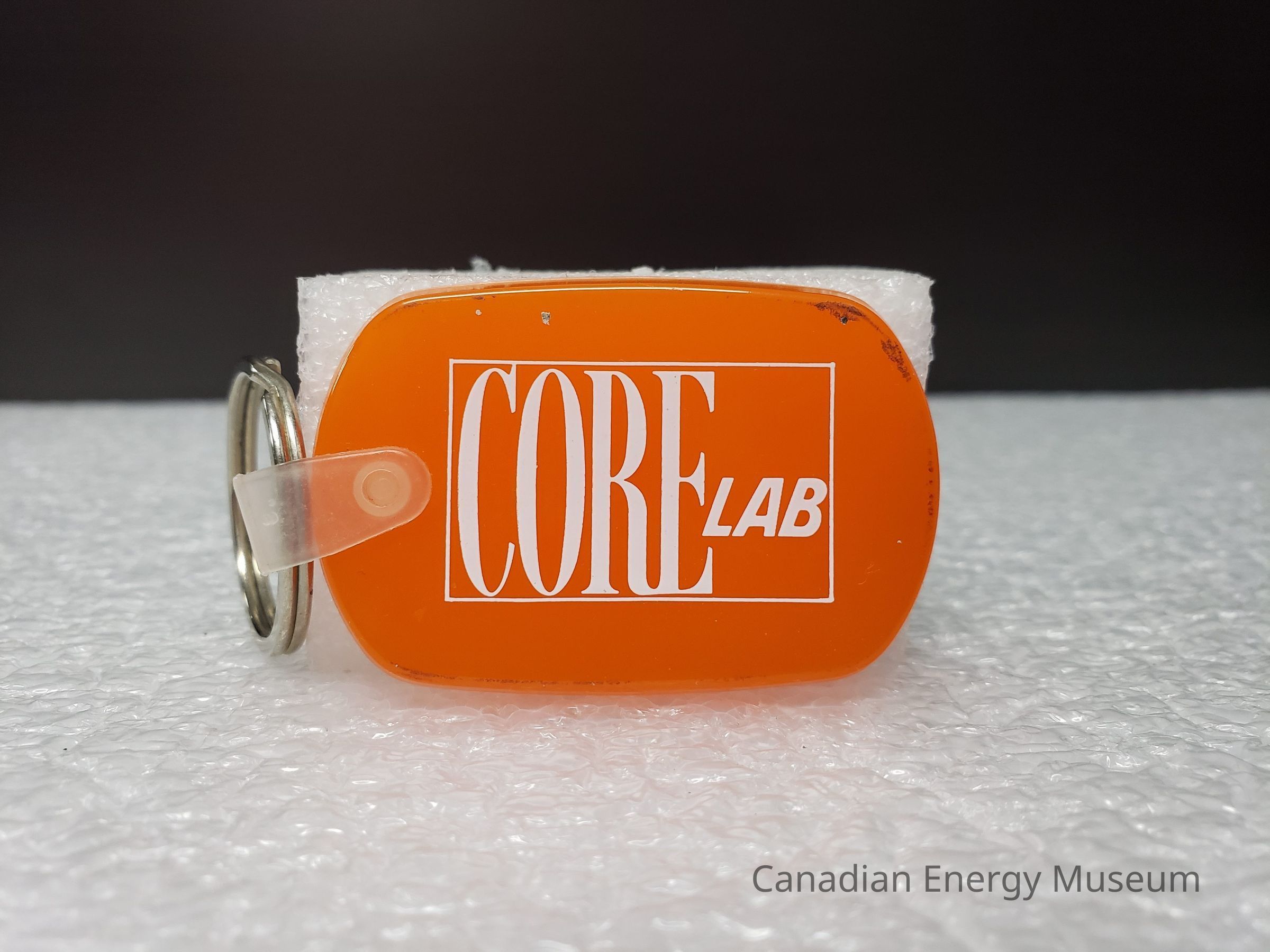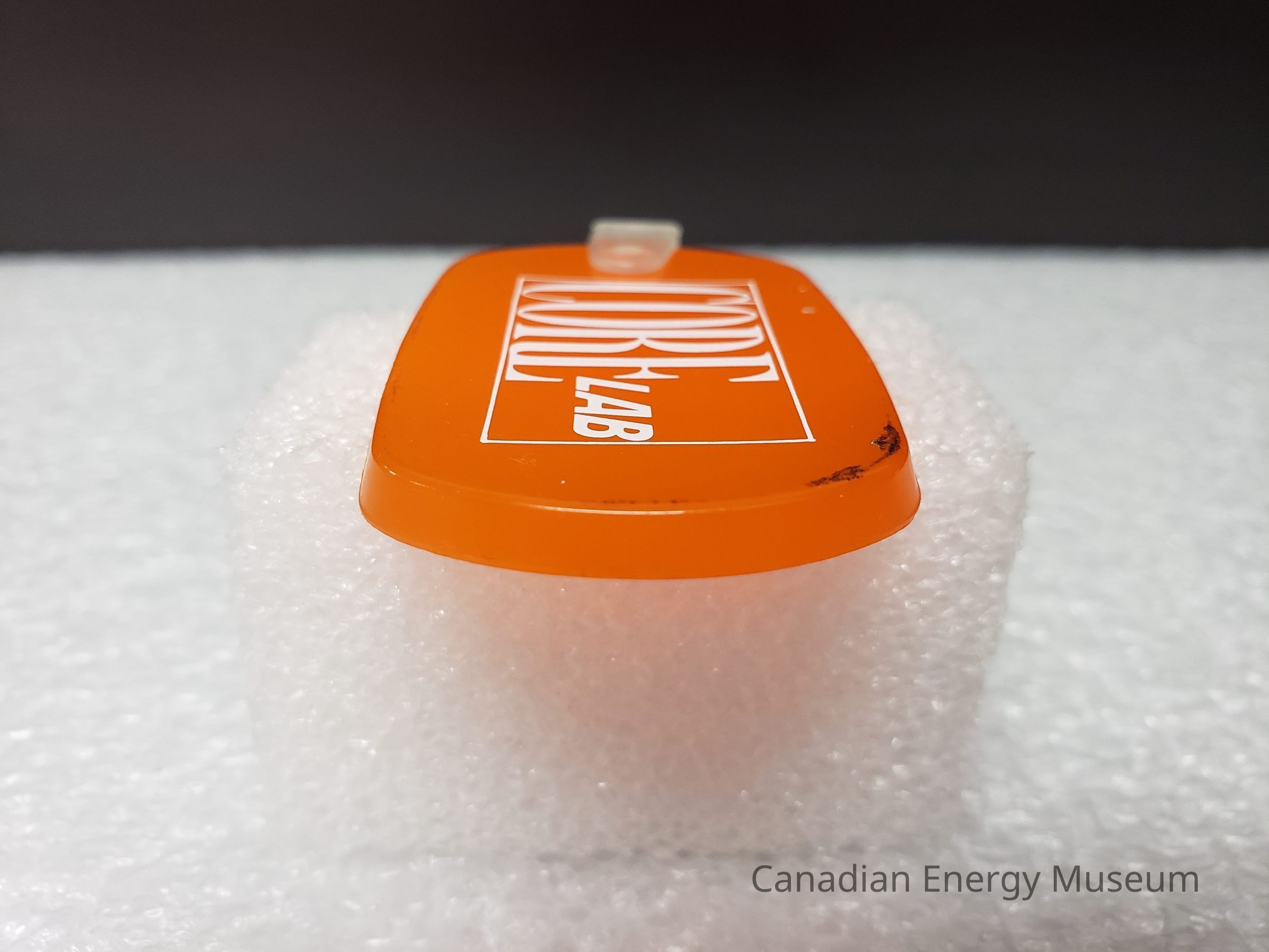 Fob: An oval/stadium-shaped piece of rubber/plastic, in a translucent orange, with white print. In the middle of the fob (front) is a fine outline of a rectangle, in which is the tall serif text "CORE" that fills the first 2/3rds of the rectangle, and to the right in smaller block, angled, sans serif font is "LAB". On the left side is attached a piece of frosted clear plastic, attached on both sides of the fob, and through which is looped the keyring.