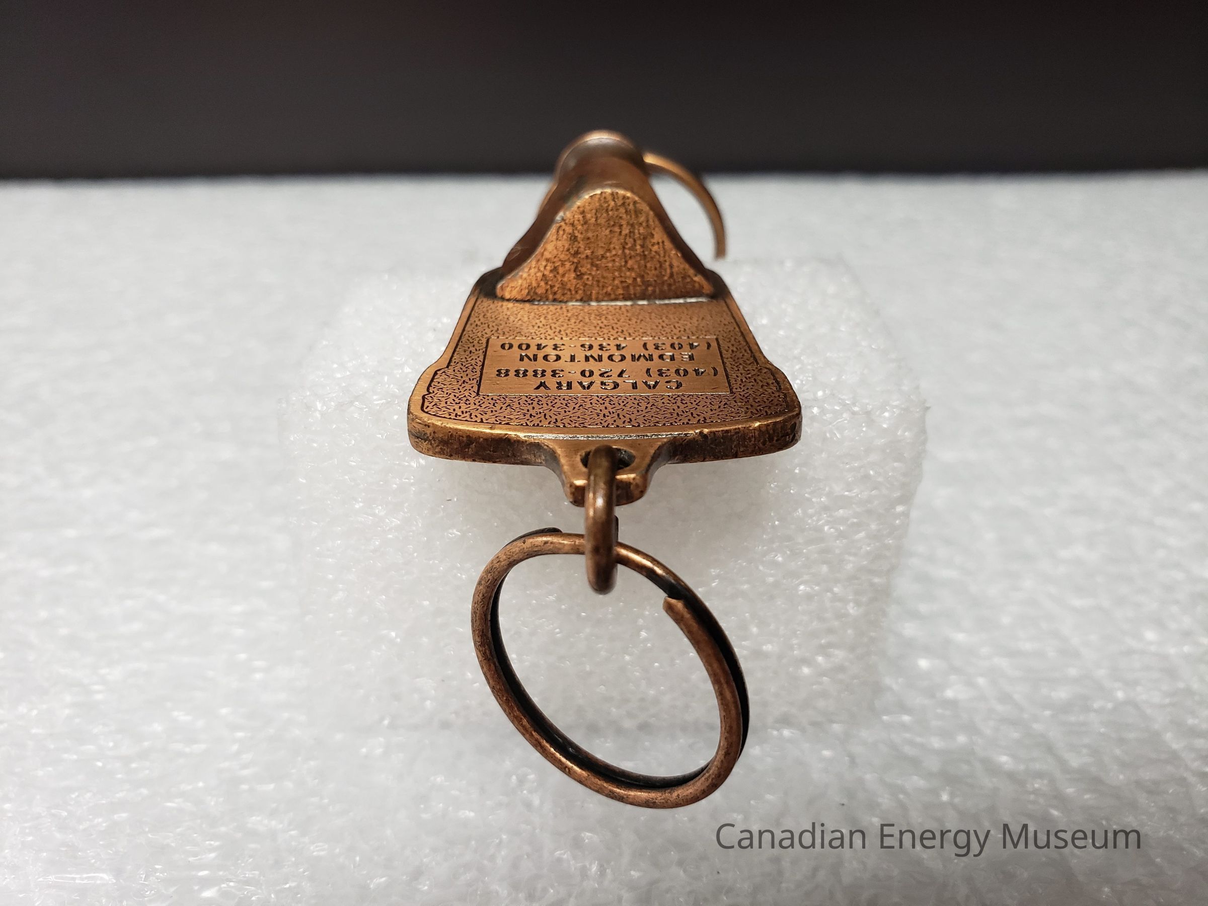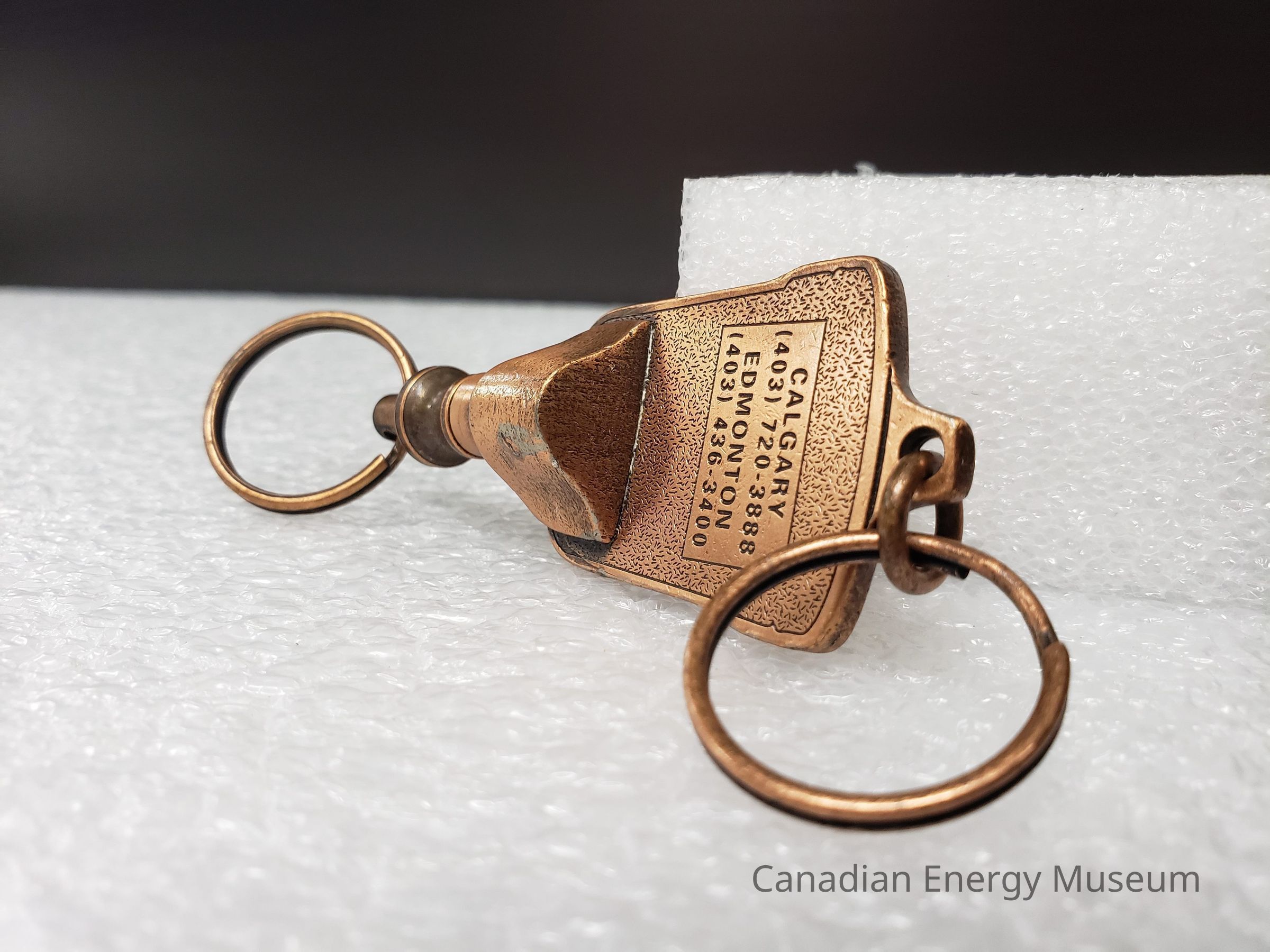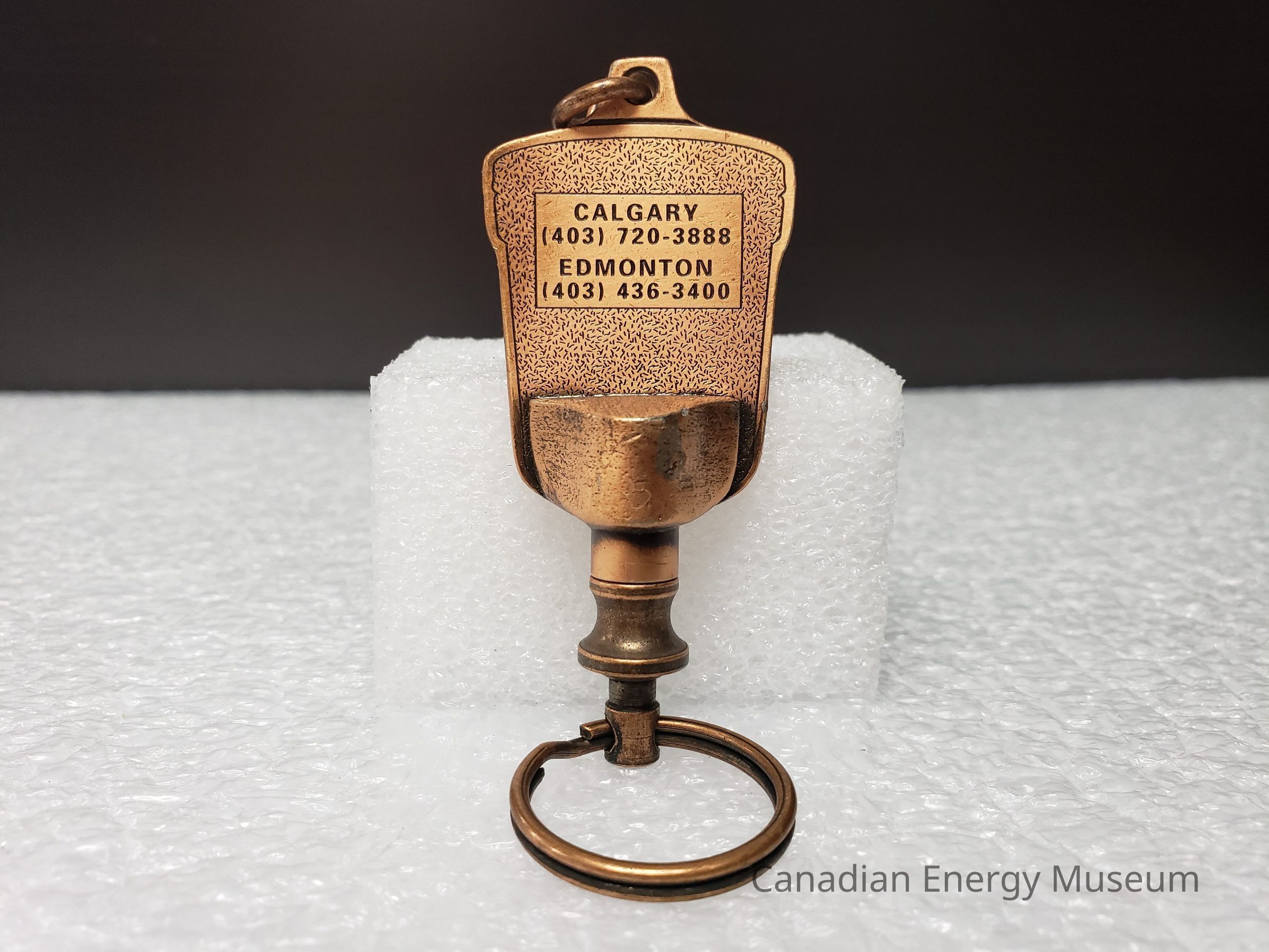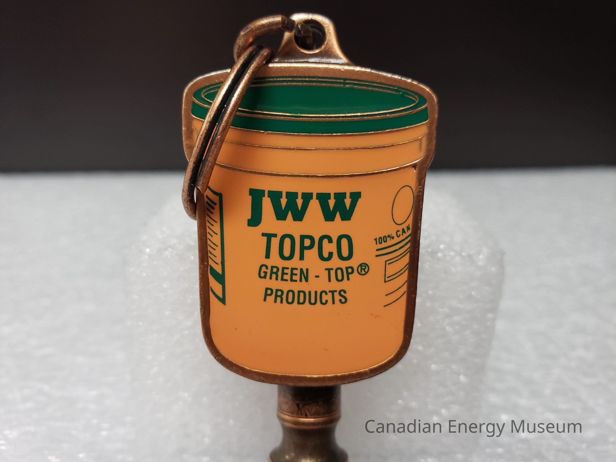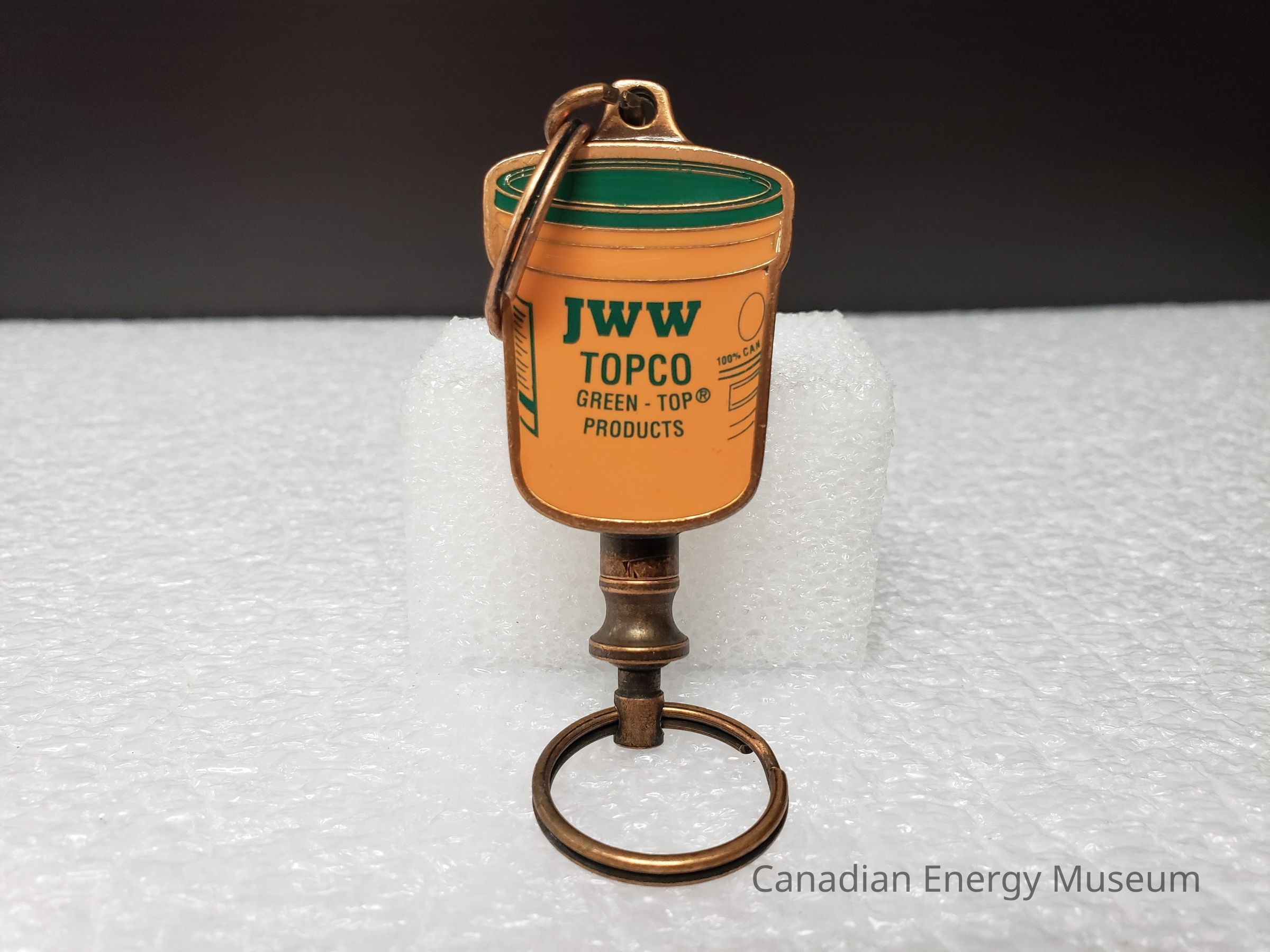 Features: A dual-ended metal keychain, with an antique-copper finish and enamel colour fill (orange and green). The central element is an image of a container of TOPCO's JWW rotary joint compound, coloured in orange, with green text and detailing. Text reads "JWW TOPCO; GREEN-TOP PRODUCTS". At the top of the image is a tab of metal on which the top keyring is attached via a jump ring. At the bottom, attached via the back, is a mechanism with 360-degree rotation and spring compression, to which the keyring is attached with a jump ring. On the back of the keychain, the surface has a micro-dash pattern texture, along with a rectangle surrounding the debossed text "CALGARY; (403)720-3888; EDMONTON; (403) 236-3400".