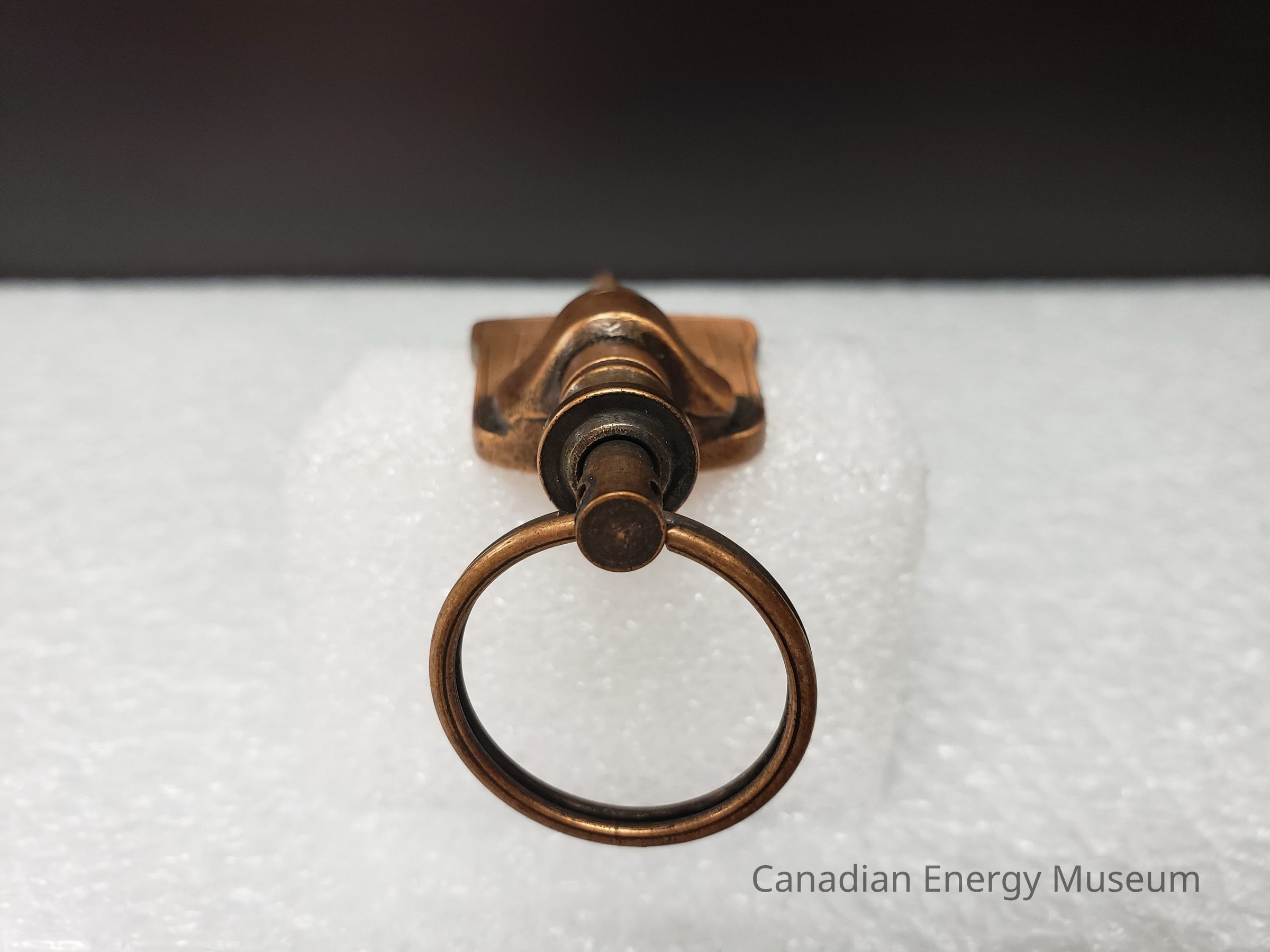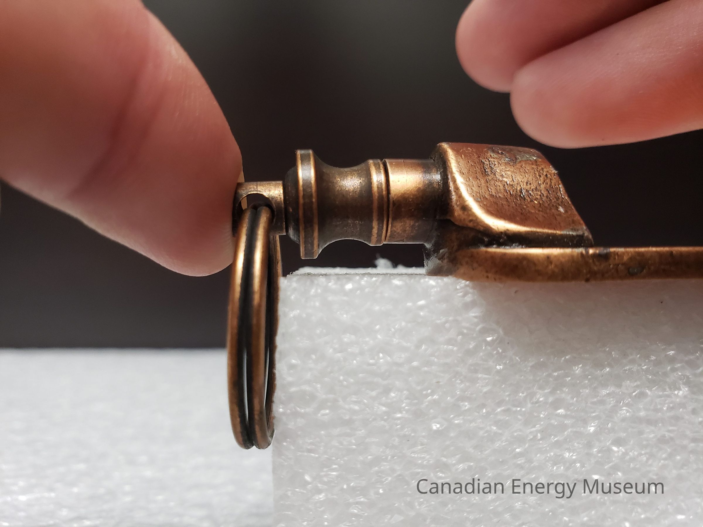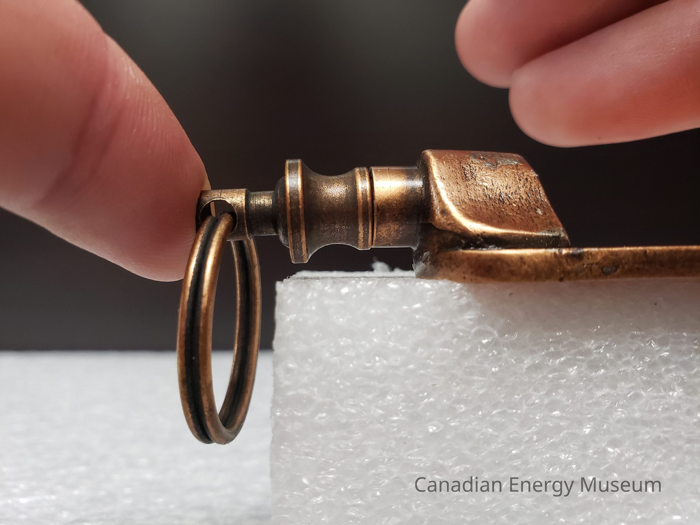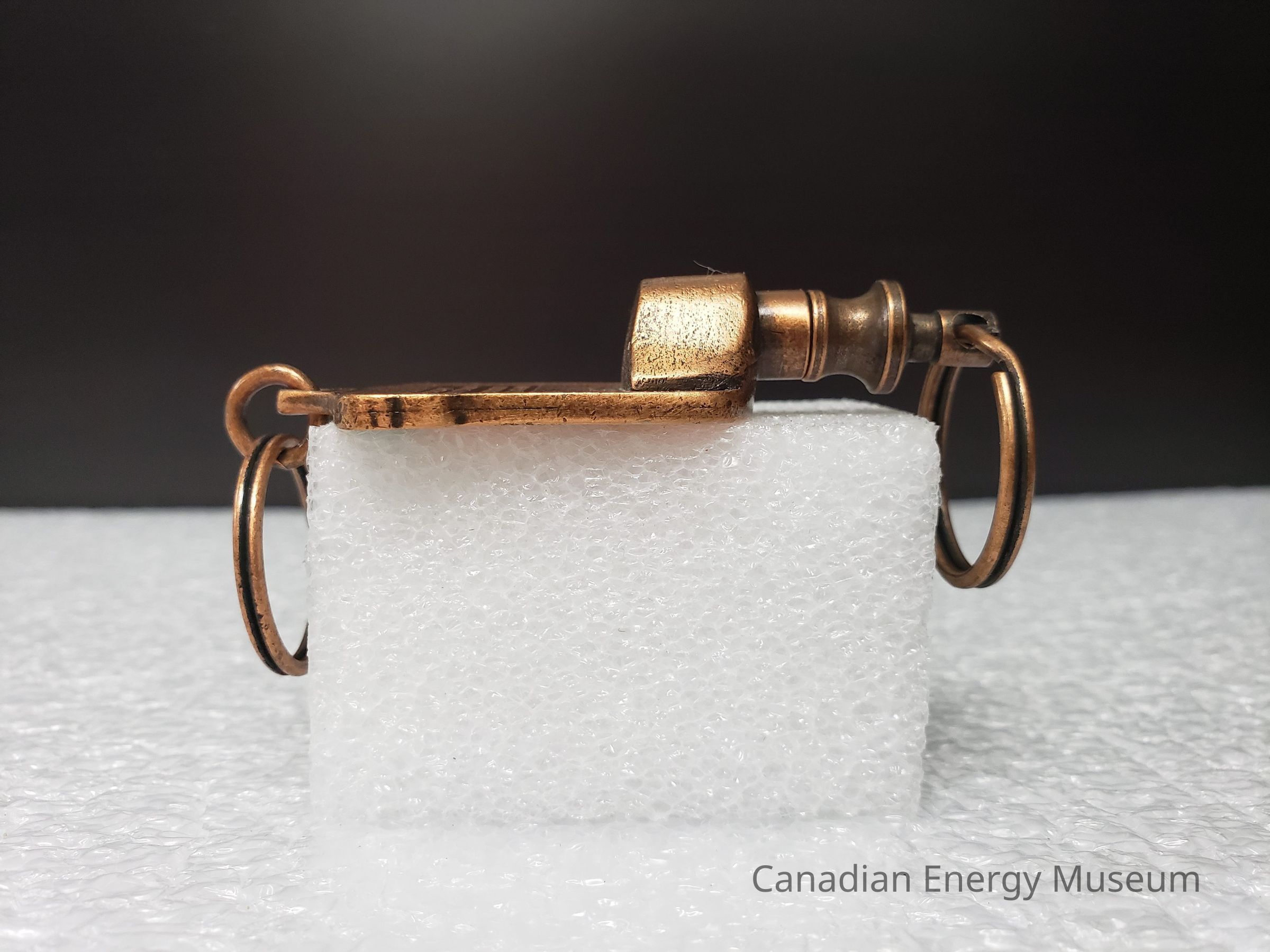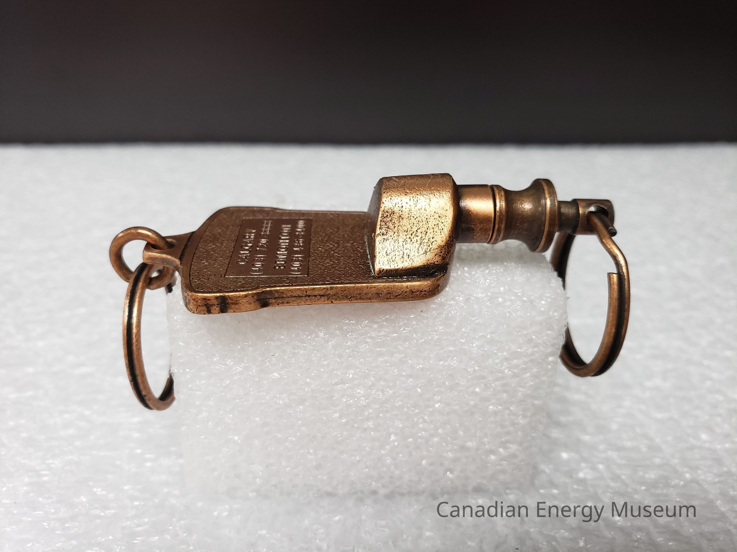 Features: A dual-ended metal keychain, with an antique-copper finish and enamel colour fill (orange and green). The central element is an image of a container of TOPCO's JWW rotary joint compound, coloured in orange, with green text and detailing. Text reads "JWW TOPCO; GREEN-TOP PRODUCTS". At the top of the image is a tab of metal on which the top keyring is attached via a jump ring. At the bottom, attached via the back, is a mechanism with 360-degree rotation and spring compression, to which the keyring is attached with a jump ring. On the back of the keychain, the surface has a micro-dash pattern texture, along with a rectangle surrounding the debossed text "CALGARY; (403)720-3888; EDMONTON; (403) 236-3400".