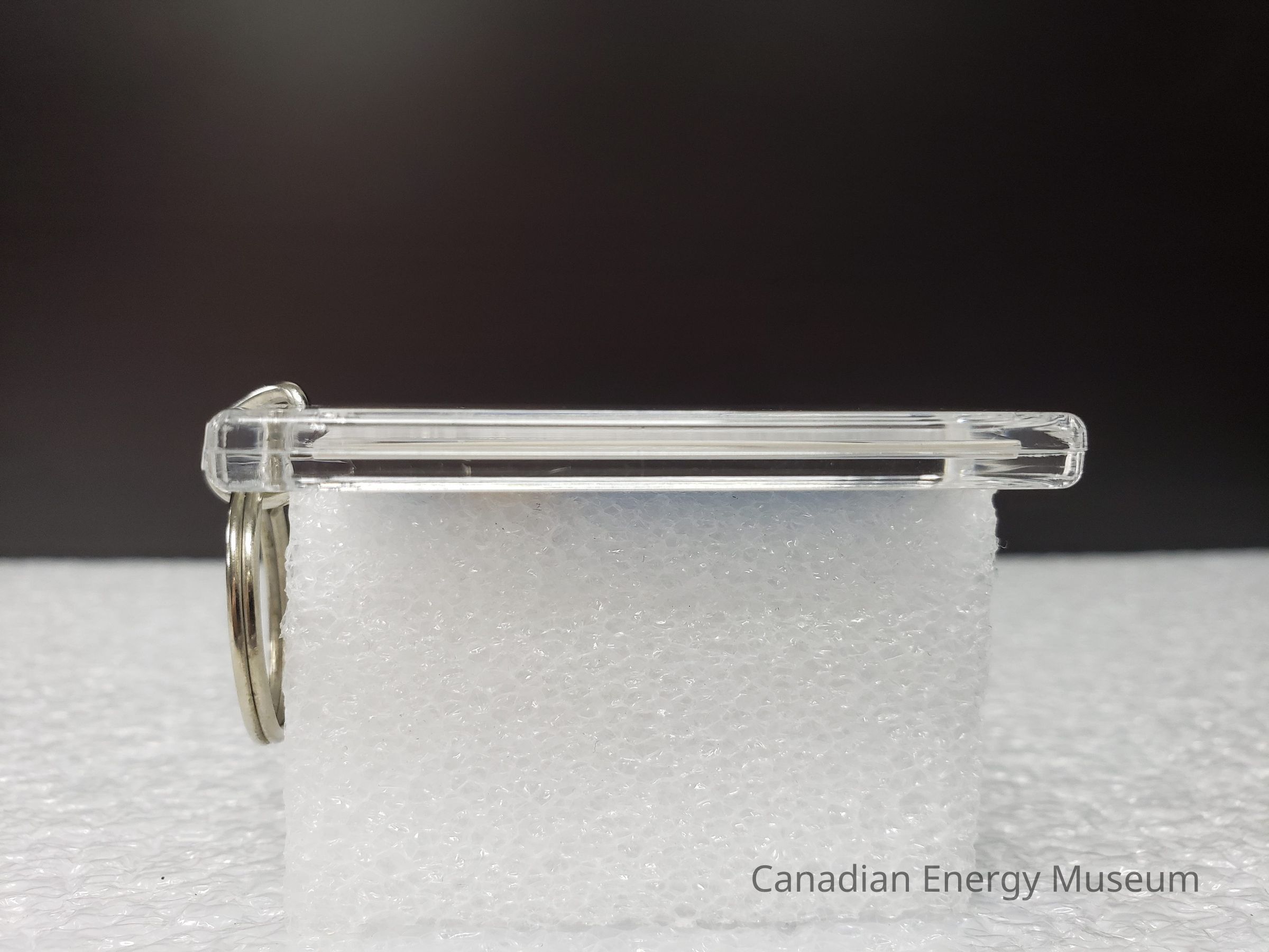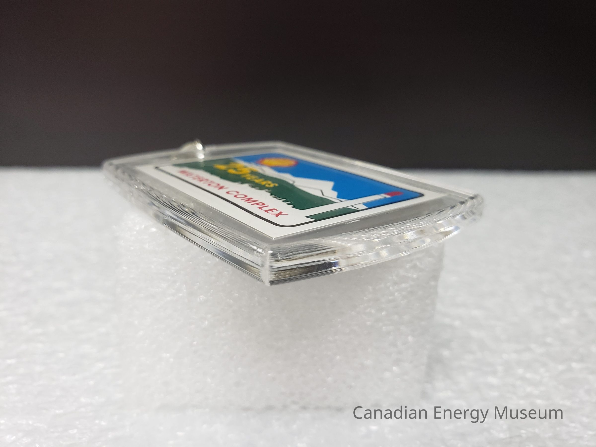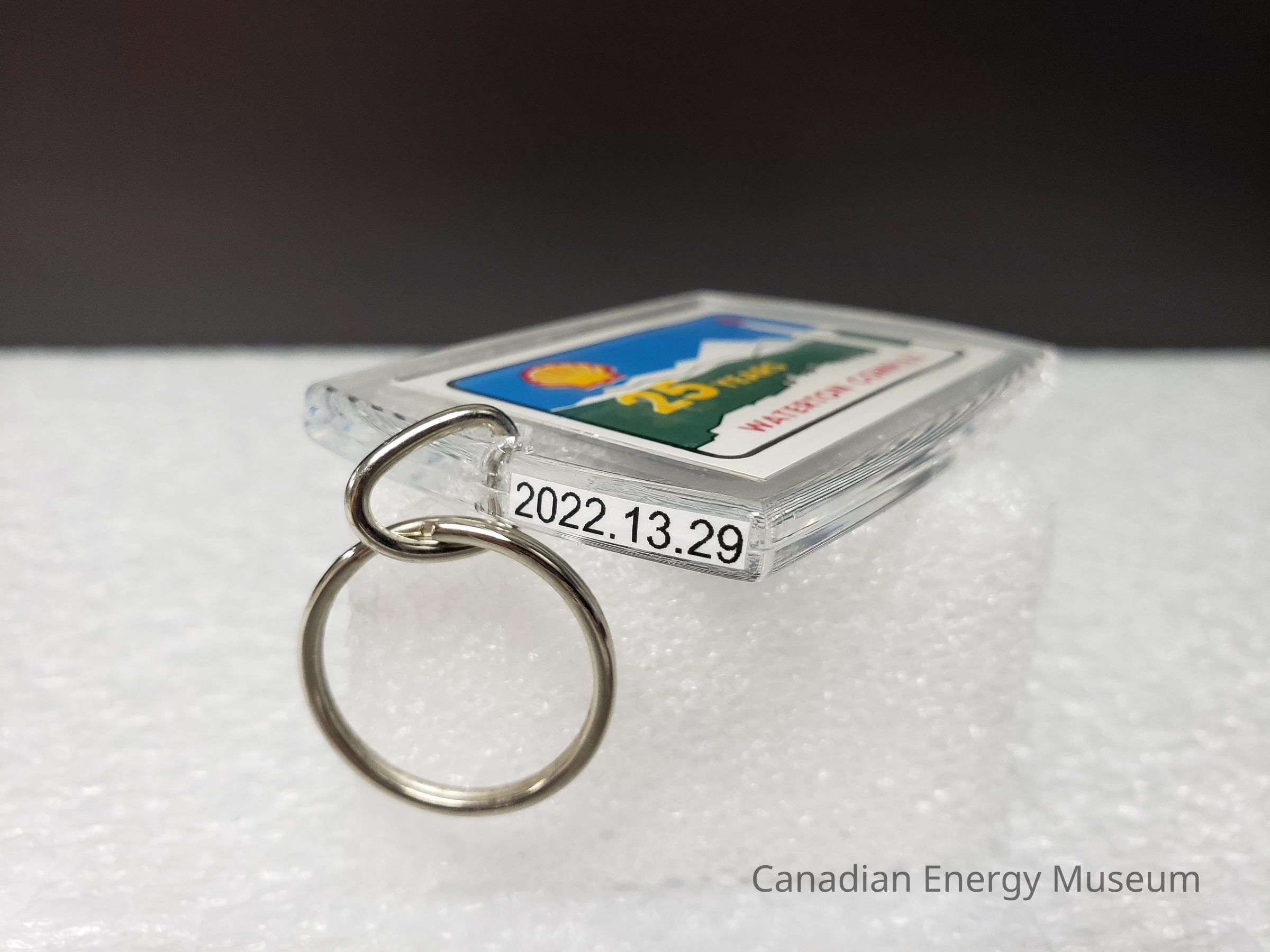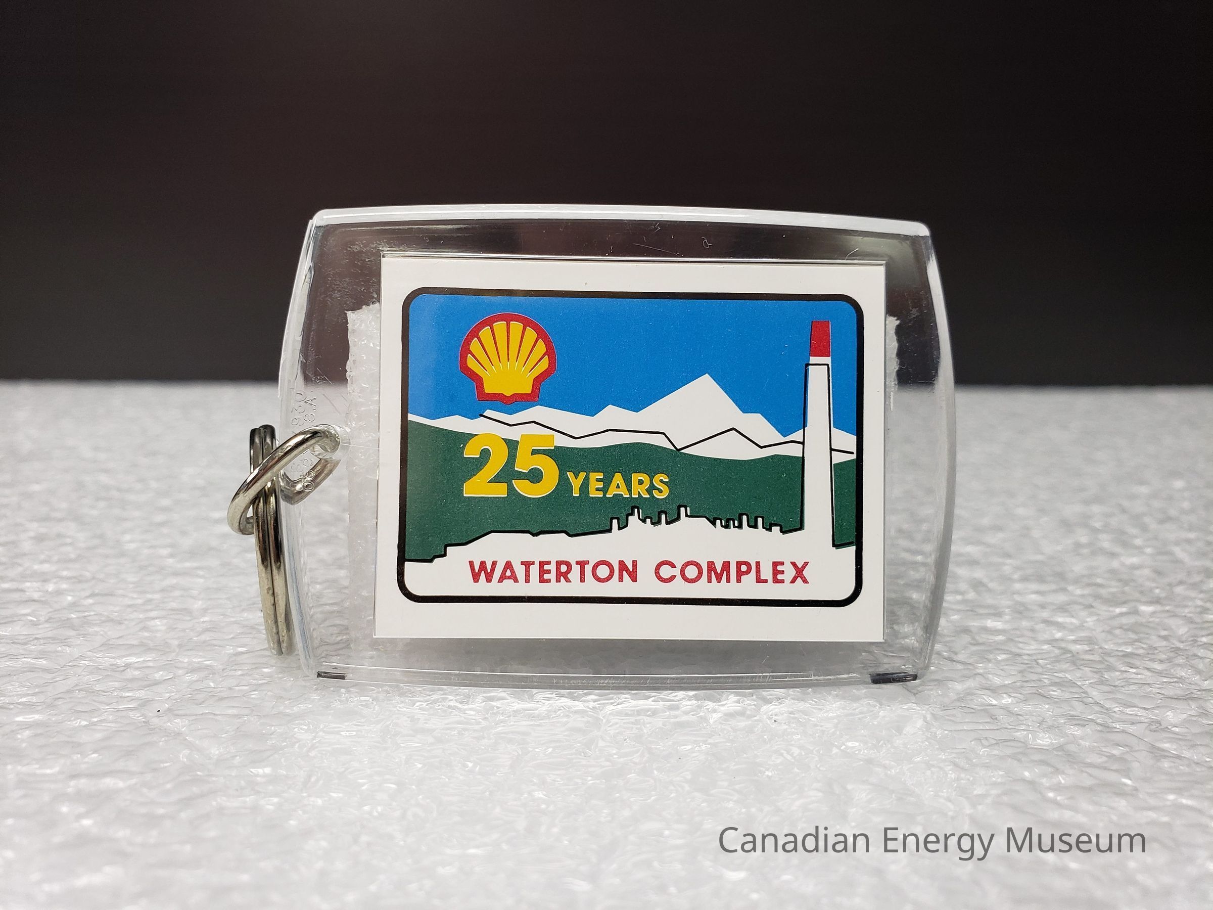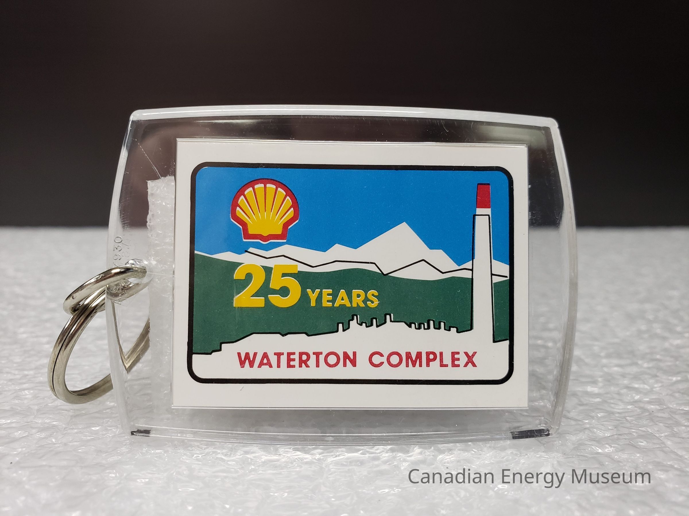 Old Description (Kelsey Steil, 5/24/2022): Keychain with clear rectangular plastic fob. Inside is an illustration of a gas plant in front of a green field with mountains in the background. On the left is the logo for Shell. Below in yellow reads: 25 Years. In red text at bottom reads: Waterton Co.Collection