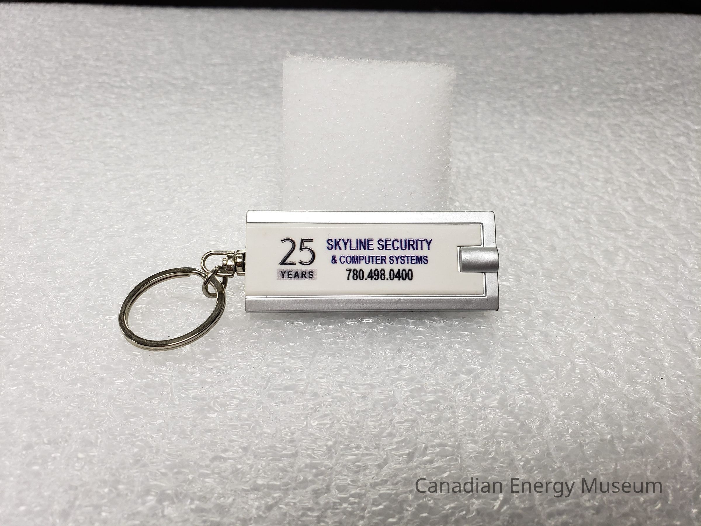 Features: A narrow, rectangular fob with a built-in LED light turned on by a button on the bottom. Fob is plastic, white with silver color around the edges and on the button. On the front is the center is the printed text in blue: "SKYLINE SECURITY & COMPUTER SYSTEMS", below is black text: "780.498.0400". To the left is a stylized "25" with a grey rectangle and black word "YEARS" underneath. Connected on the left is a swivel attachment and keyring.Collection