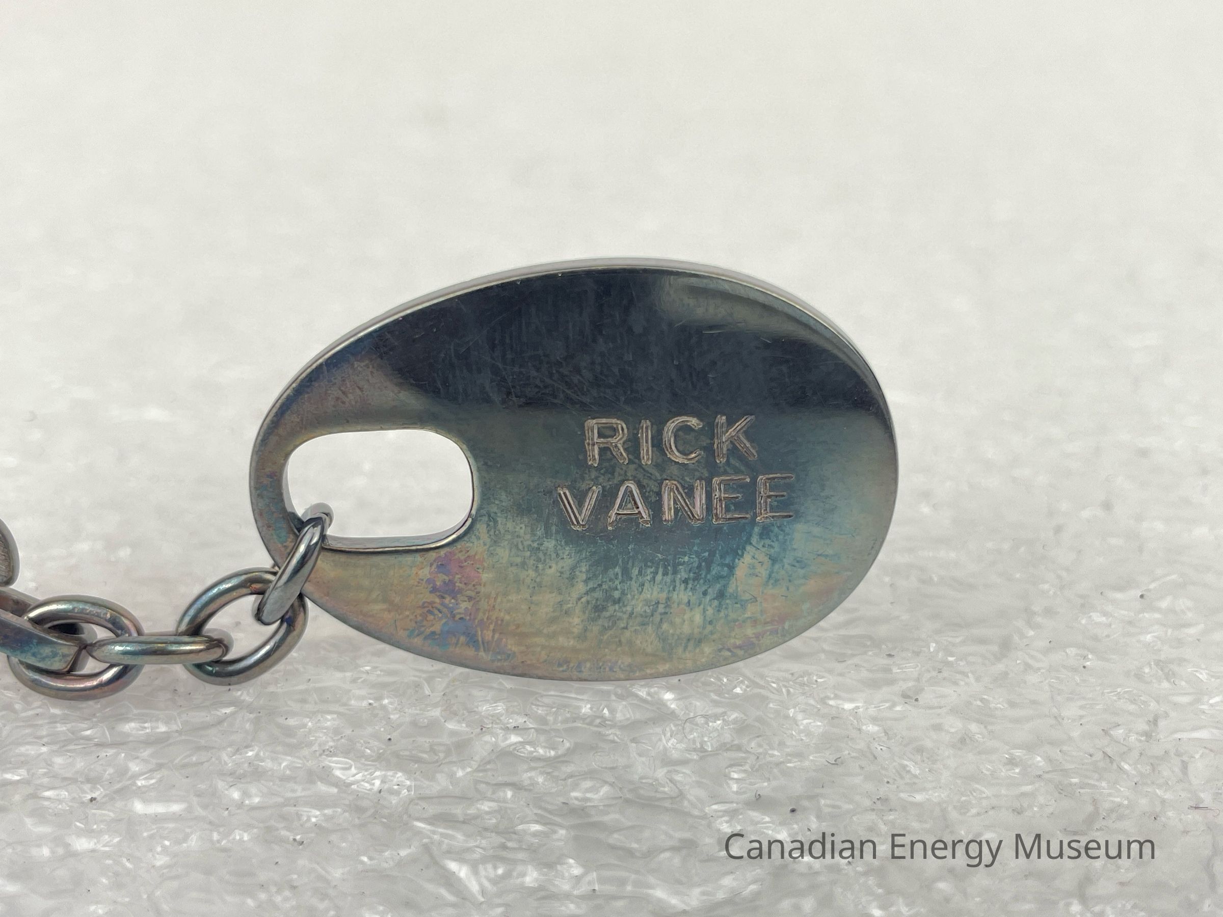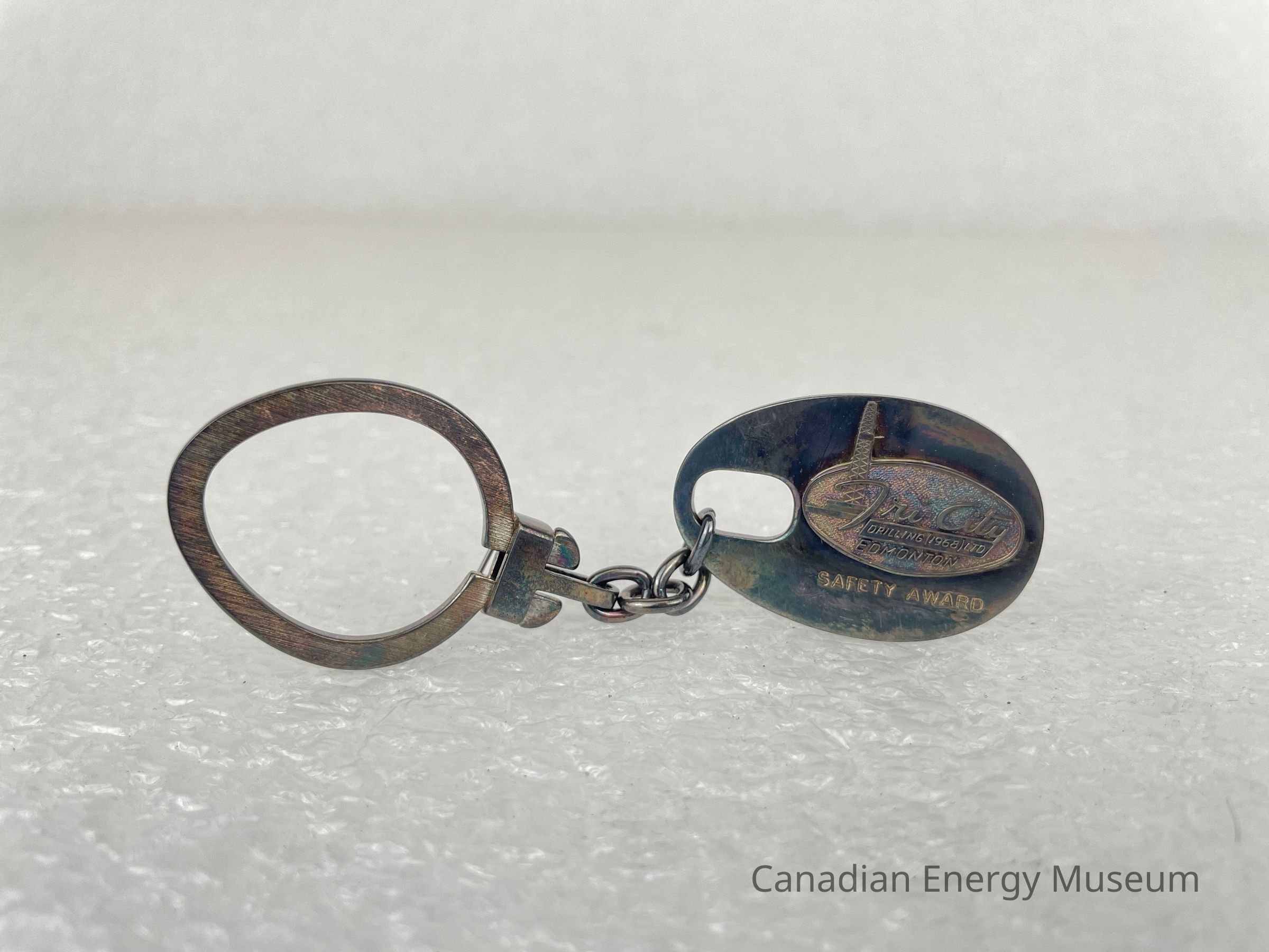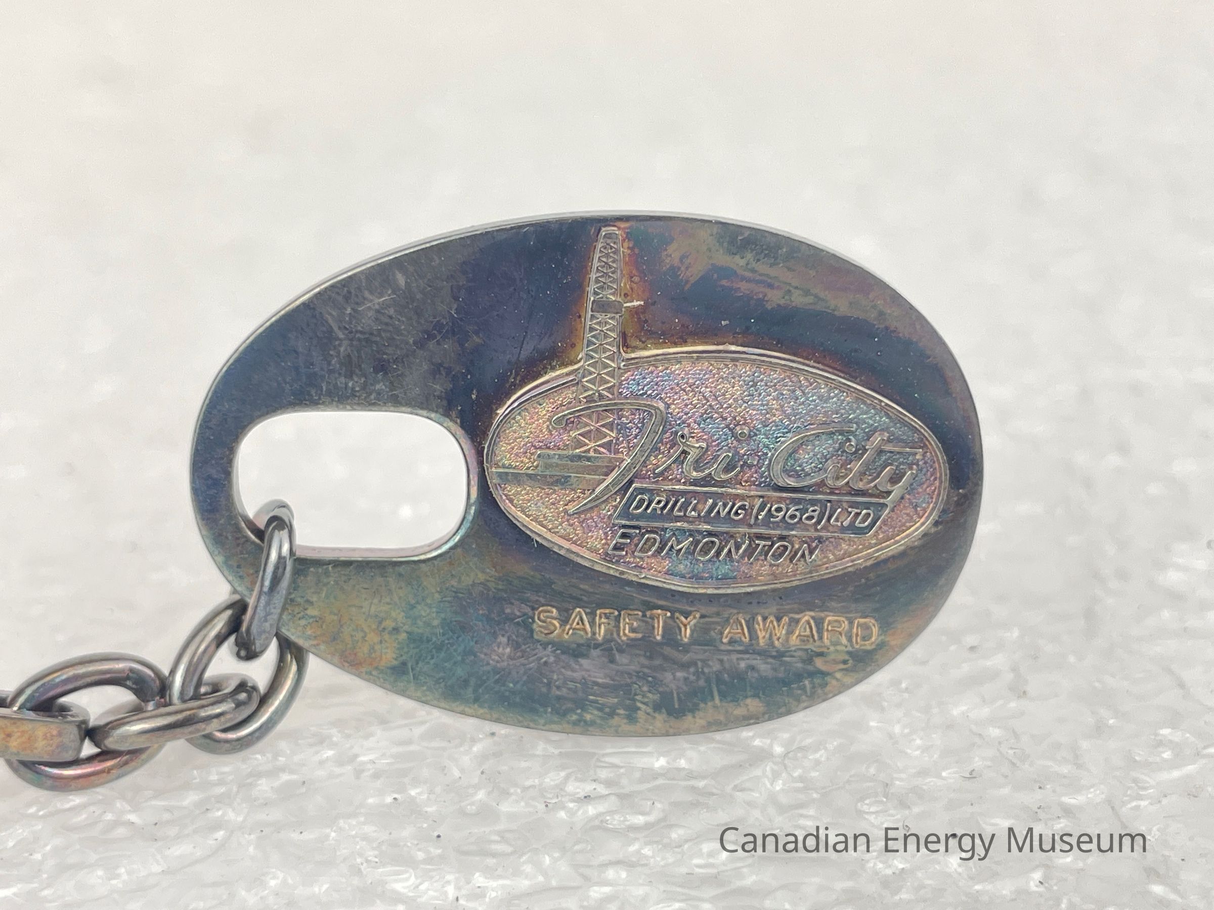 Description: An oval-shaped metal fob on a keychain. The fob is a silver-coloured metal, with a large, rounded rectangle cut-out for the keychain attachment. The fob displays a metal logo for Tri-City Drilling (1968) Ltd and features stylized text, "Tri-City" with the tail of the "y" creating a slanted rectangle displaying text, "DRILLING 1968 LTD." An oil derrick is layered underneath the "T" in "Tri-City". Underneath the metal logo is text etched into the fob reading, "SAFETY AWARD". The back of the fob features etched text reading, "RICK VANEE".