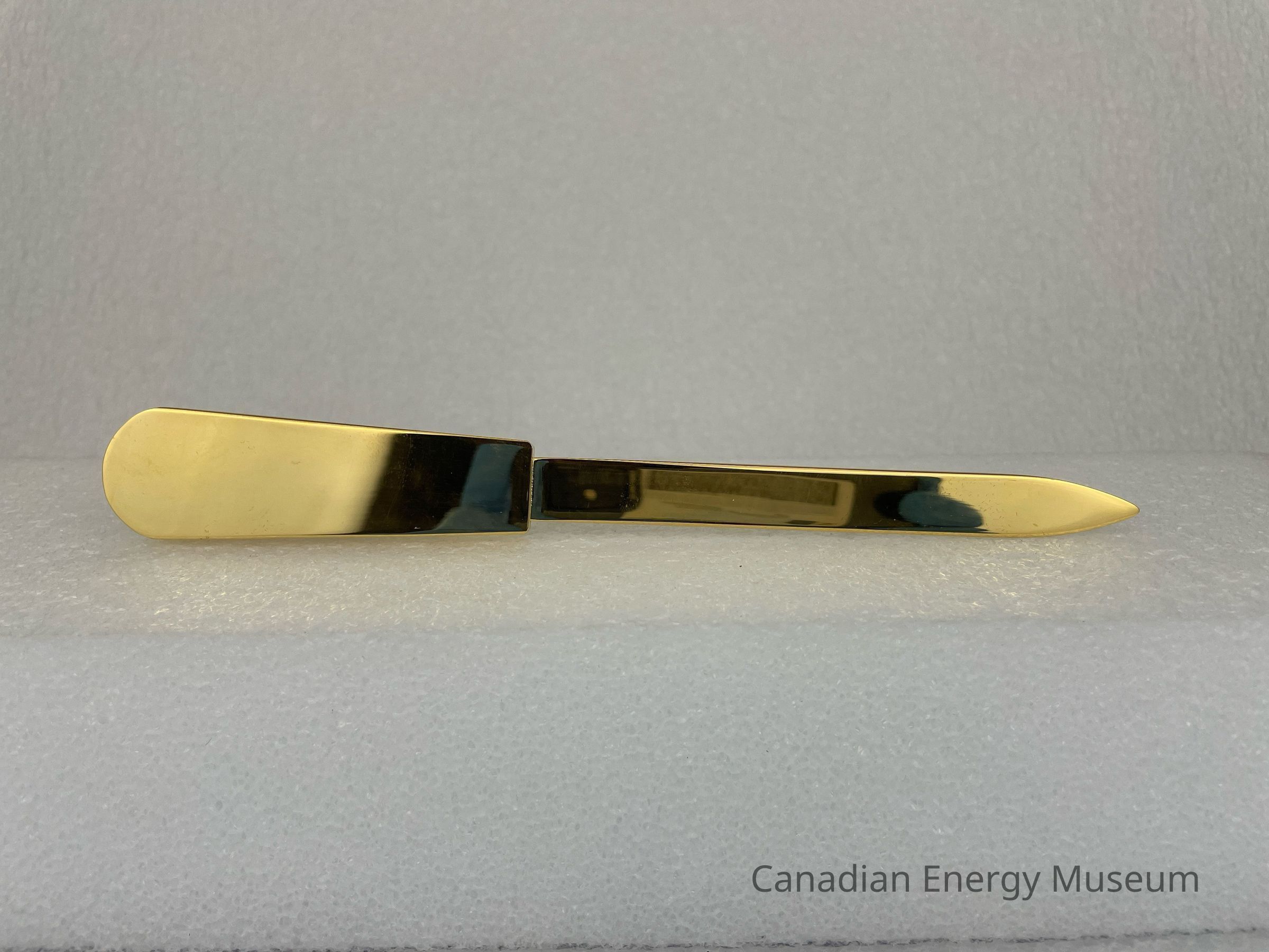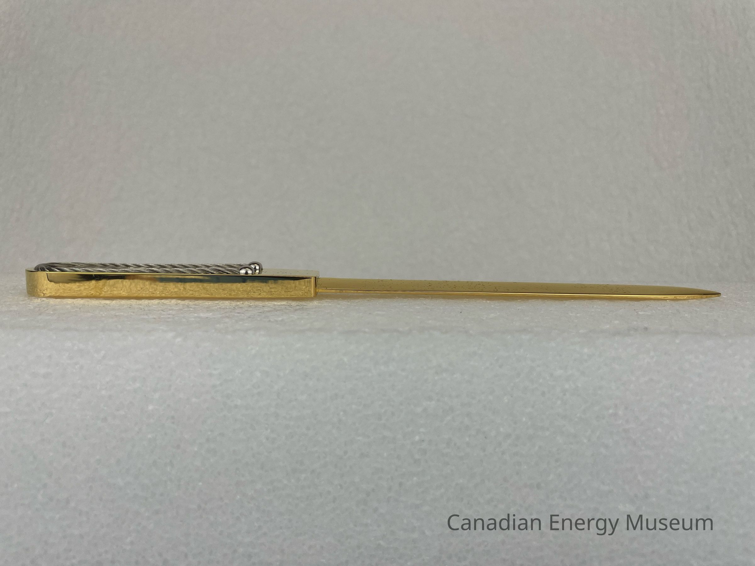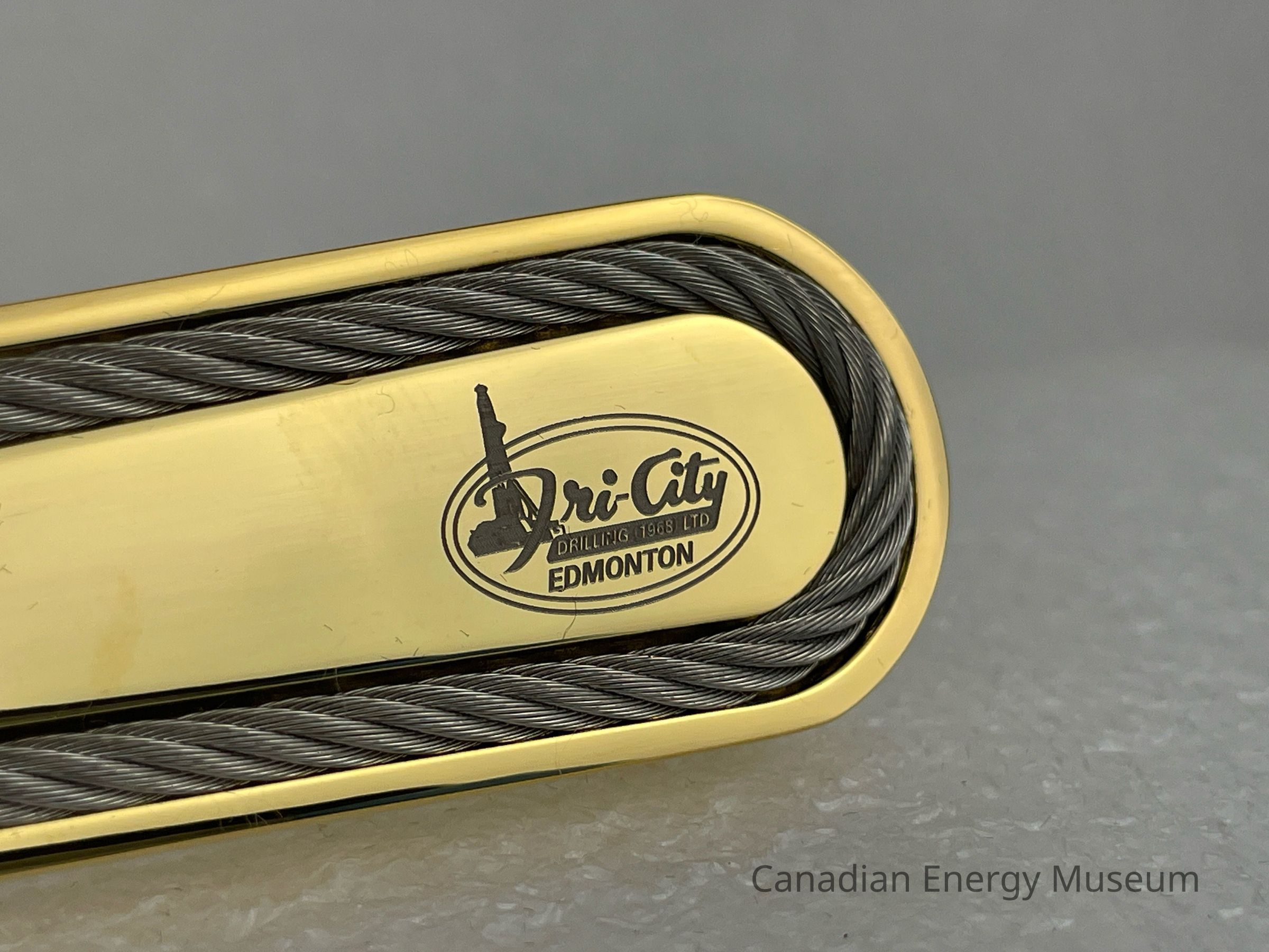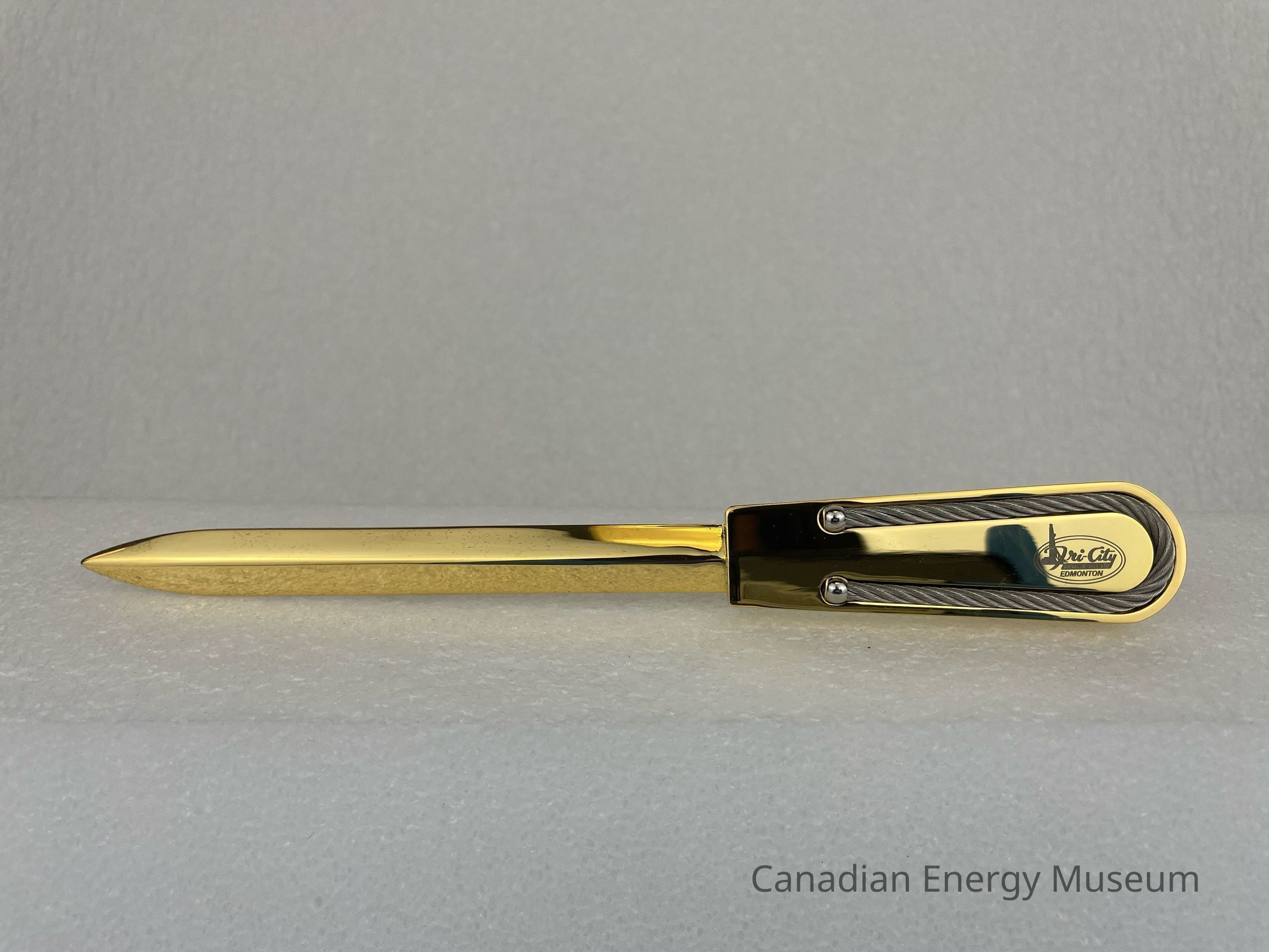 Features: Long, narrow, double-edged blade. The handle is solid gold-coloured metal with a solid braided wire rope with a ball on each end. The wire is shaped to fit around the border of the top face of the handle. At the end of the handle is a small etched logo branded to Tri-City Drilling (1968) Ltd. The logo features stylized text, "Tri-City" with the tail of the "y" creating a slanted rectangle displaying text, "DRILLING 1968 LTD." An oil derrick is layered underneath the "T" in "Tri-City". The bottom face of the letter opener is blank, and the blade is flat.