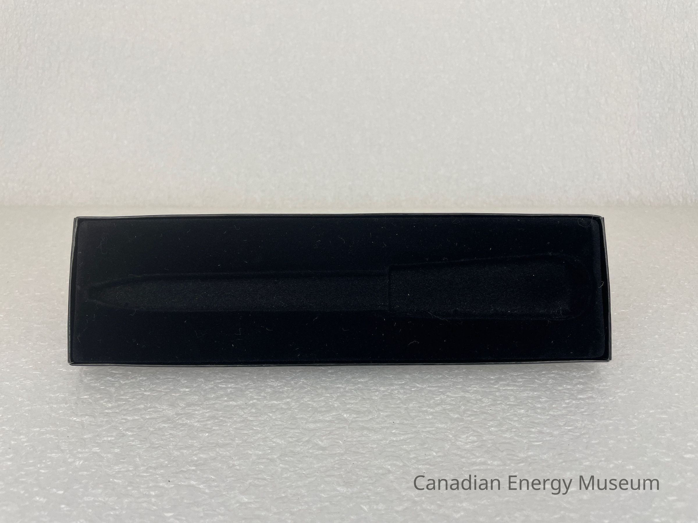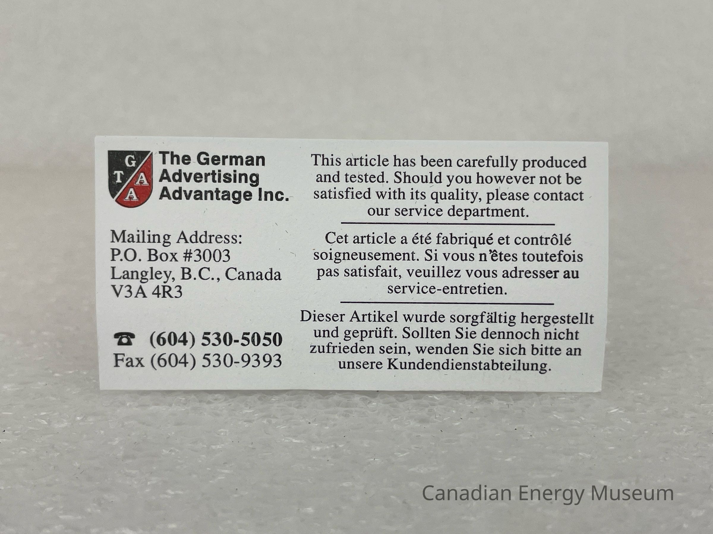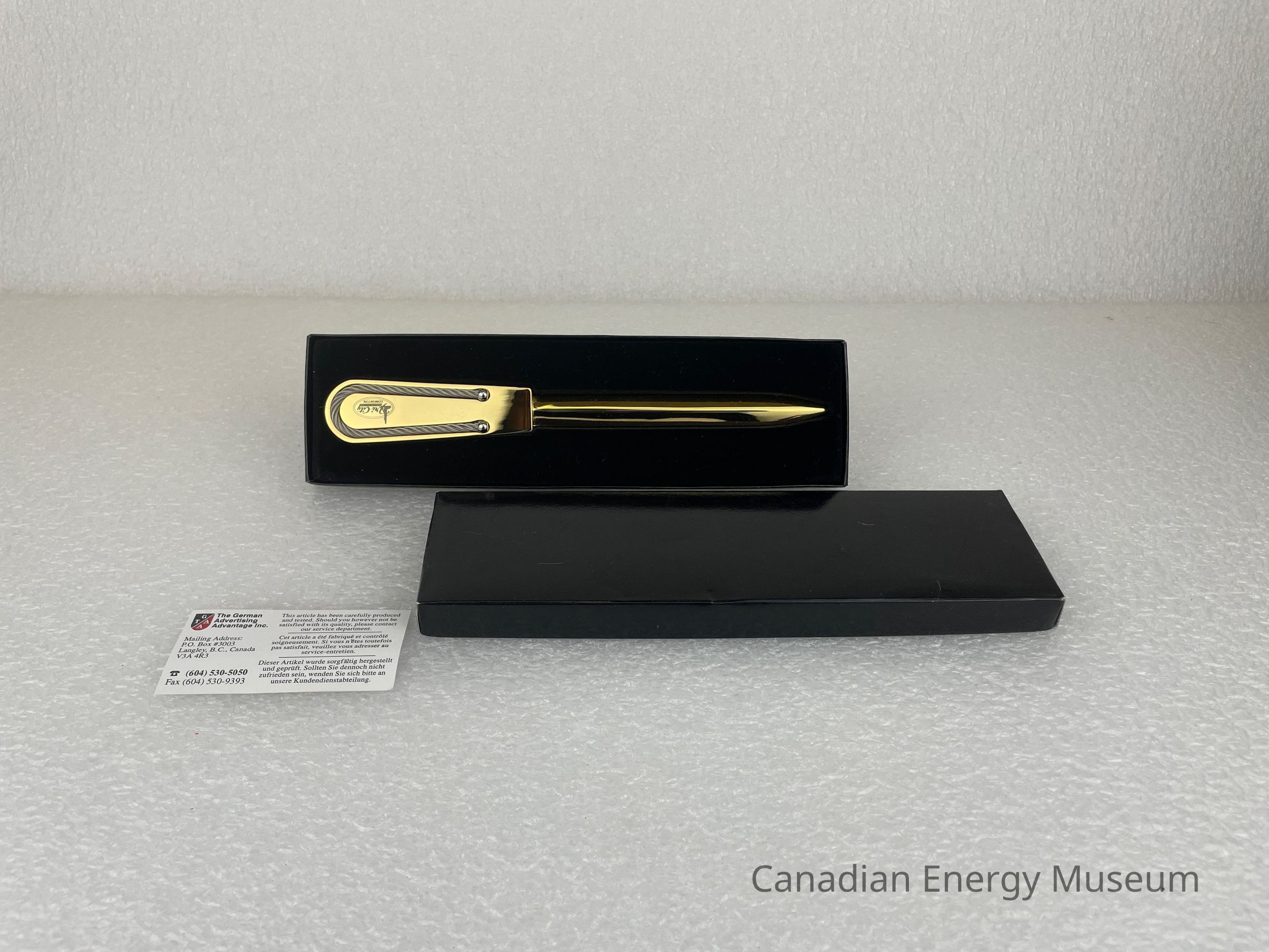 The letter opener is kept within a black cardboard box with a moulded velvet interior. A rectangular piece of paper featuring a white background and black text is placed inside the box. The top left of the paper features a small crest that is split diagonally into two colours; black and red, with the gold side featuring white text, "T G" and the white side with gold text, "A A". Next to the crest is black text reading, "The Germna Advertising Advantage Inc." The paper also contains information on the address, phone number and fax.Collection